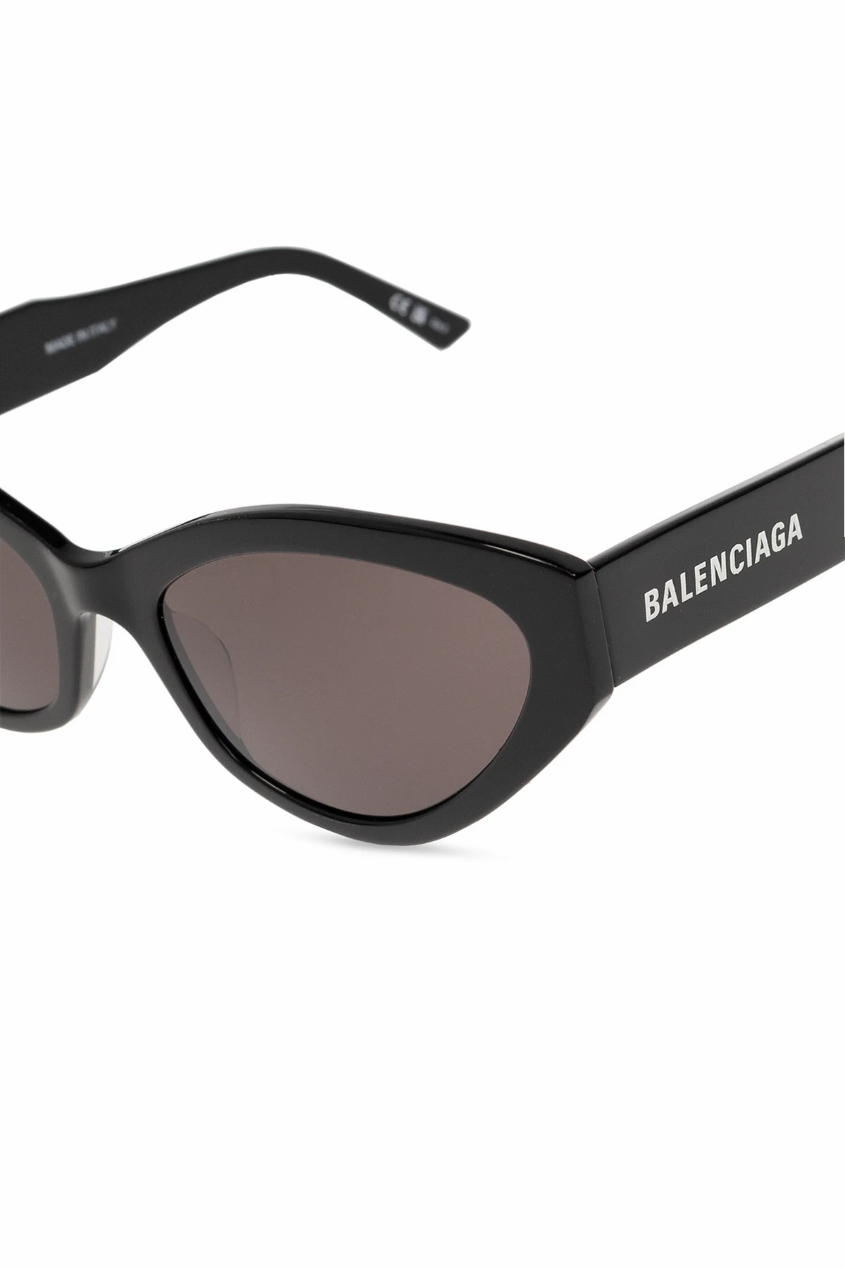 Czarne okulary przeciwsłoneczne, model ‘Flat’ Balenciaga. Oprawki w kształcie kocich oczu. Z boku ozdobione białym logo. Szare soczewki ze 100% ochroną przed promieniowaniem UV. Dołączone etui.