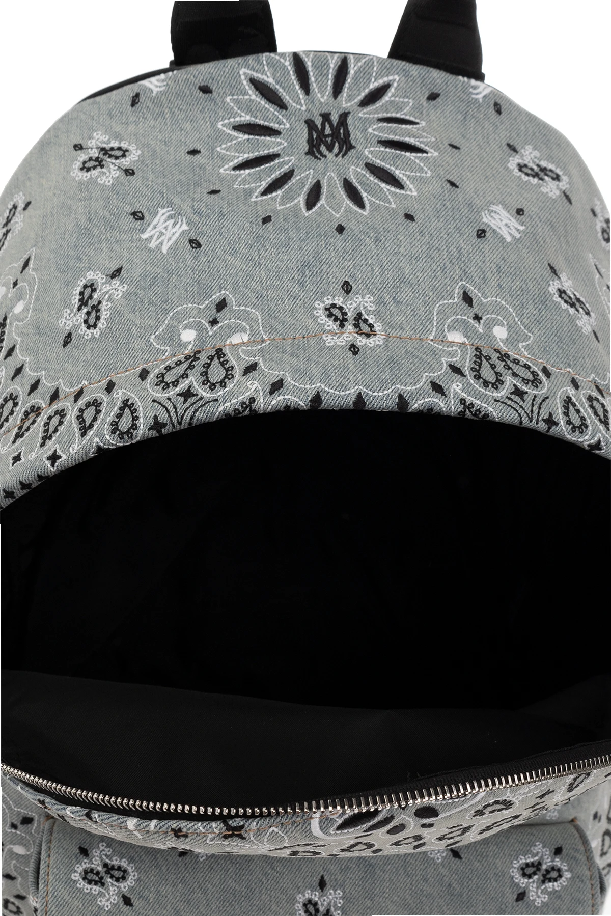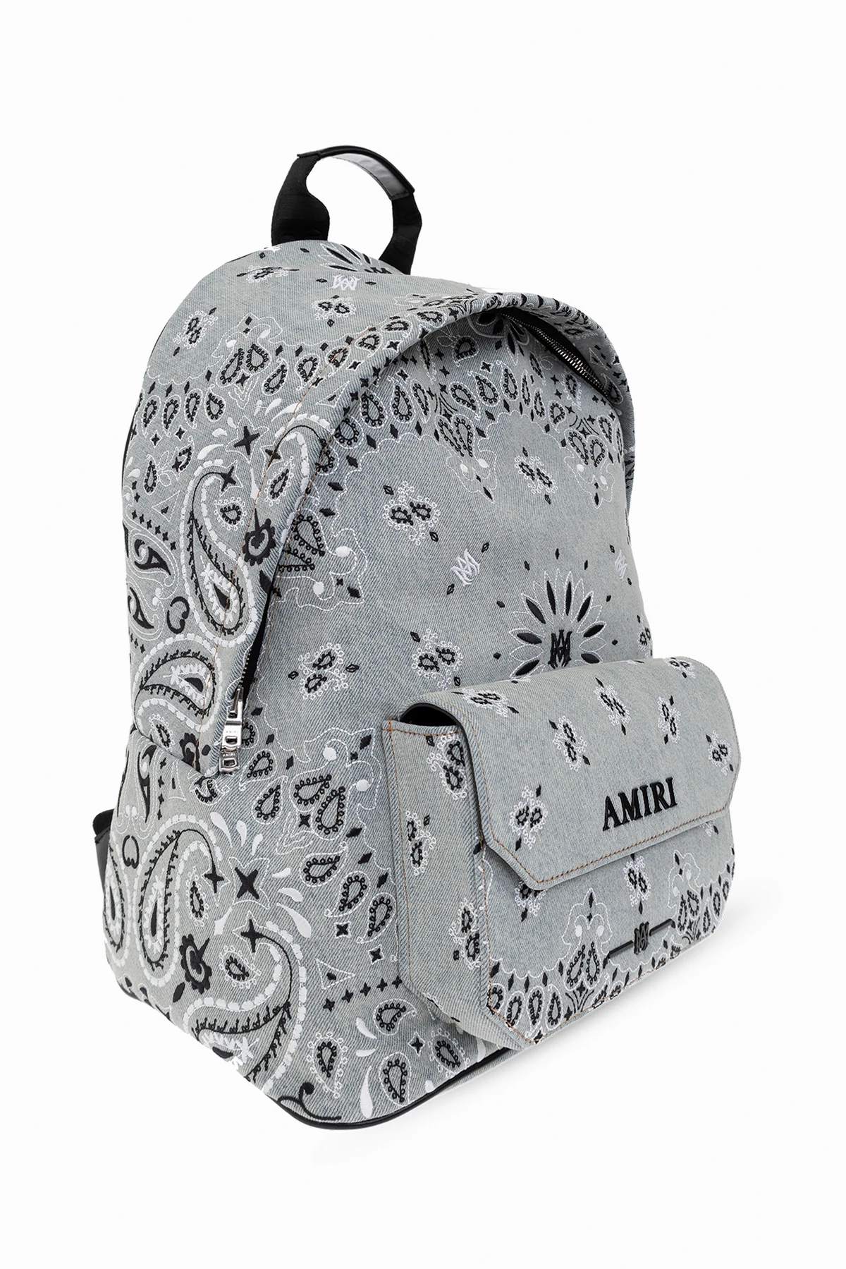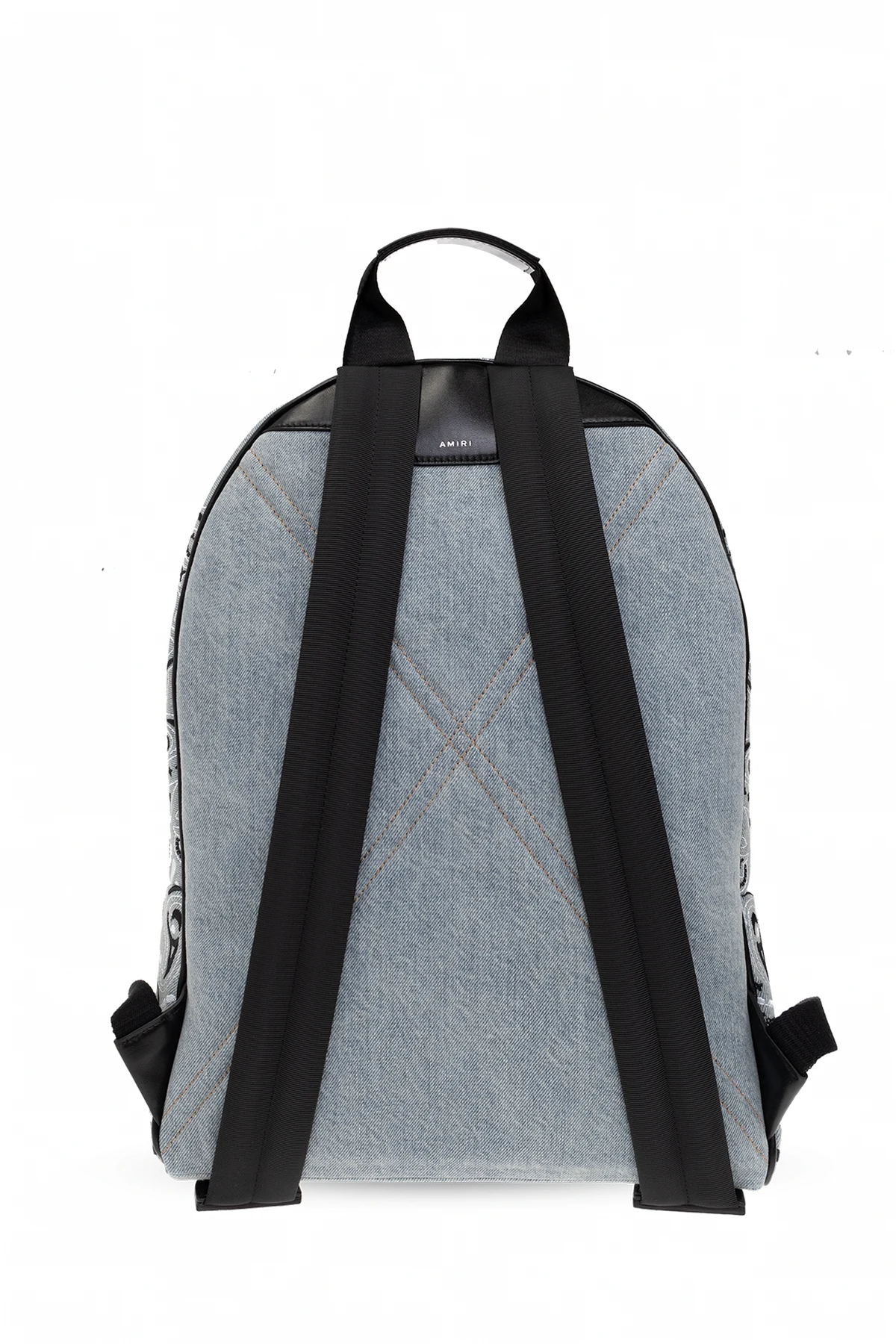 Szaroniebieski, jeansowy plecak Amiri. Wykonany z bawełny. Dwubiegunowe zamknięcie na zamek. Ozdobione wyszytym wzorem w kolorze biało-czarnym z motywem ‘paisley’. Z przodu kieszeń zamykana na zamek. Półokrągła rączka. Szelki z możliwością regulacji długości. Z przodu kieszeń z patką. Wewnątrz komora oraz dwie kieszenie: wsuwana i zamykana na zamek. Metalowe wykończenie w kolorze srebrnym.