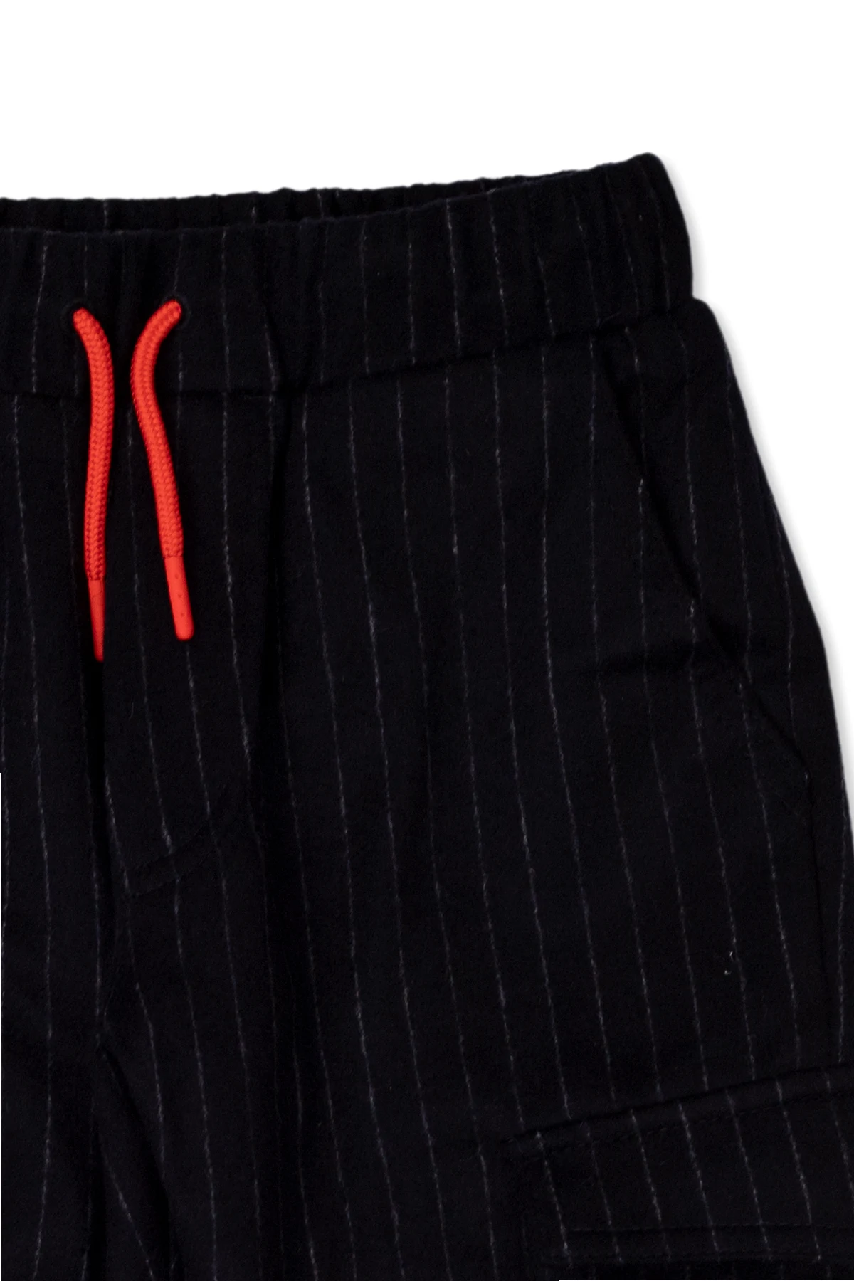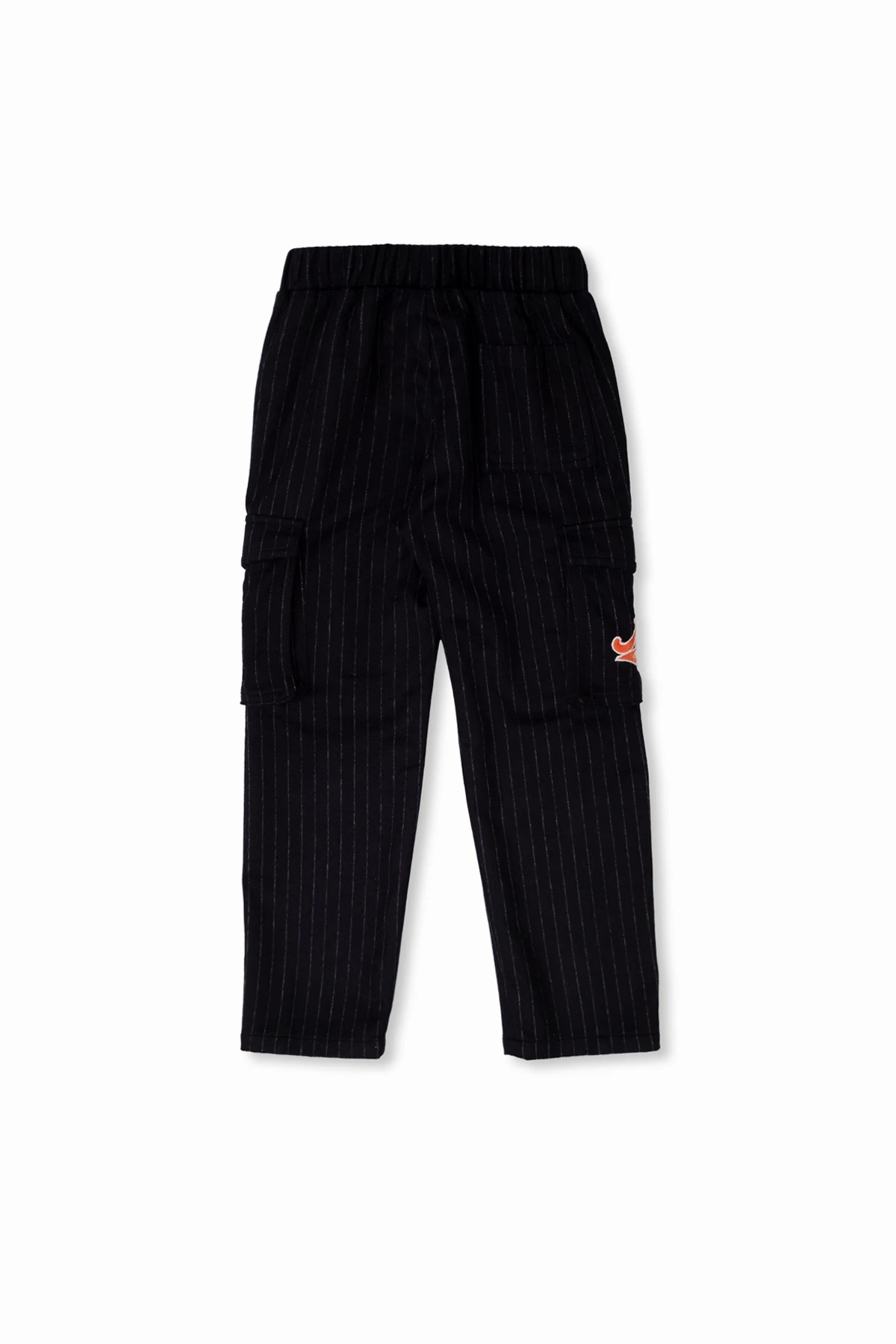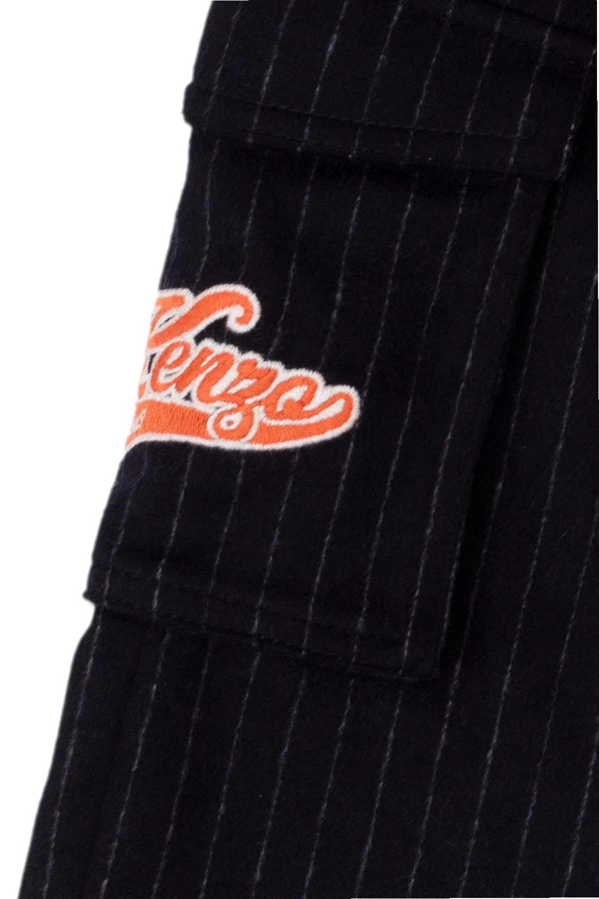 Granatowe spodnie Kenzo Kids. W pasie wszyta guma ściągana trokami. Ozdobione wzorem w prążki i kolorowymi naszywkami z motywem logo. Pięć kieszeni: trzy wsuwane oraz dwie z patkami. Długie nogawki.