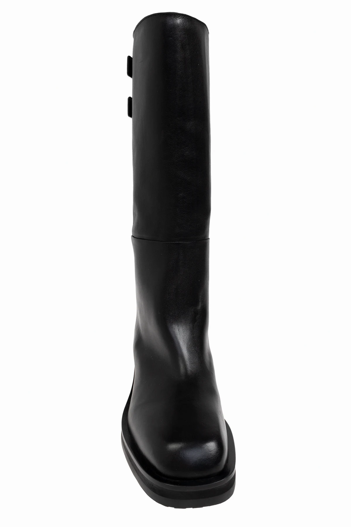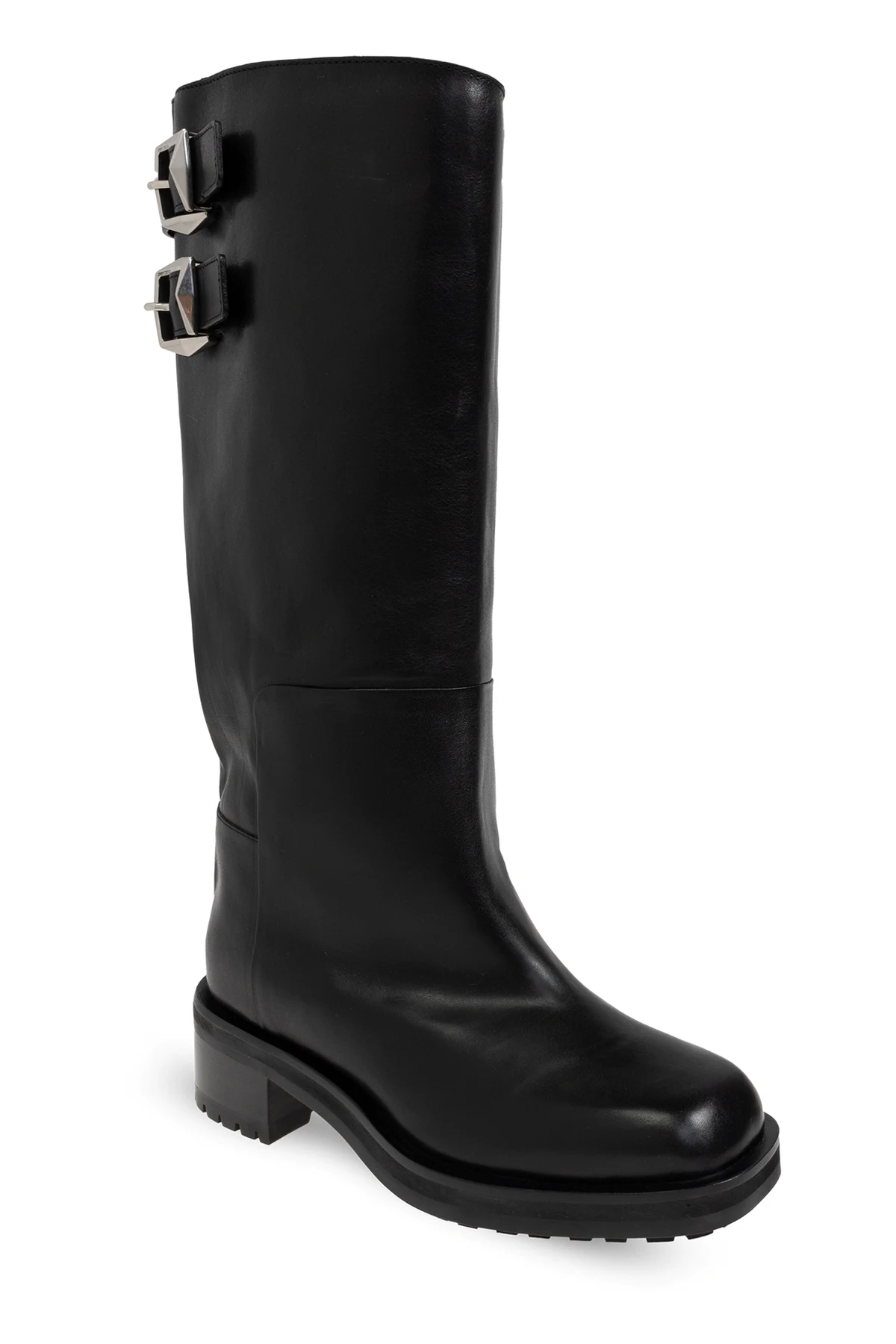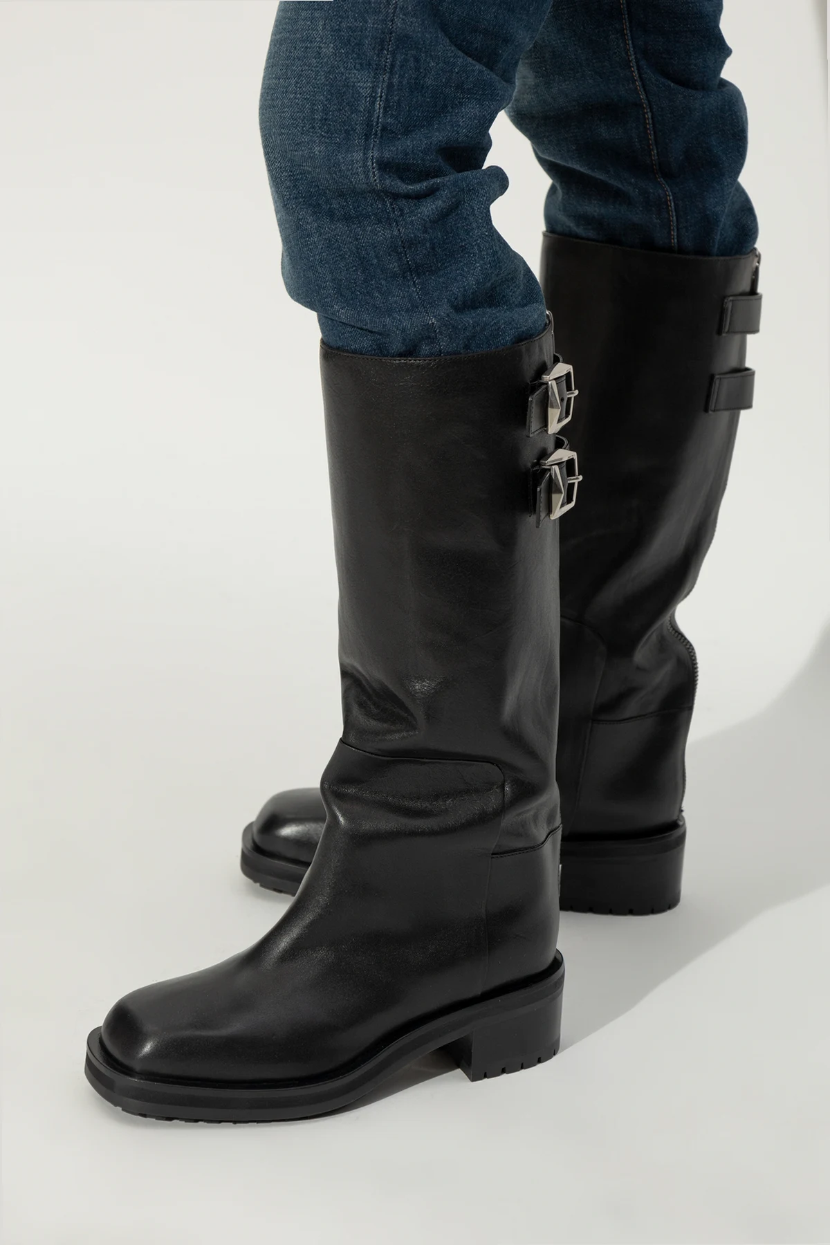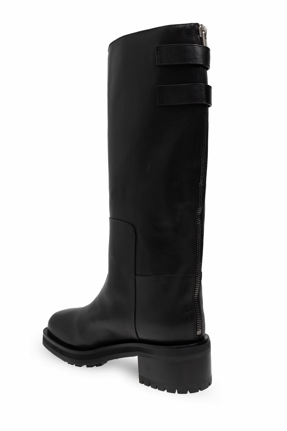 Buty charakteryzują się jednolitym, czarnym kolorem oraz prostą cholewką sięgającą kolan, zakończoną dwoma ozdobnymi paskami z srebrnymi klamrami. Zaokrąglony nosek dodaje im subtelnej elegancji, a zamek błyskawiczny umieszczony na tylnej części cholewki ułatwia ich zakładanie.