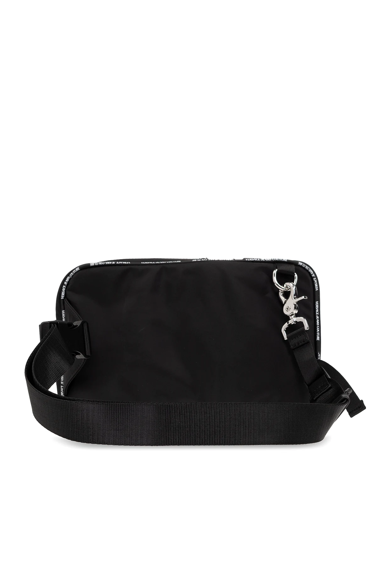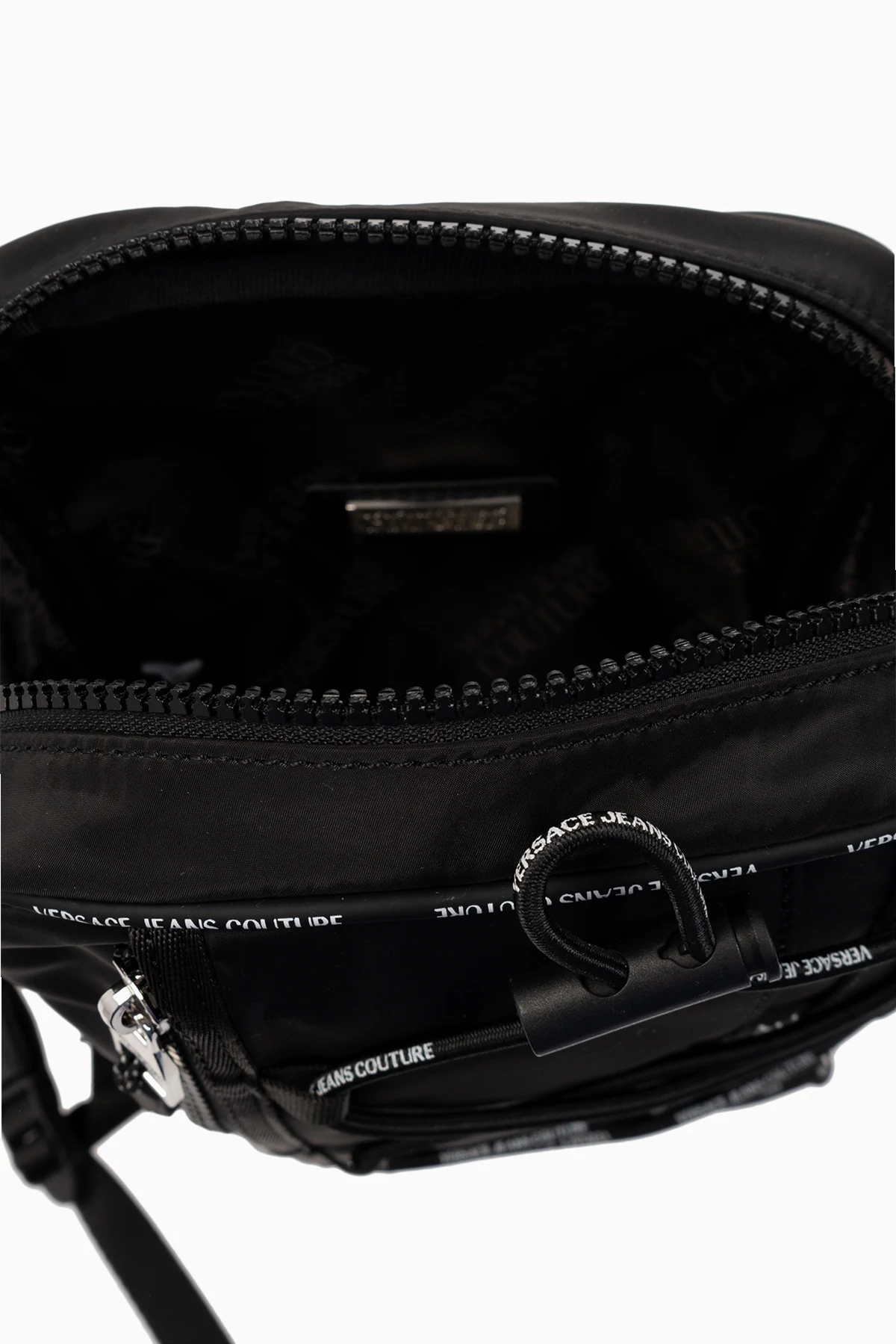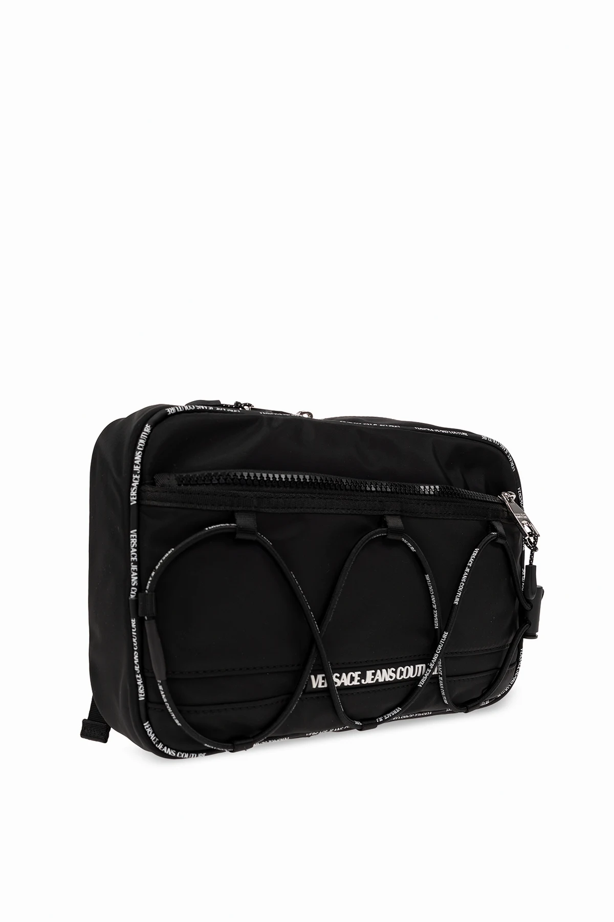 Czarny plecak na jedno ramię Versace Jeans Couture. Zamykany na zamek. Dekoracyjne sznurowanie. Ozdobiony logo. Z przodu kieszeń zamykana na zamek. Regulowana szelka. Wewnątrz komora i wsuwana kieszeń. Metalowe wykończenie w kolorze srebrnym.