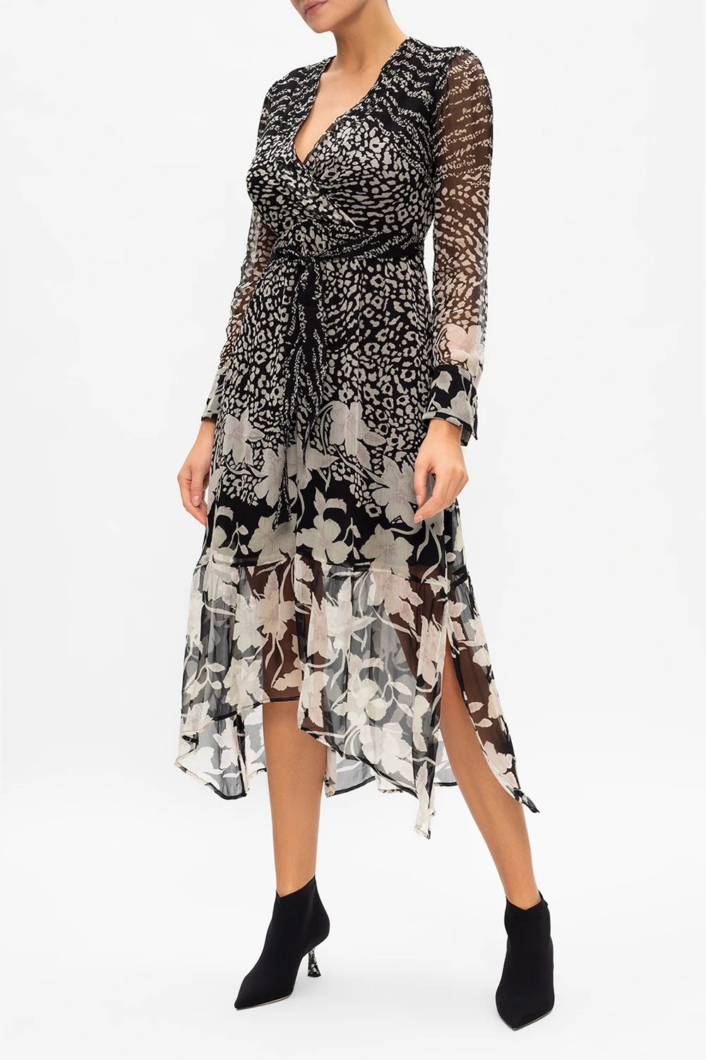 Czarne botki ze skarpetą, model ‘Saber’ Jimmy Choo. Ozdobione aplikacją z logo. Dekoracyjny, czarno-szary obcas. Beżowa, skórzana podeszwa.