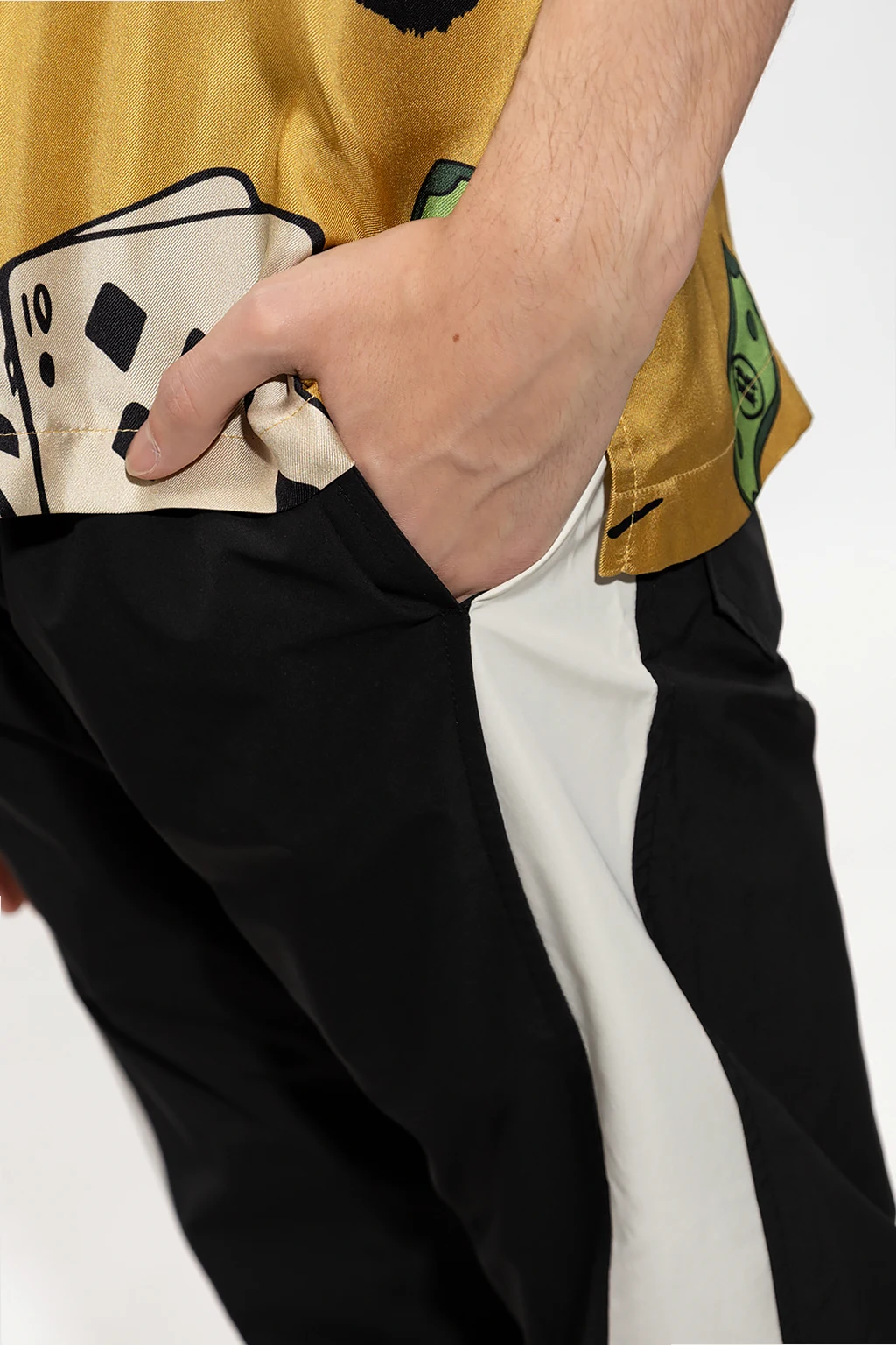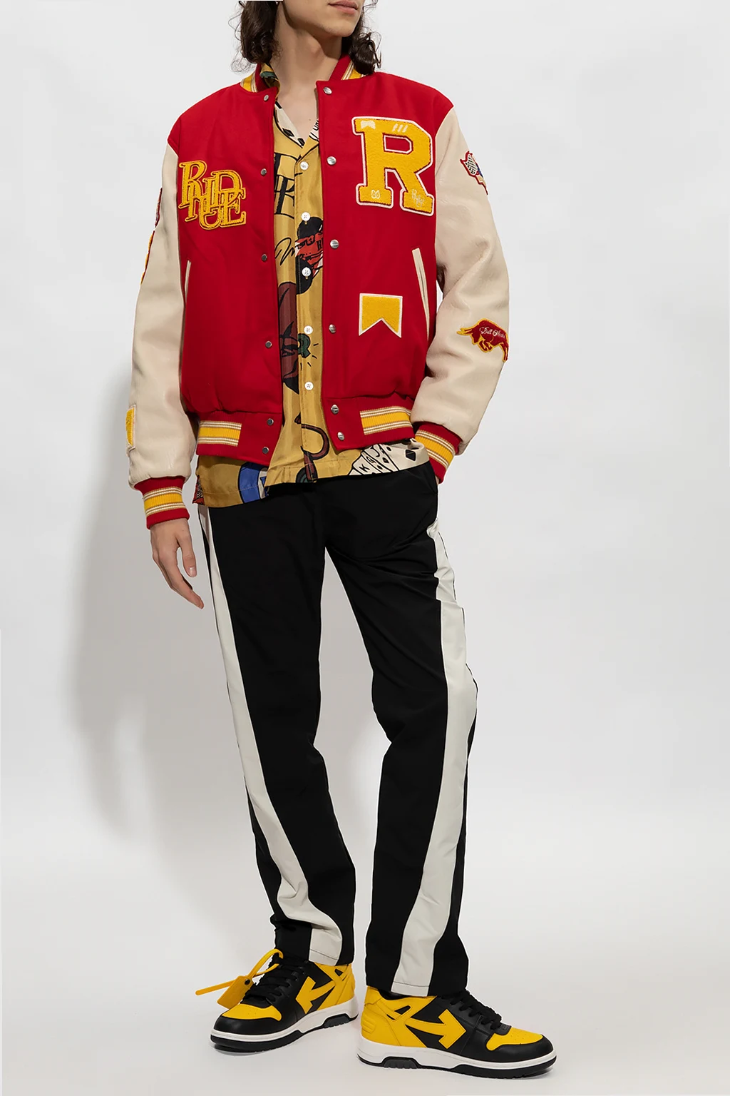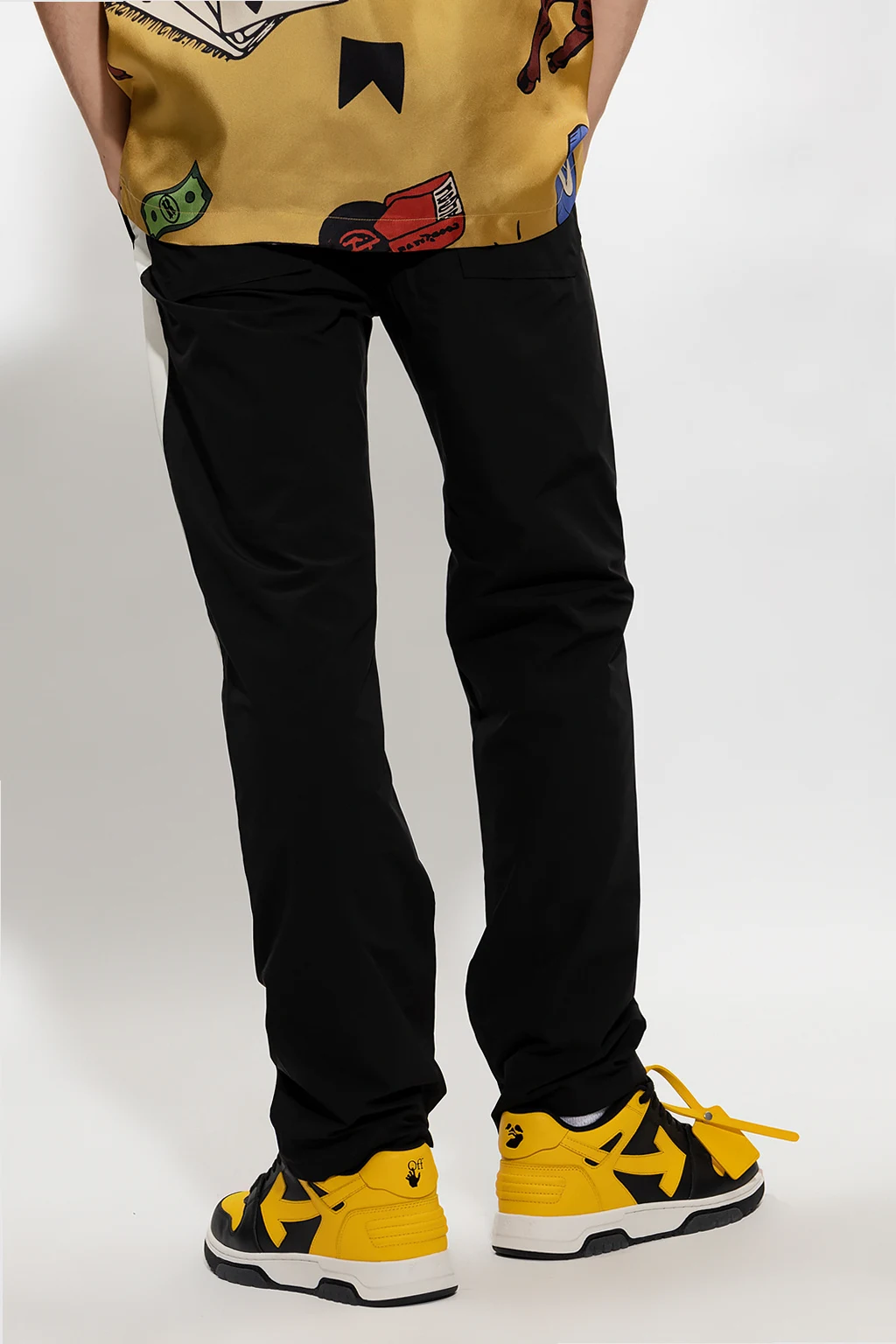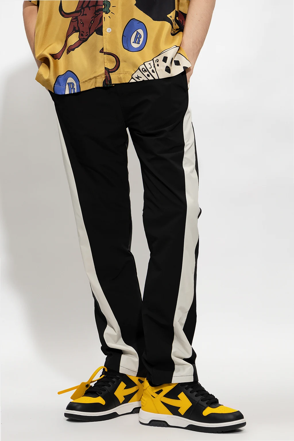 Czarno-biało-pomarańczowe spodnie ortalionowe Rhude. W pasie ściągane trokami. Cztery kieszenie: dwie z przodu i dwie z tyłu - na jednej naszywka z logo. Lekko zwężane nogawki.