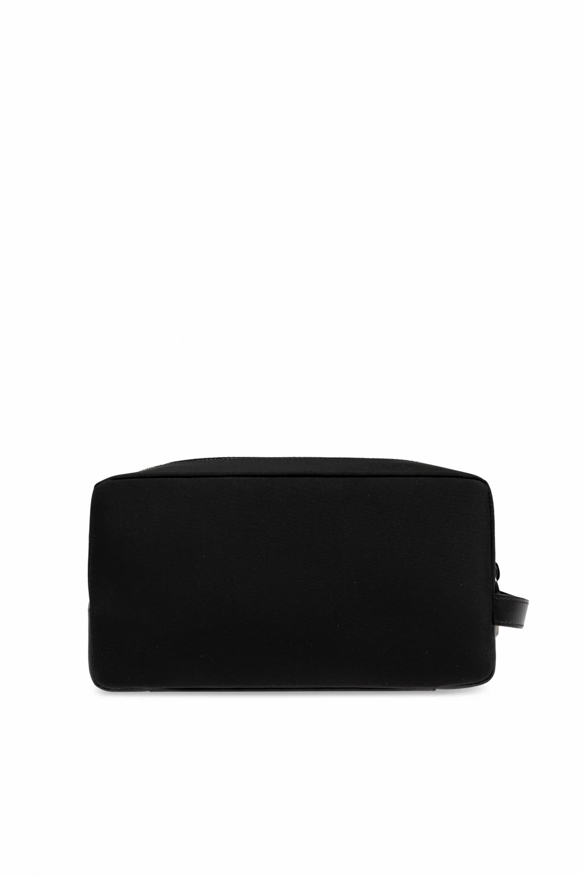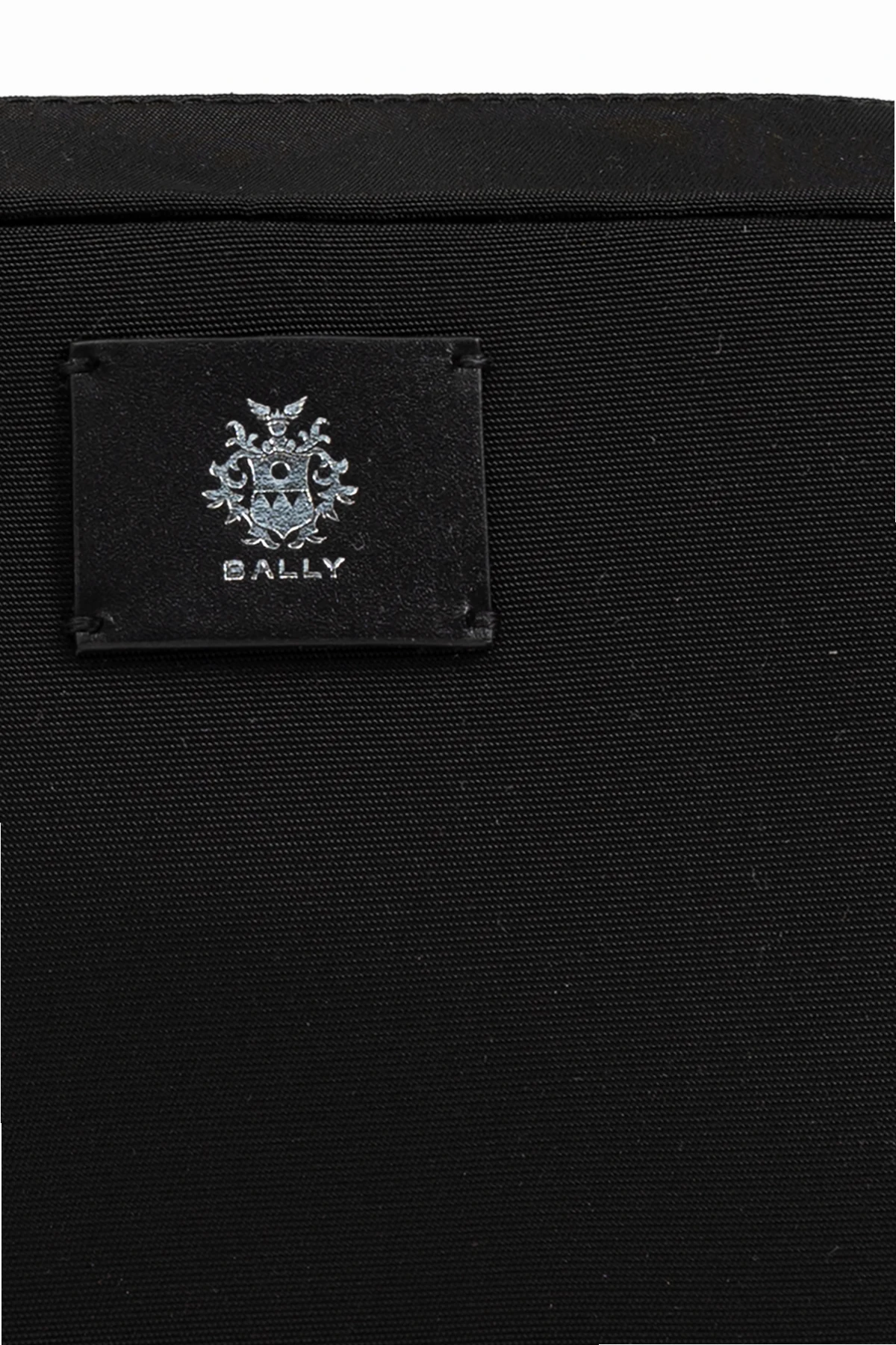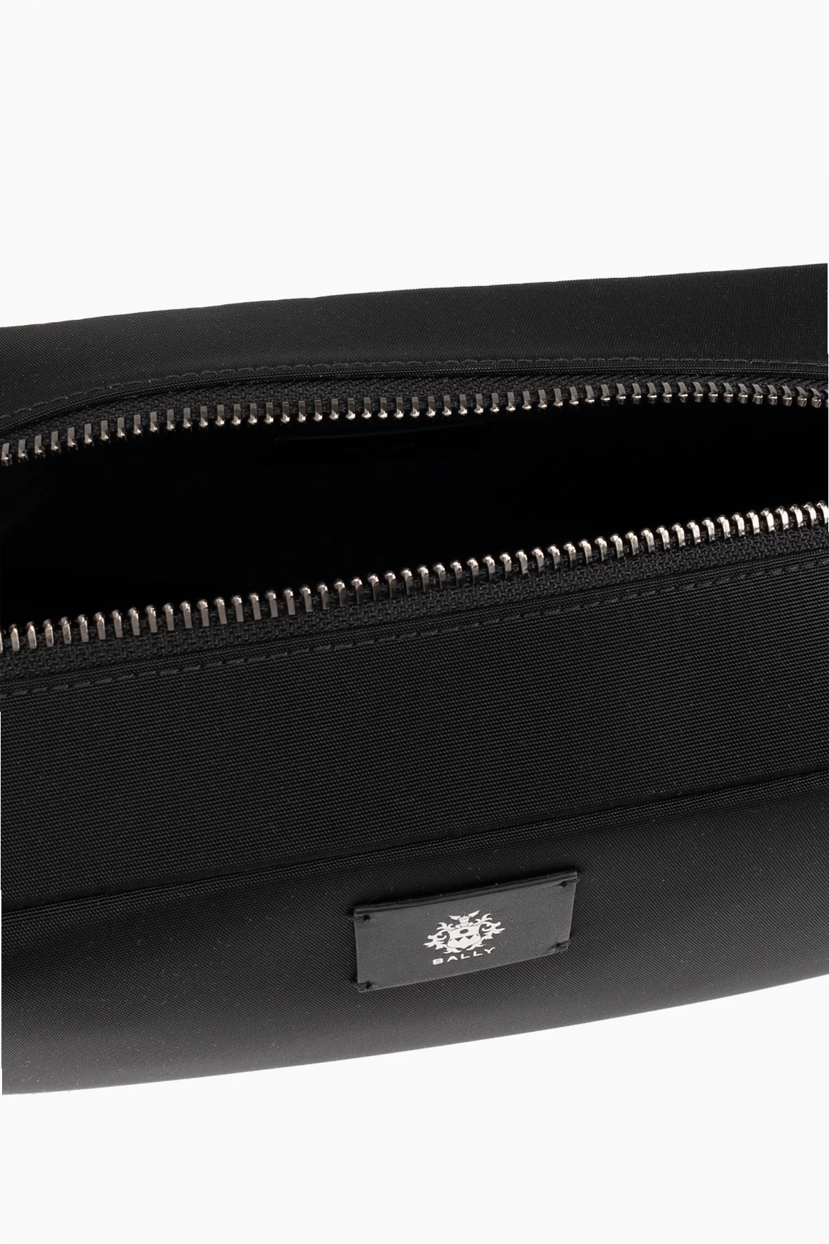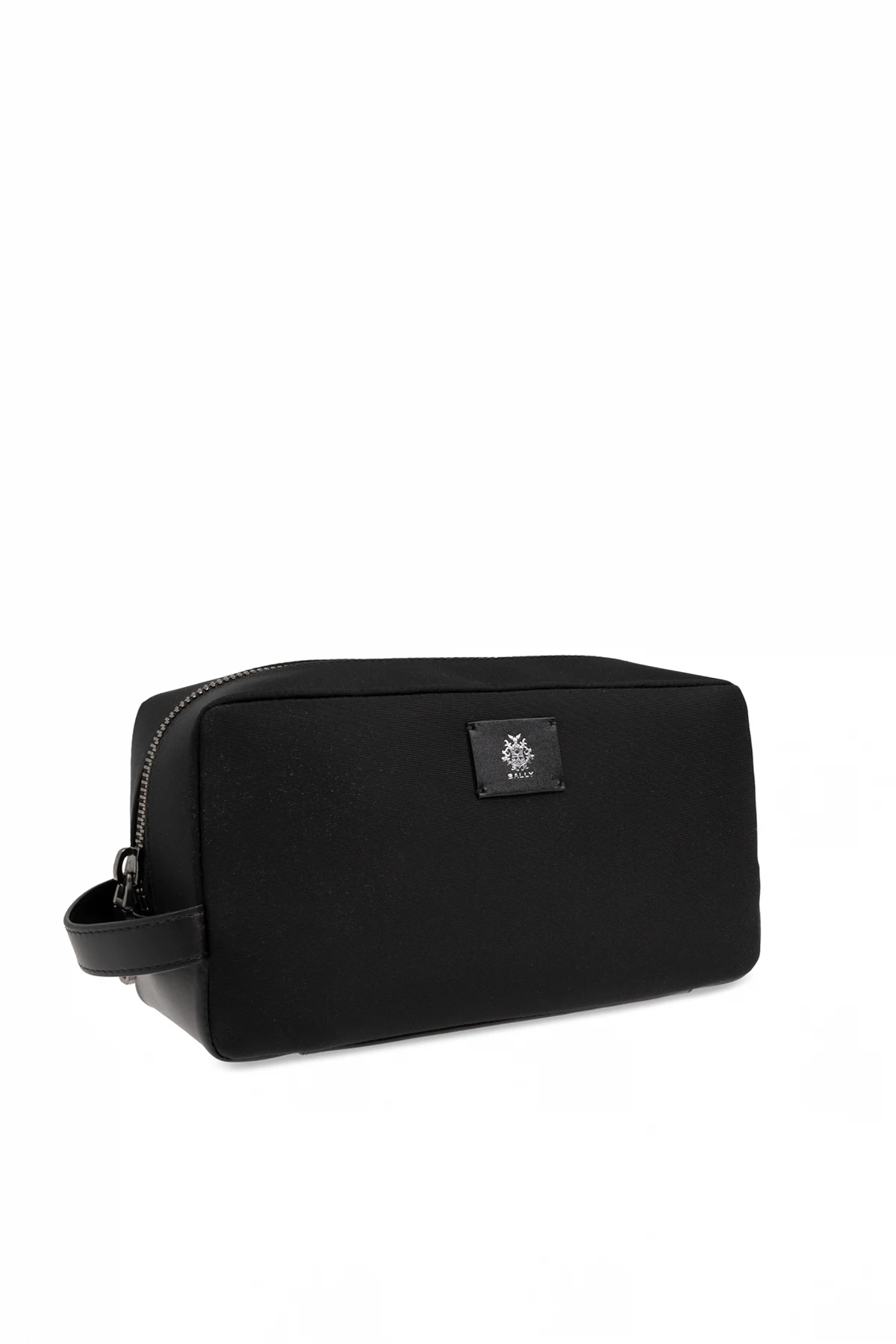 Wyróżnia się głębokim czarnym kolorem, który nadaje jej ponadczasowej elegancji. Kosmetyczka jest zamykana na srebrny zamek błyskawiczny, co dodaje jej funkcjonalności i stylu. Na przedniej stronie znajduje się prostokątna naszywka z logo 'Bally' w srebrnym kolorze, co podkreśla prestiż produktu.