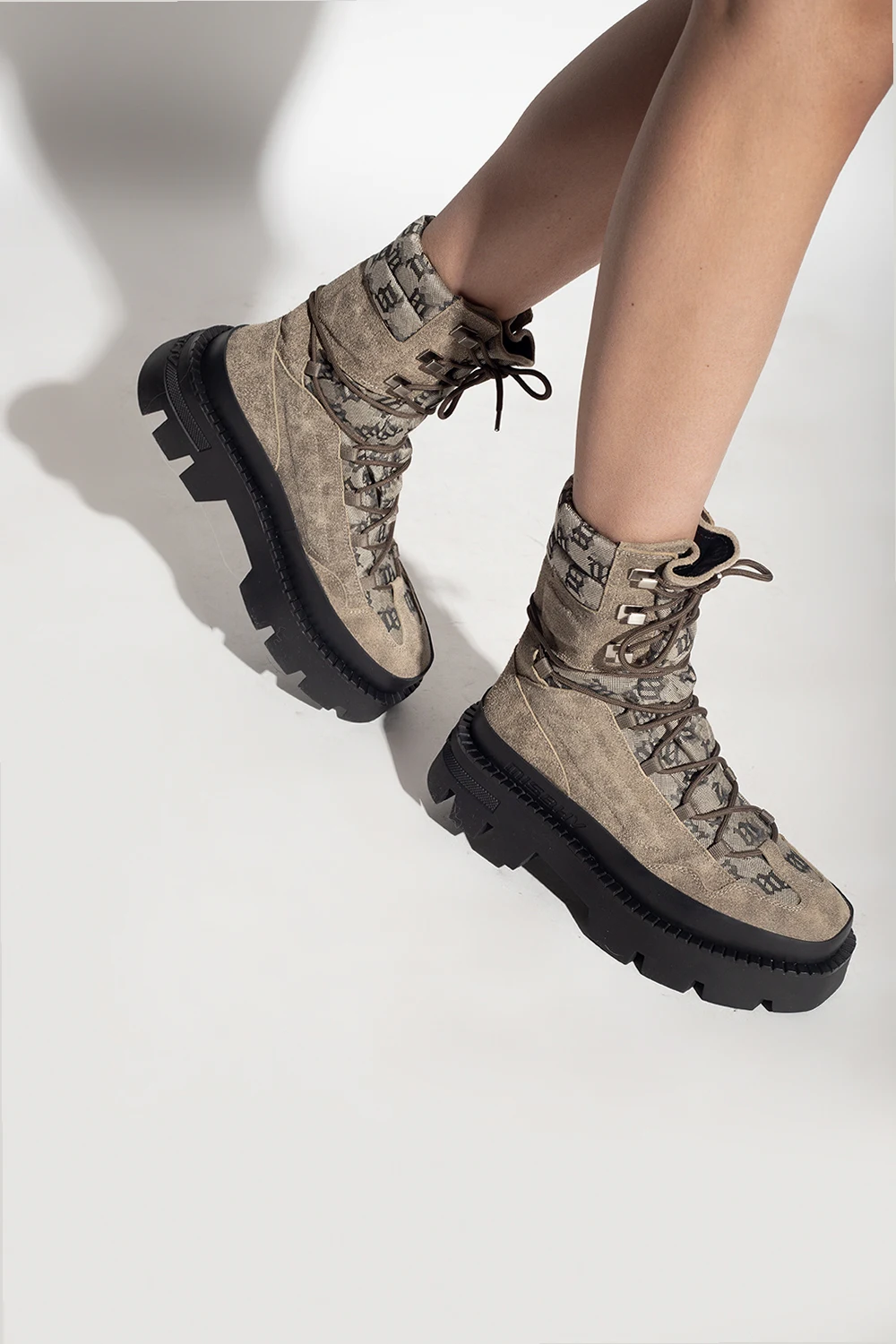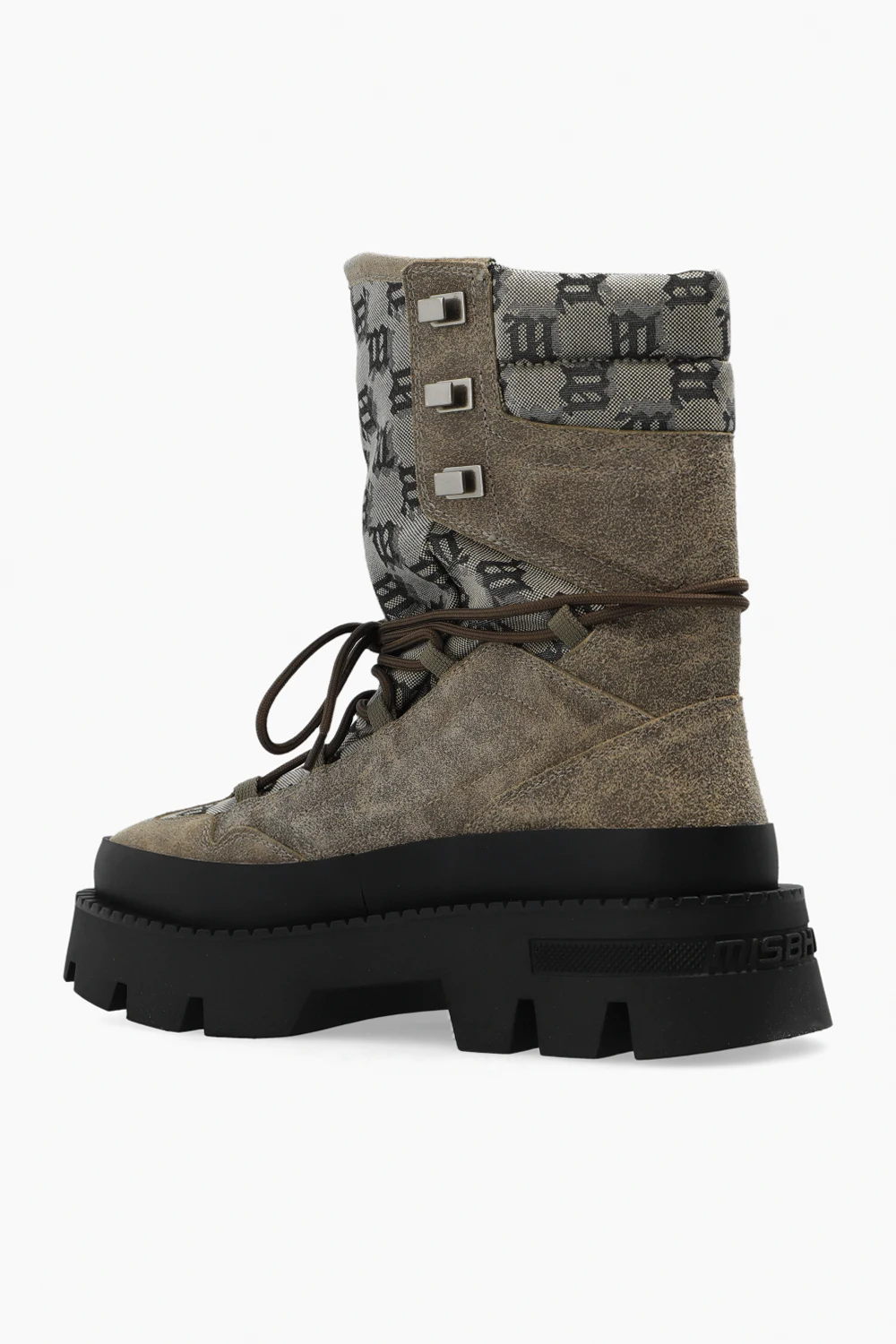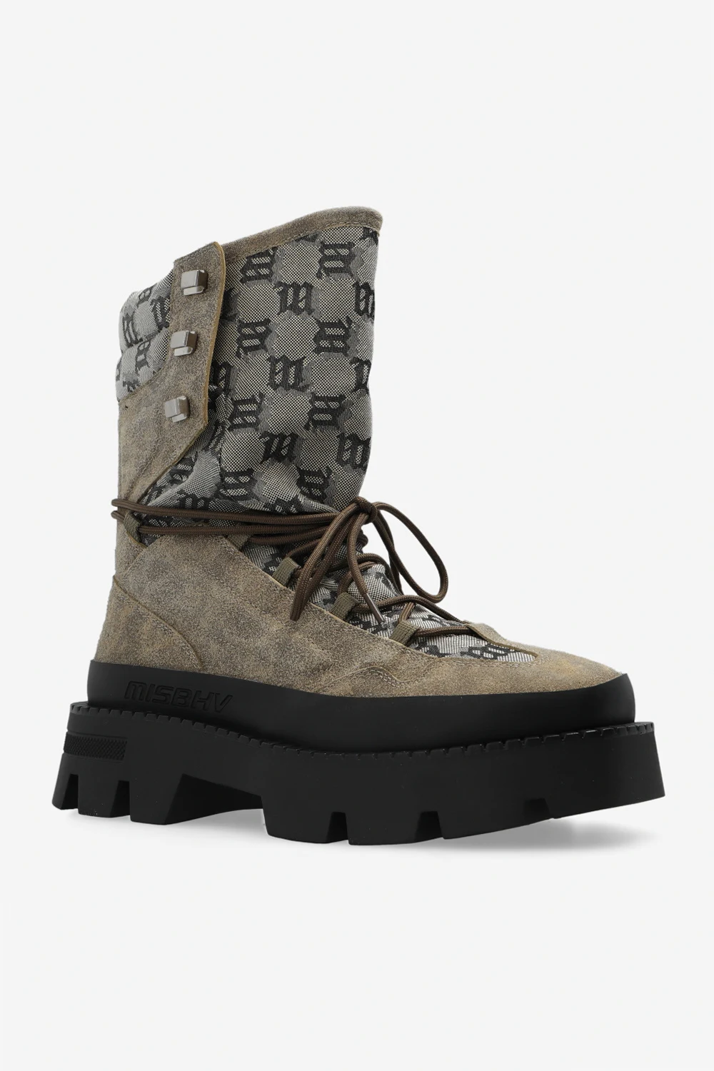Beżowo-kremowo-czarne, sznurowane buty MISBHV. Wykonane ze skóry. Ozdobione wzorem z monogramem. Czarna, gumowa podeszwa.