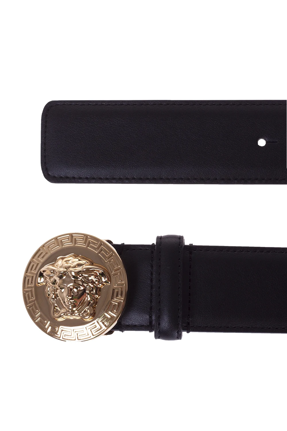 Czarny, skórzany pasek Versace. Ozdobna, metalowa klamra w kształcie logo w kolorze złotym.