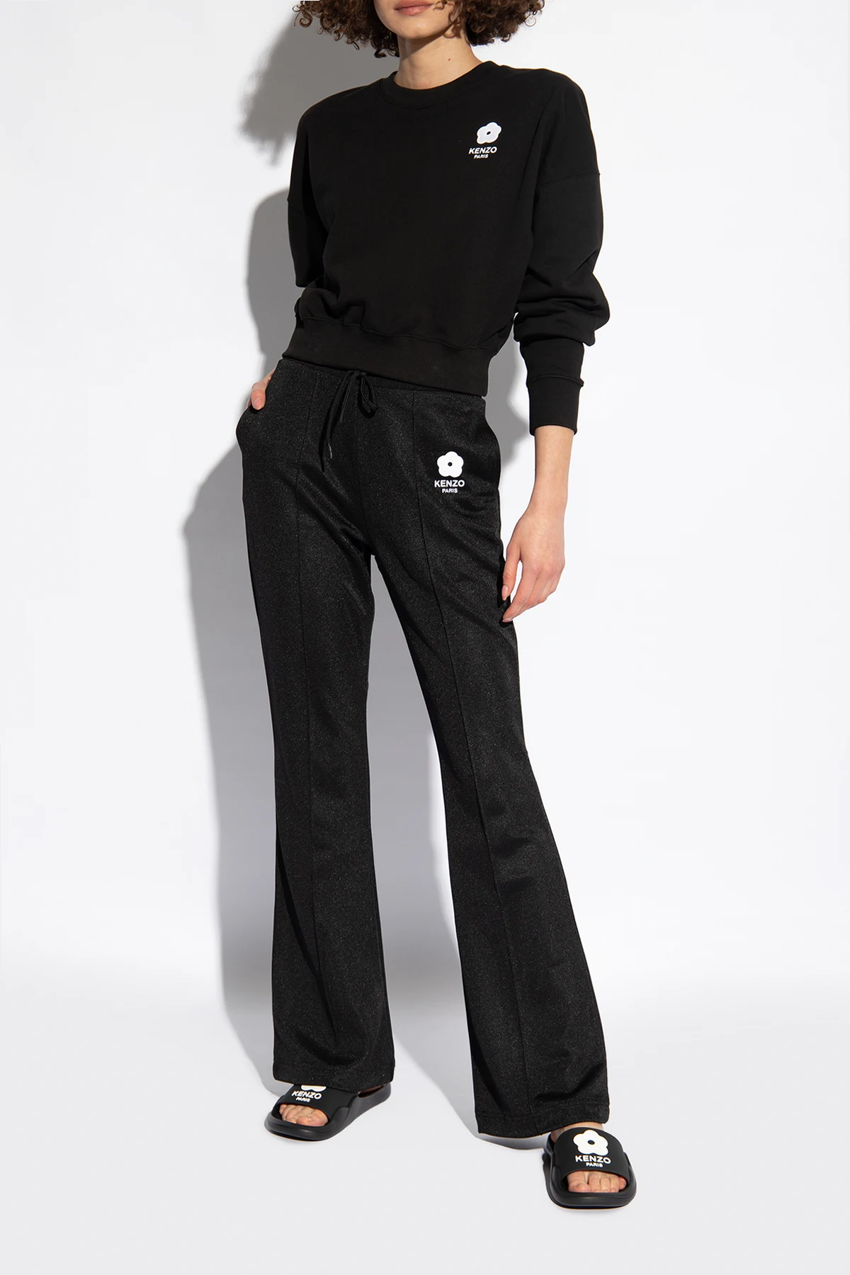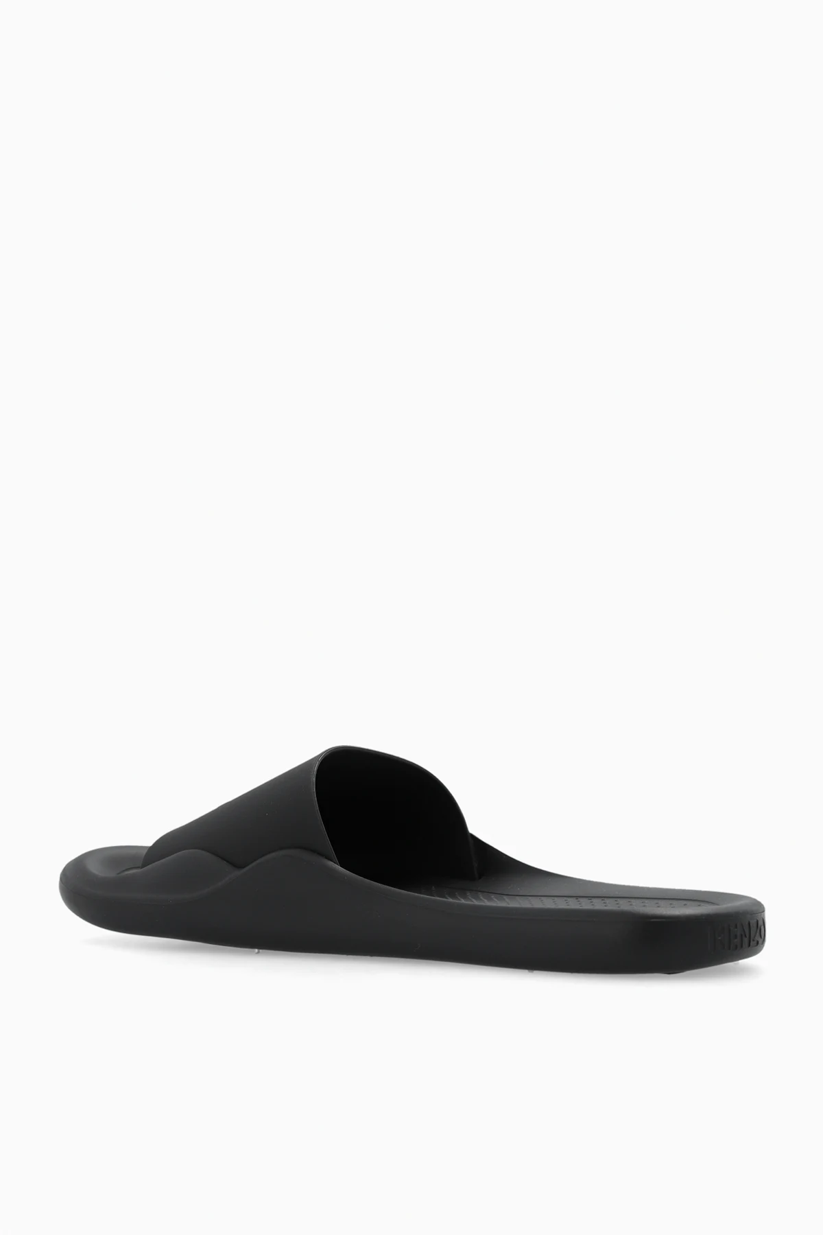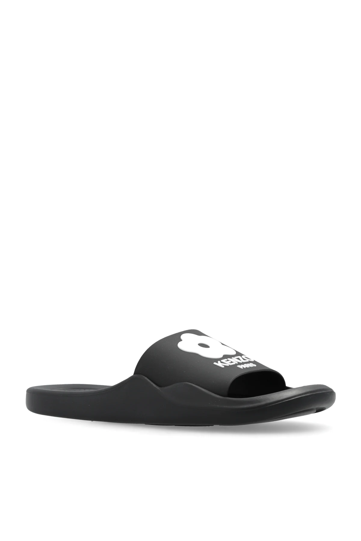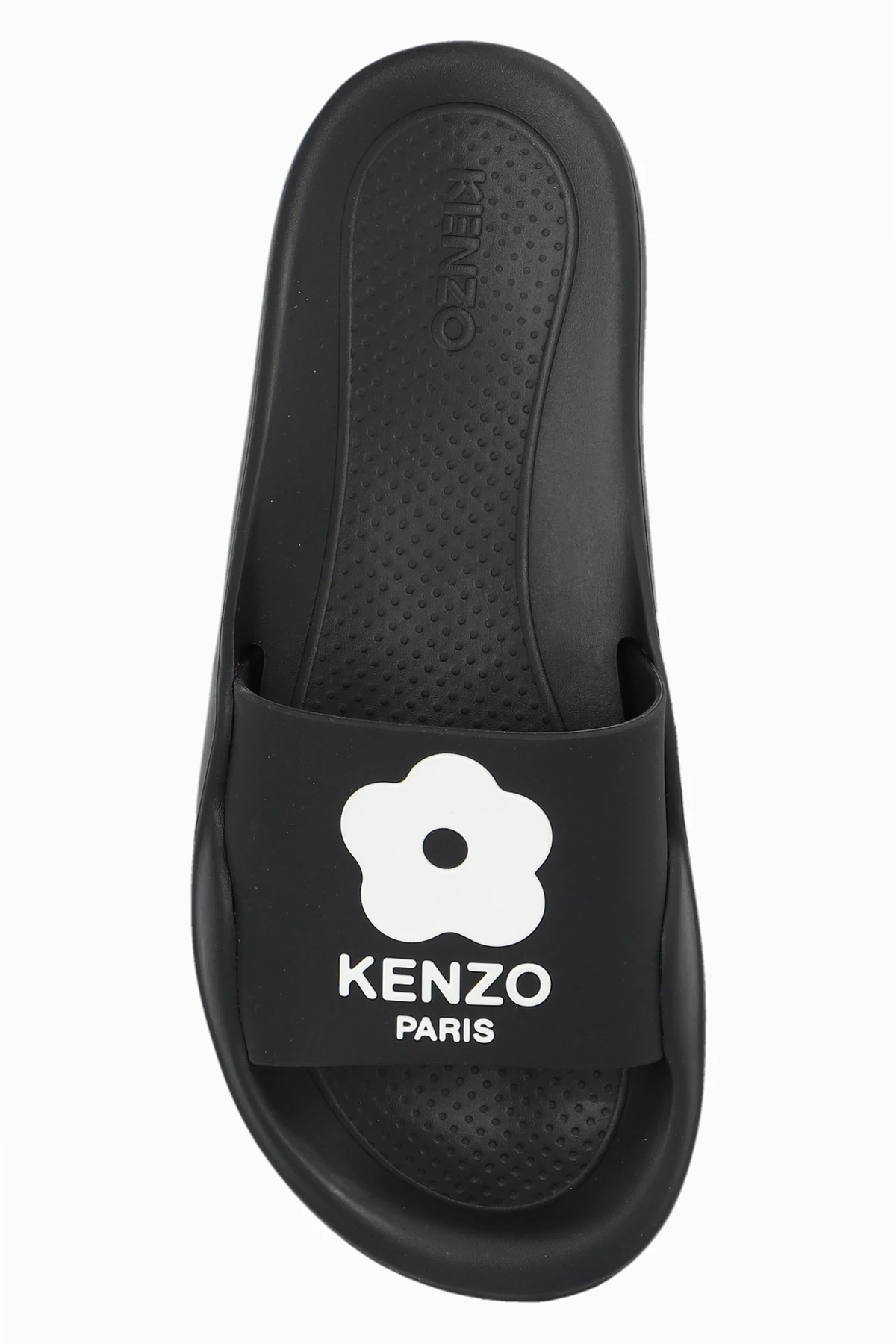 Czarne klapki Kenzo. Ozdobione białym wzorem z logo. Czarna, gumowa podeszwa.