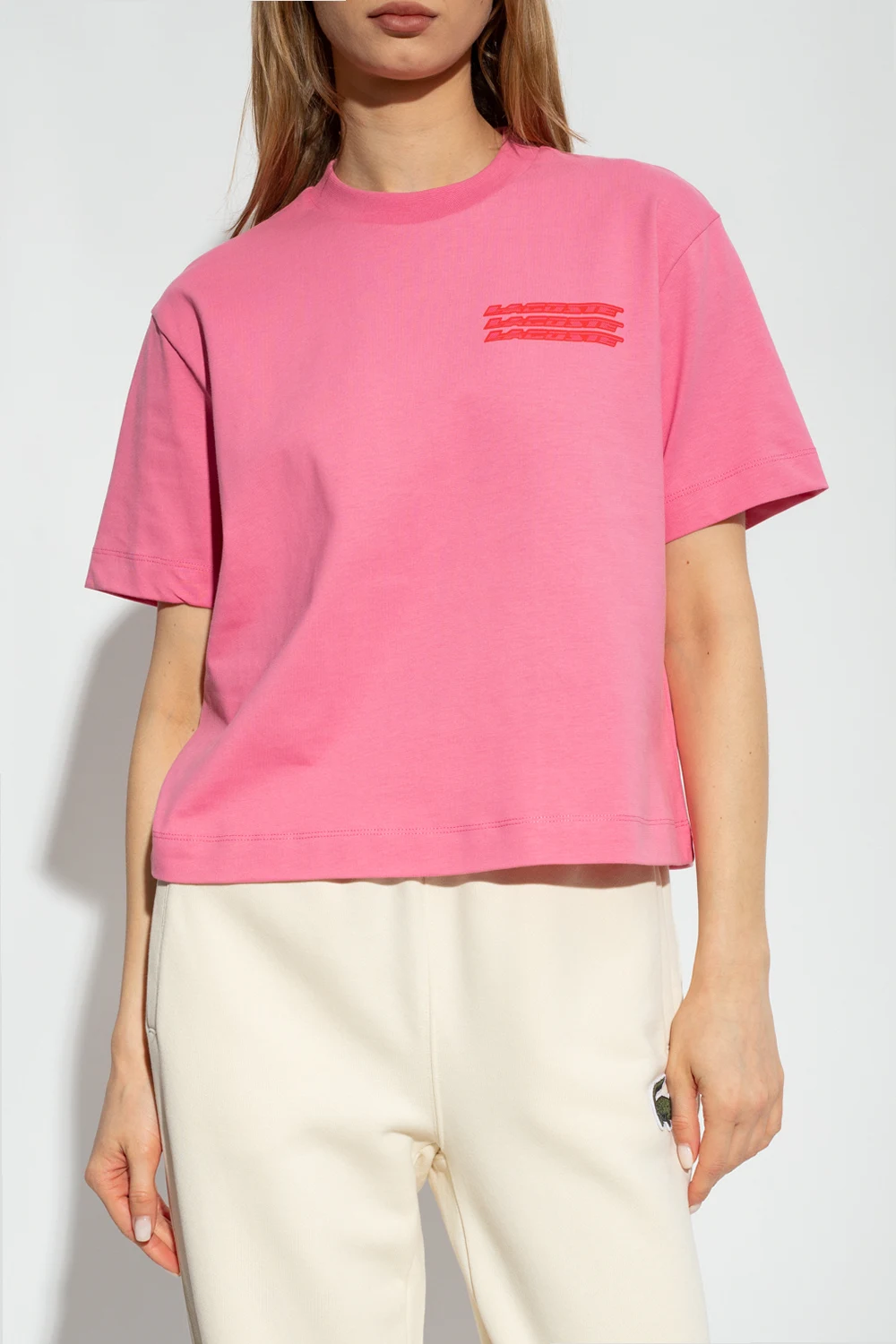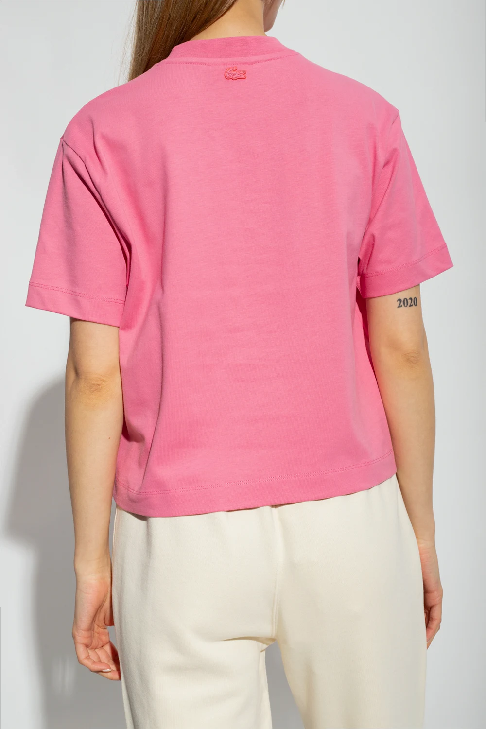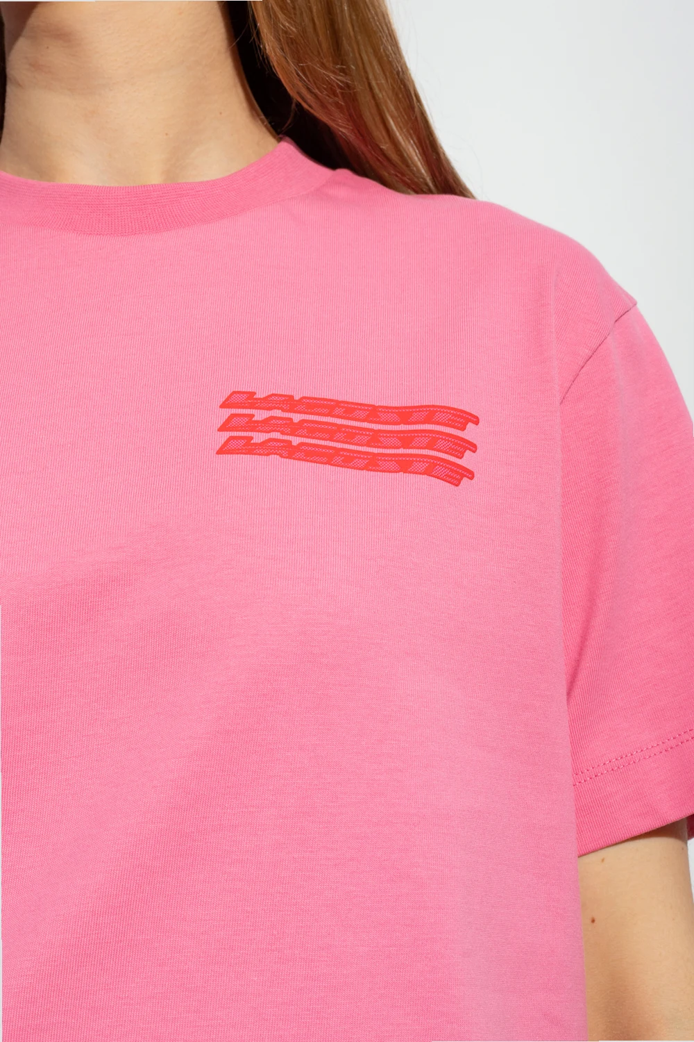 Różowy t-shirt Lacoste. Wykonany z bawełny. Nadrukowany wzór. Okrągły dekolt wykończony ściągaczem. Krótkie rękawy.