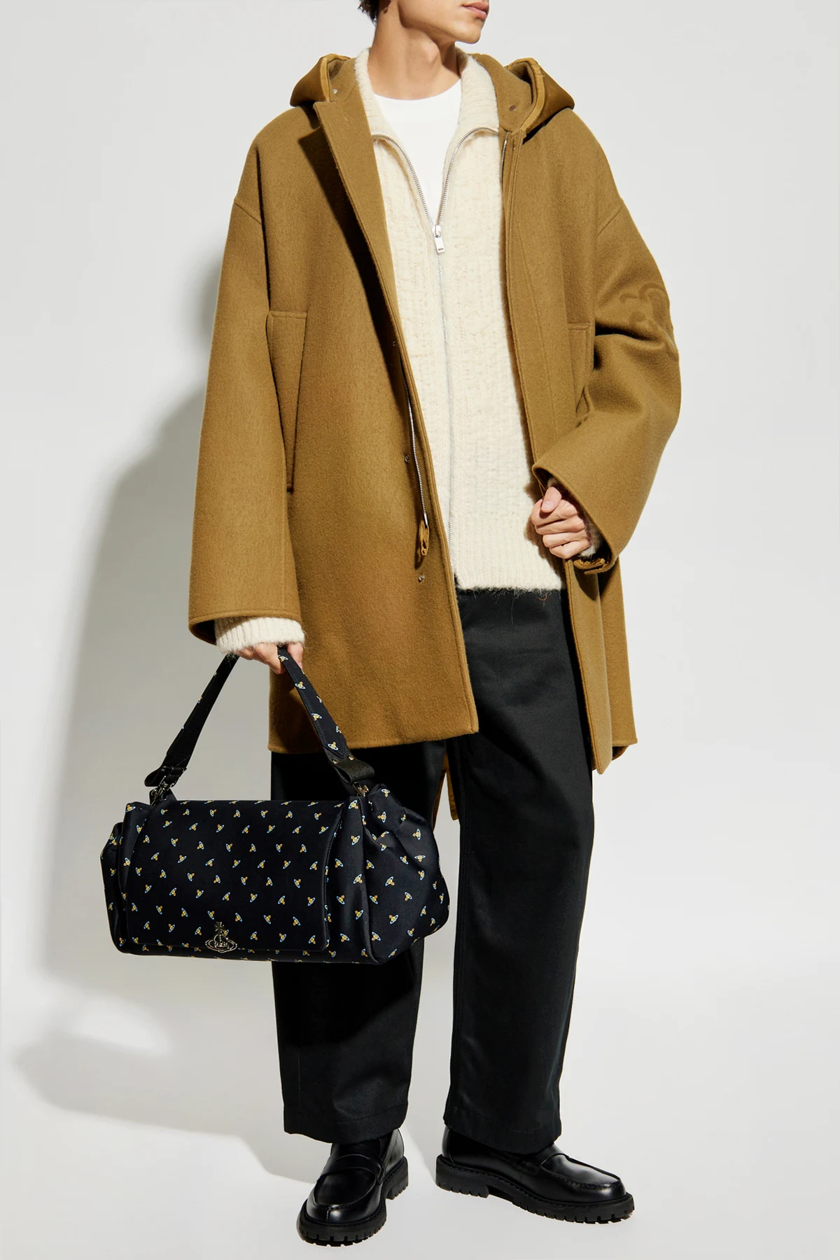 Unikatowe detale, takie jak regulowany kaptur i subtelne logo projektanta.