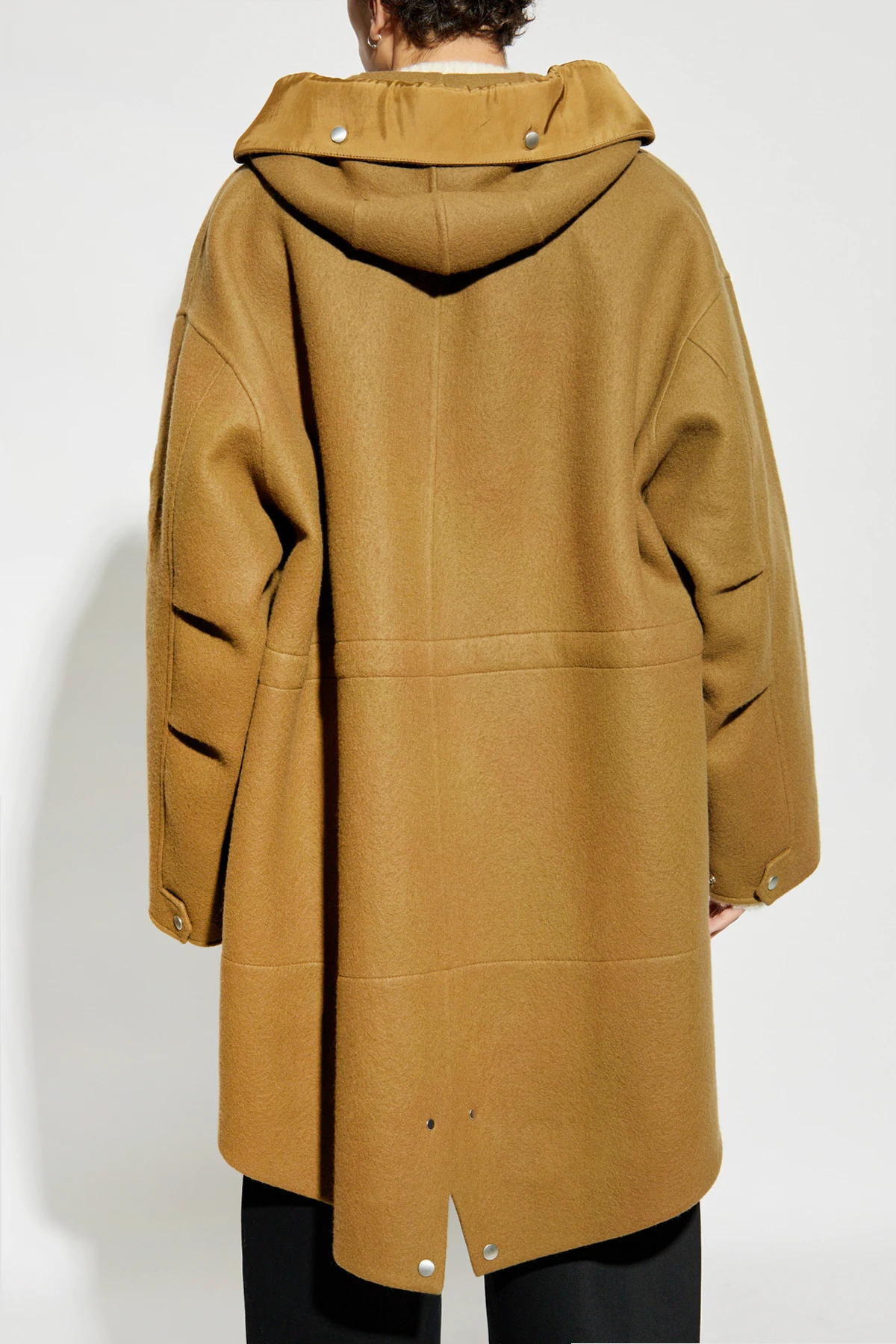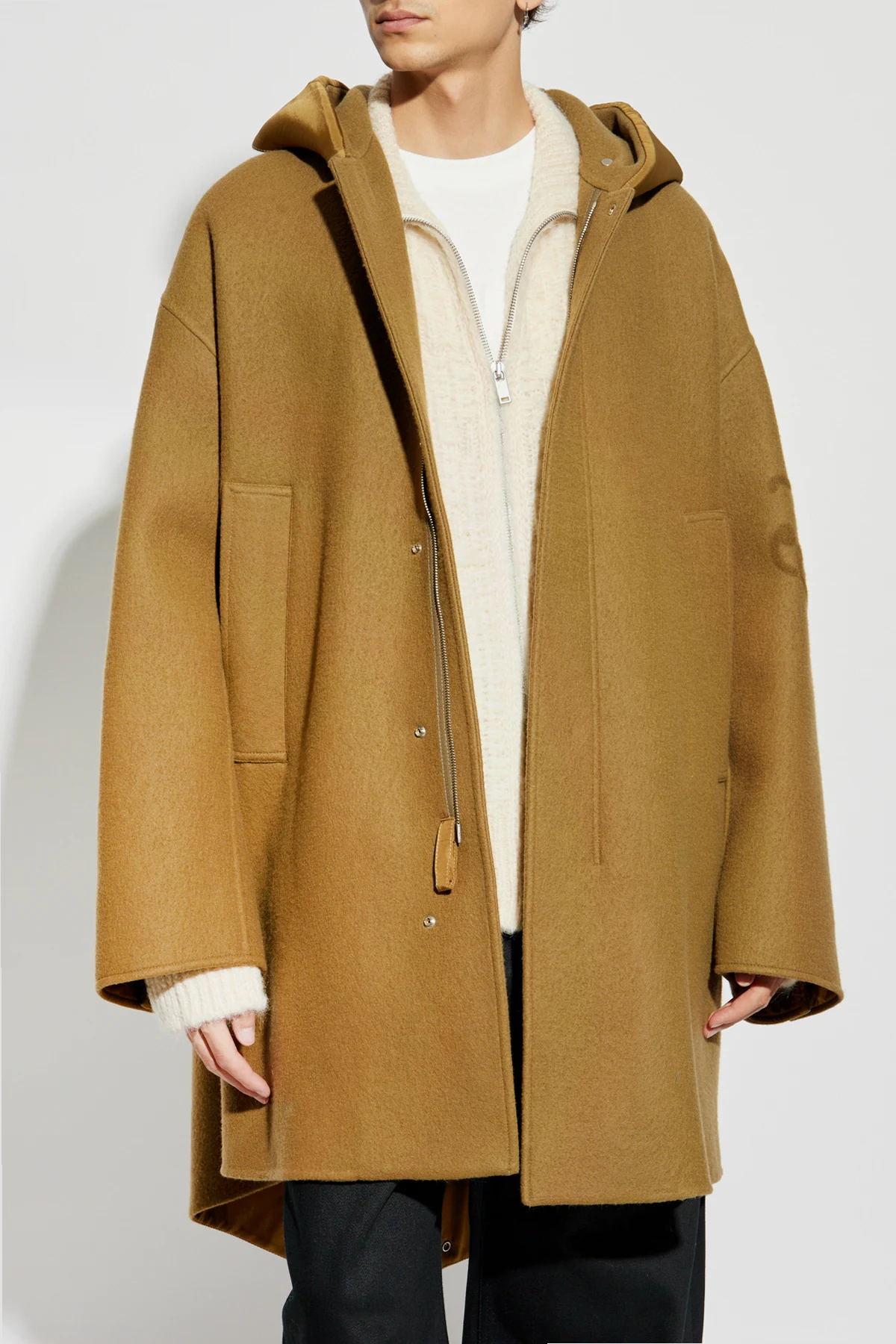 Unikatowe detale, takie jak duży, regulowany kaptur, zapinanie na guziki oraz suwak, a także subtelne logo projektanta wytłoczone na ramieniu, dodają mu wyjątkowości. Dwie duże, naszywane kieszenie z przodu są zarówno praktyczne, jak i stylowe. Płaszcz wyróżnia się również ciepłym odcieniem brązu, a dodatkowe metalowe zatrzaski na plecach umożliwiają regulację szerokości płaszcza w dolnej części.