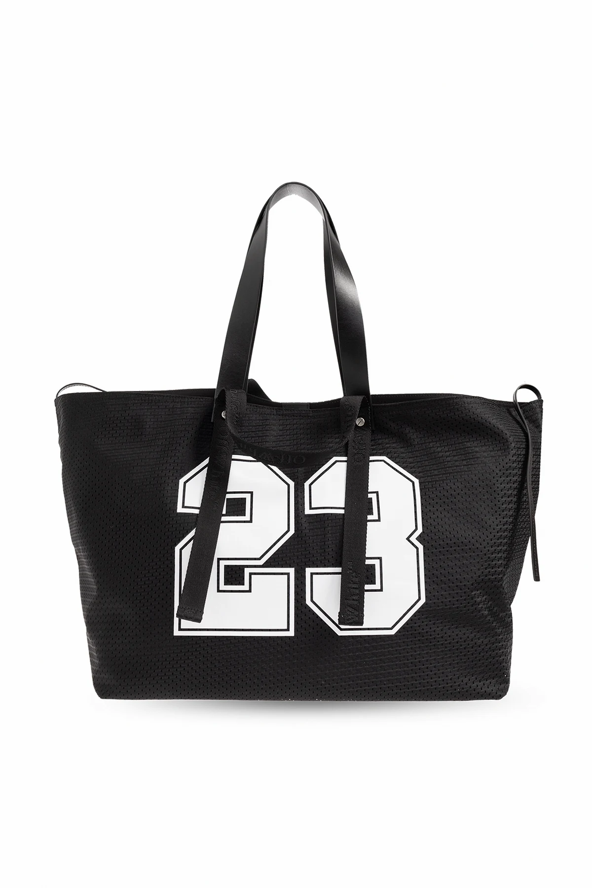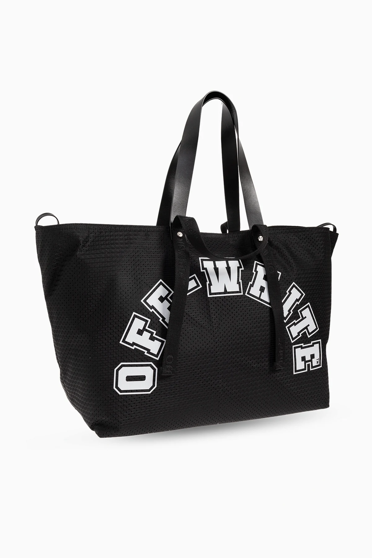 Czarna torba typu 'shopper' Off-White. Wykonana z materiału. Ozdobiona białym nadrukiem z logo. Zapinana na zatrzask. Cztery półokrągłe rączki. Wewnątrz komora oraz kieszeń z zamknięciem na zamek. Metalowe wykończenie w kolorze srebrnym.