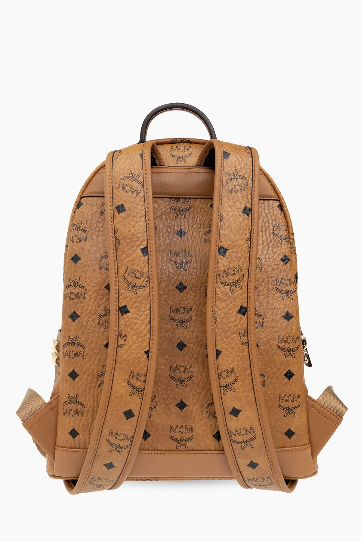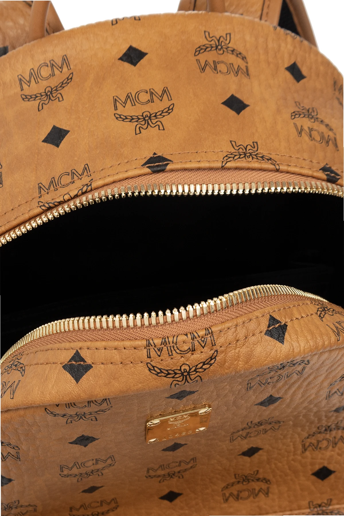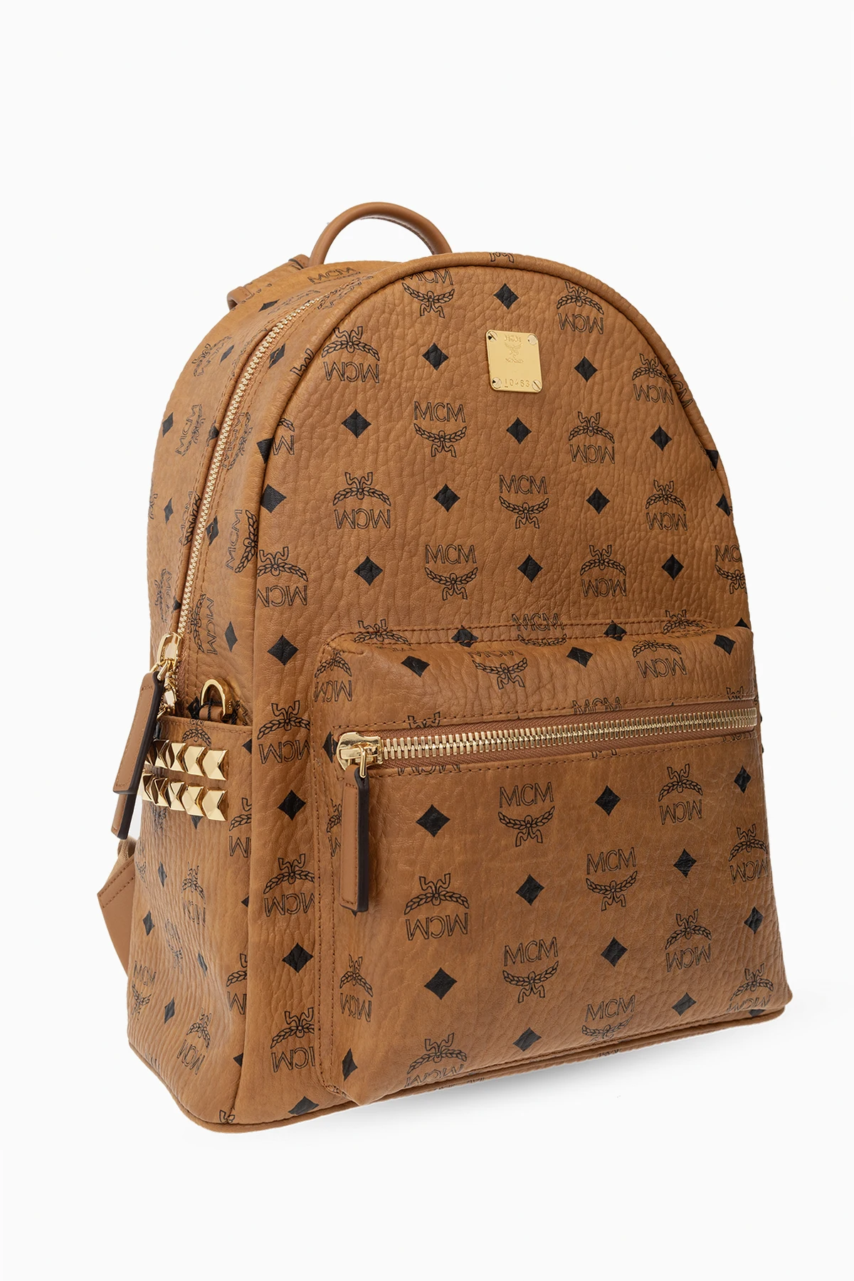 Brązowy plecak, model ‘Stark Side Studs’ MCM. Wykonany z charakterystycznego płótna powlekanego ozdobionego wzorem z monogramem ‘Visetos’ w kolorze czarnym. Wykończony skórą. Zamykany na dwubiegunowy zamek. Ozdobiony aplikacją z logo i ćwiekami w kolorze złotym. Z przodu kieszeń zamykana na zamek. Po bokach wsuwana kieszeń. Półokrągła rączka. Regulowane szelki. Wewnątrz komora i dwie wsuwane kieszenie. Metalowe elementy w kolorze złotym.