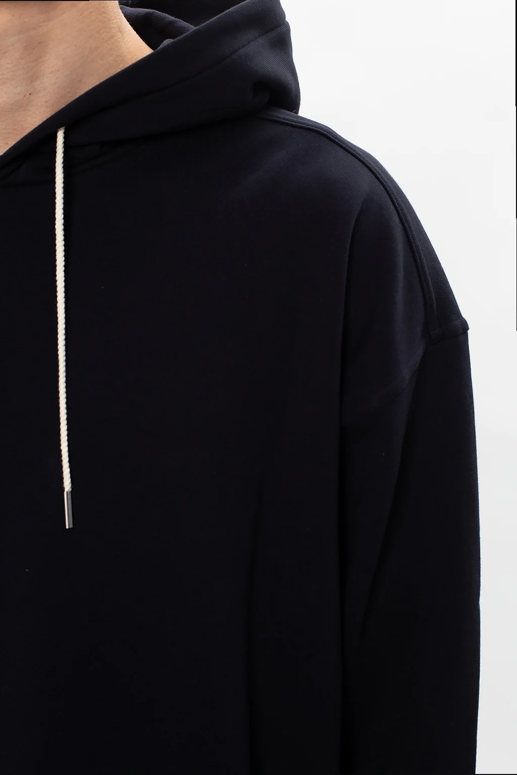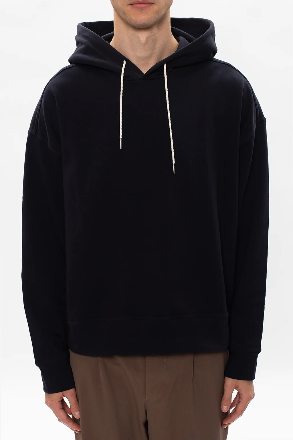 Czarna bluza z kapturem Jil Sander. Wykonana z bawełny. Kaptur ściągany trokami. Zakończona ściągaczami.