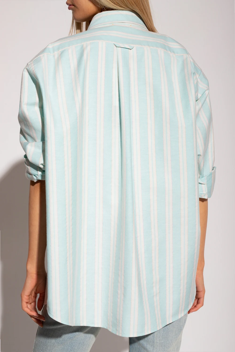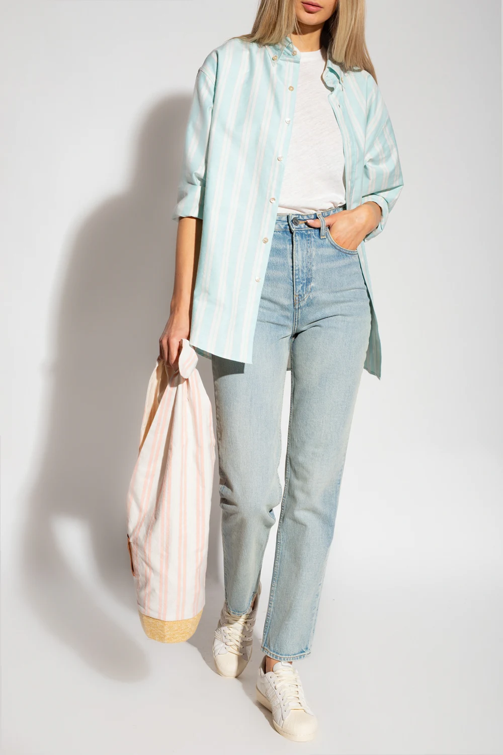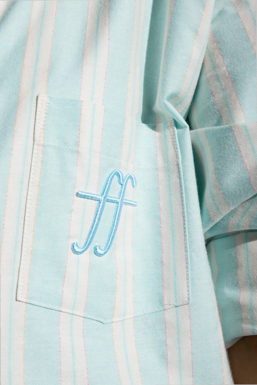 Jasnoniebiesko-biała, bawełniana koszula Forte Forte. Przód oraz kołnierz zapinany na guziki. Ozdobiona wzorem w pionowe pasy. Z przodu wsuwana kieszeń z wyszytym logo w kolorze niebieskim. Długie rękawy wykończone kontrastowymi, jasnożółtymi mankietami z zapięciem na guziki.