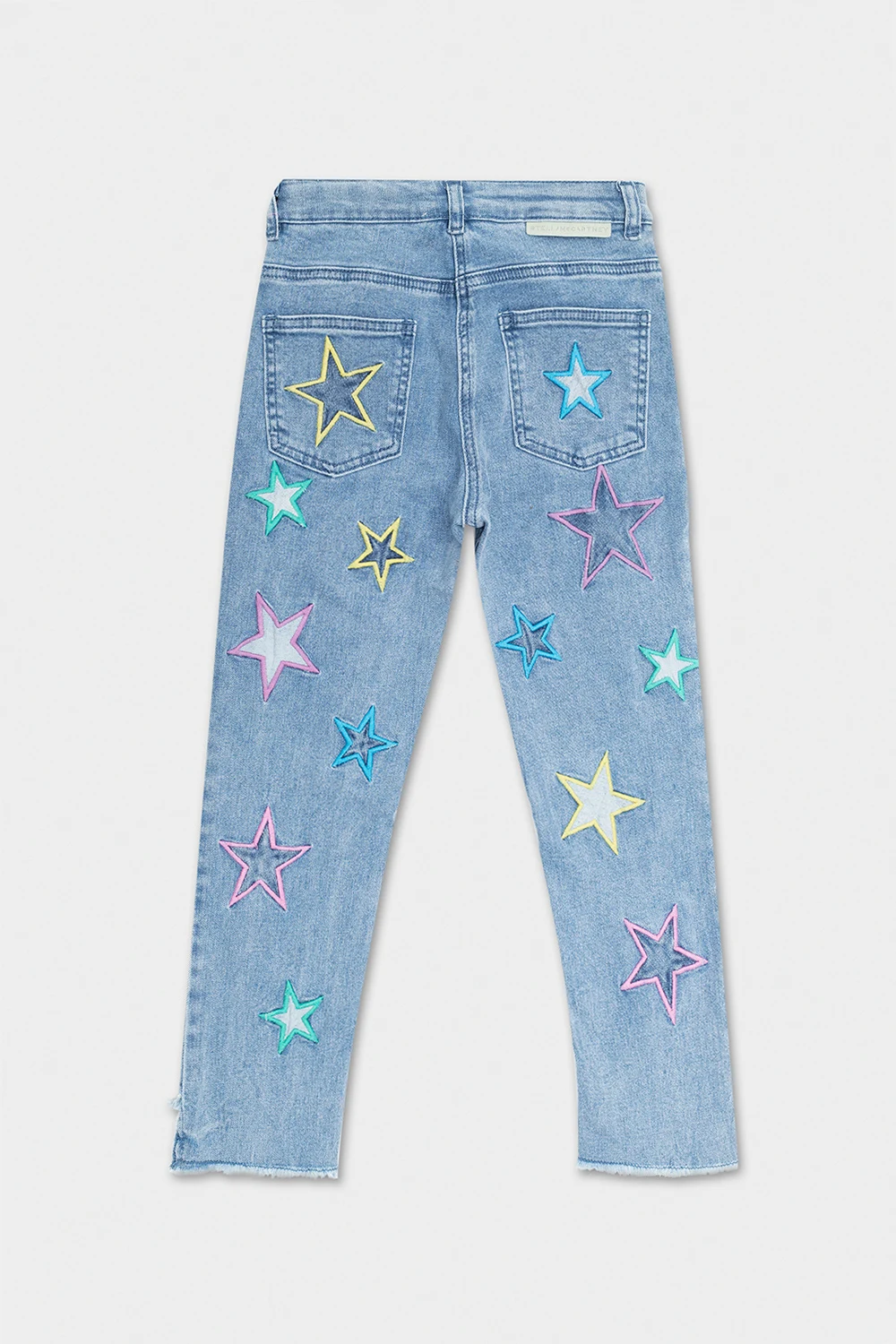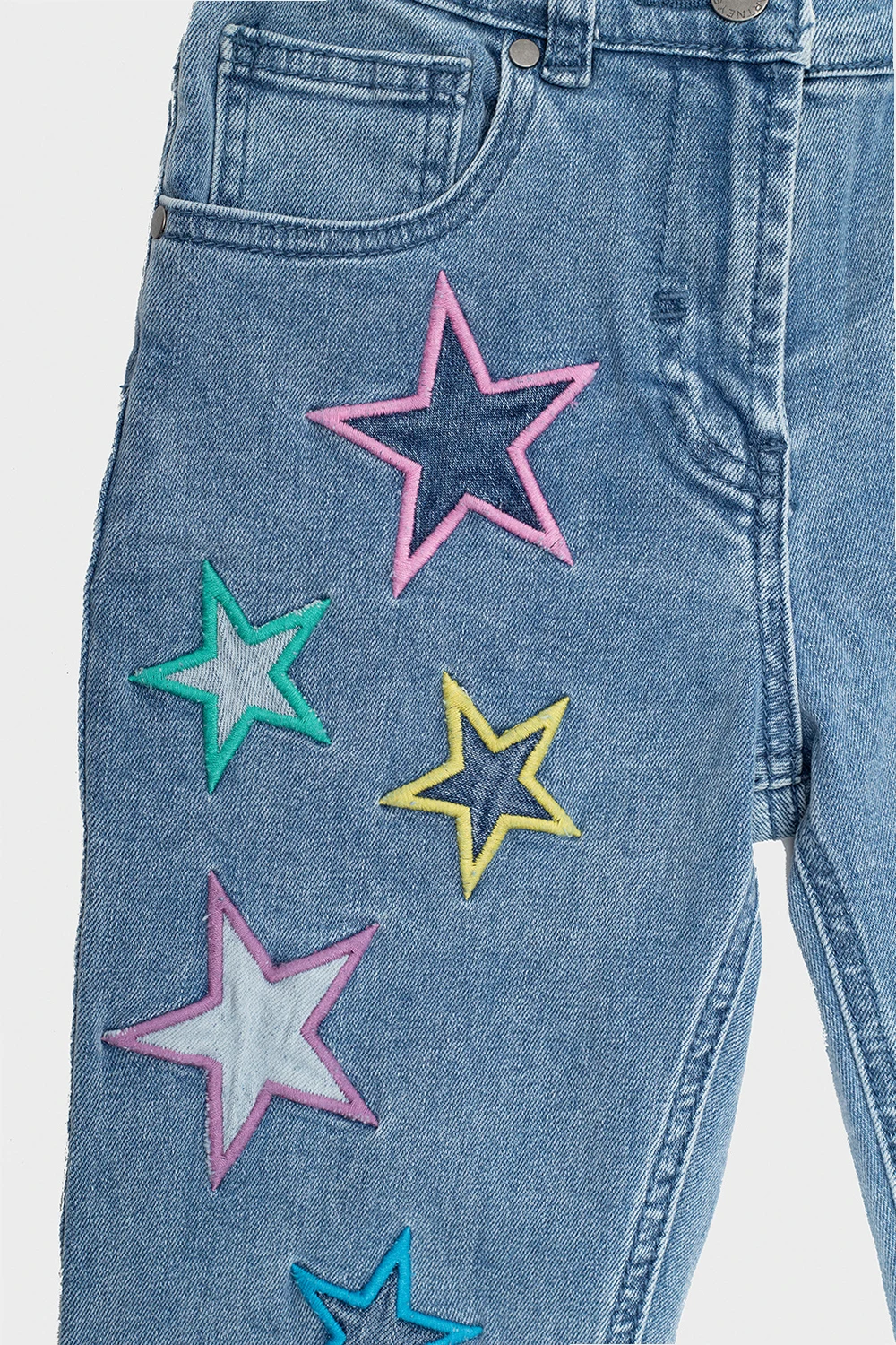Niebieskie jeansy Stella McCartney Kids. Wykonane z lekko rozciągliwej bawełny organicznej. Zapinane na zamek i guzik. Ozdobione kolorowo wyszytym motywem gwiazd. Pięć kieszeni: trzy z przodu i dwie wsuwane z tyłu. Lekko zwężane surowo wykończone nogawki z rozcięciem.