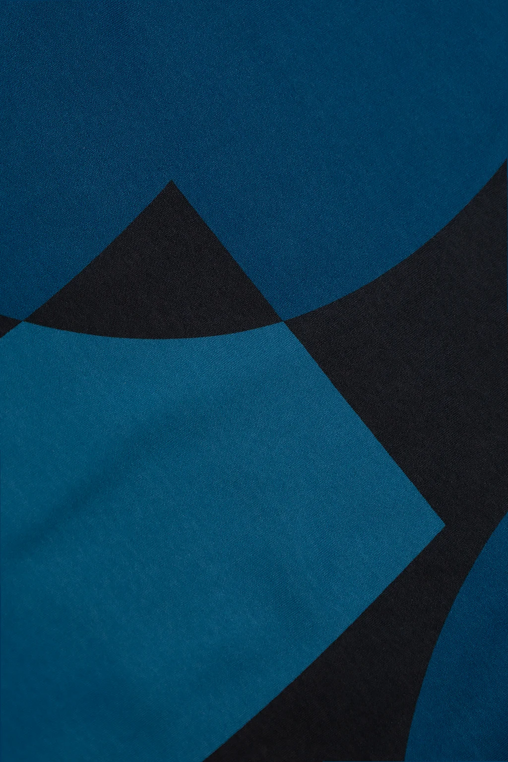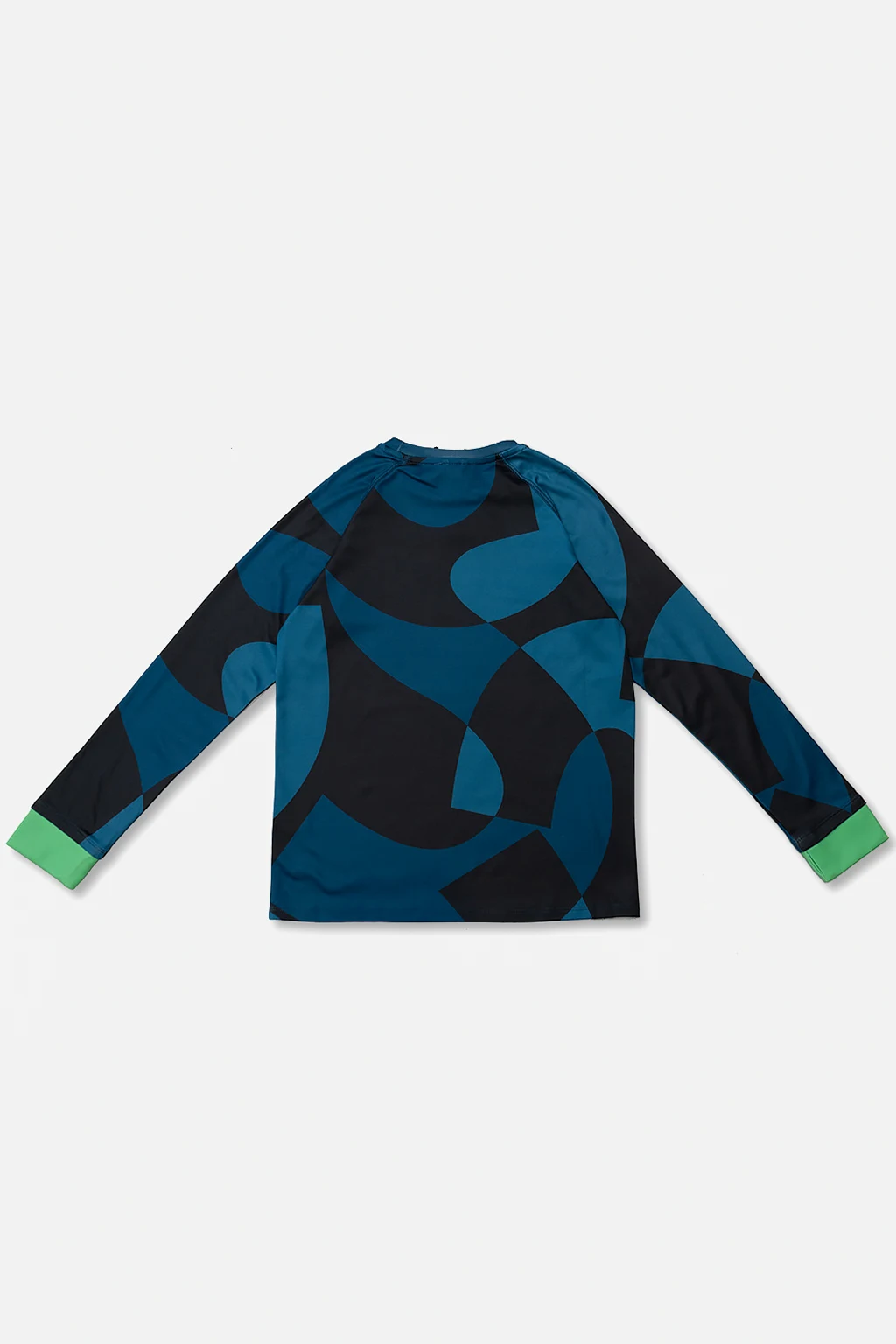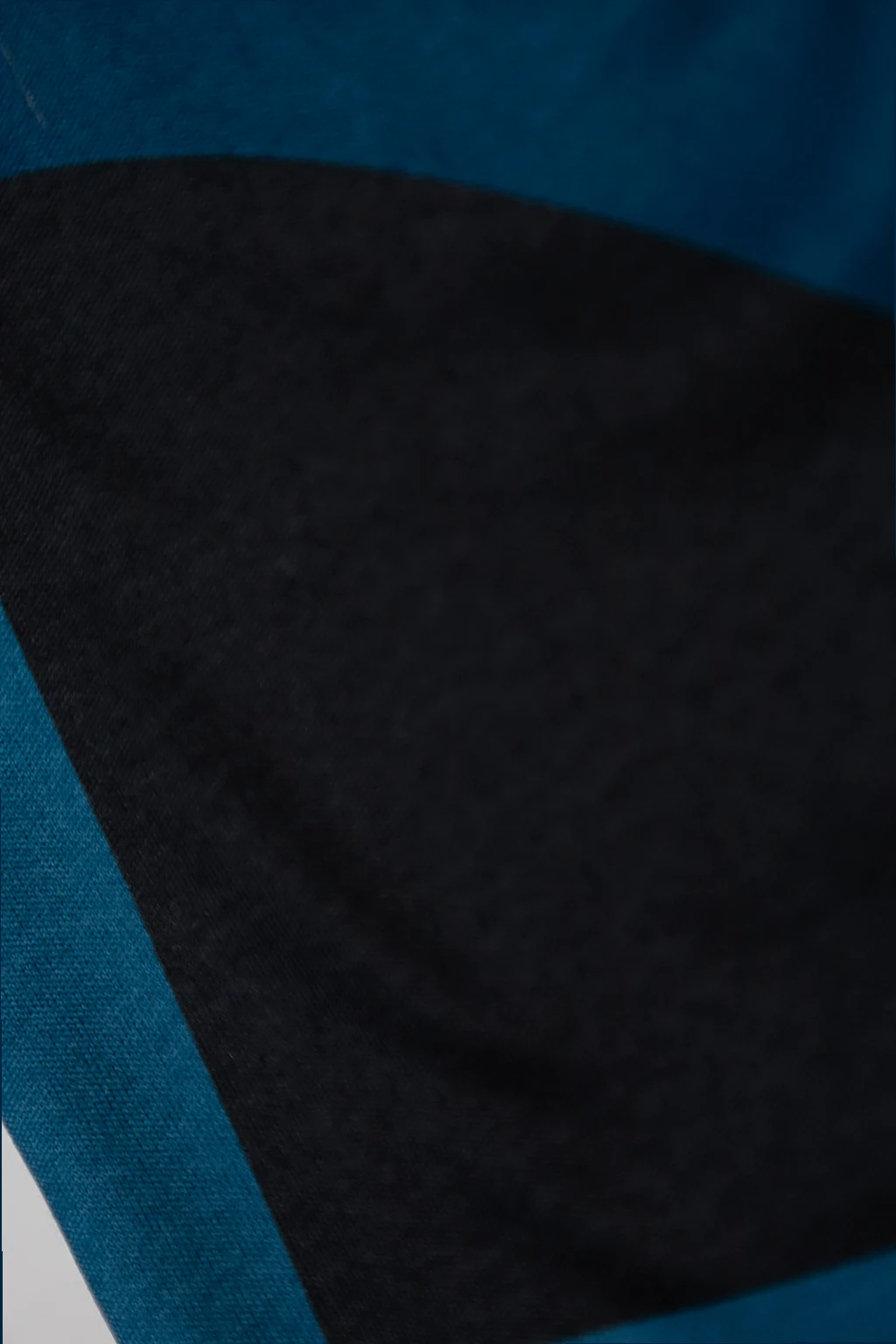 Ciemnoniebiesko-czarny t-shirt Stella McCartney Kids. Wykonany z technicznego materiału częściowo pochodzącego z recyklingu. Ozdobiony wzorem z motywem geometrycznym. Okrągły dekolt wykończony lamówką. Długie, raglanowe rękawy zakończone zielonym ściągaczem. T-shirt posiada właściwości oddychające i szybkoschnące.