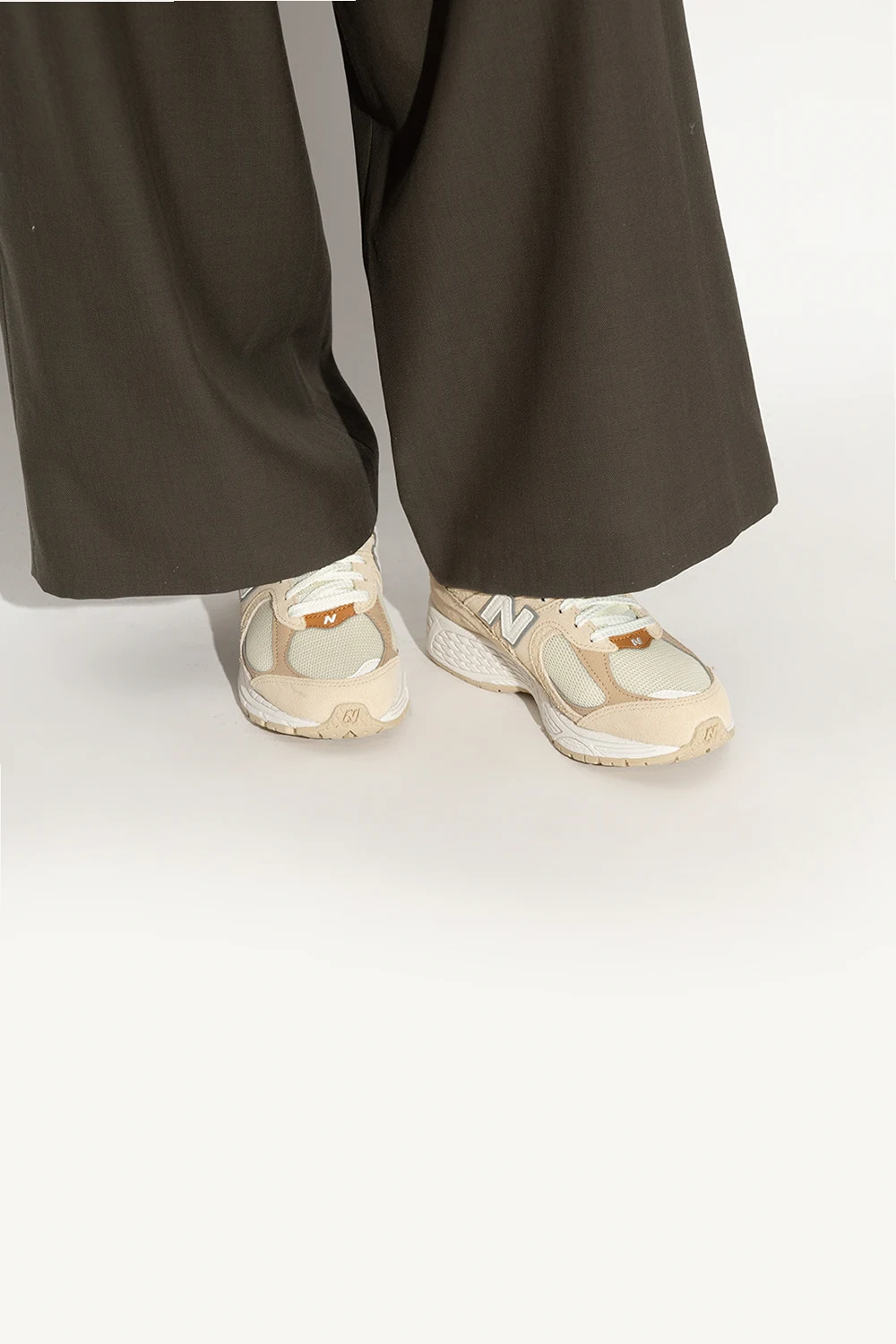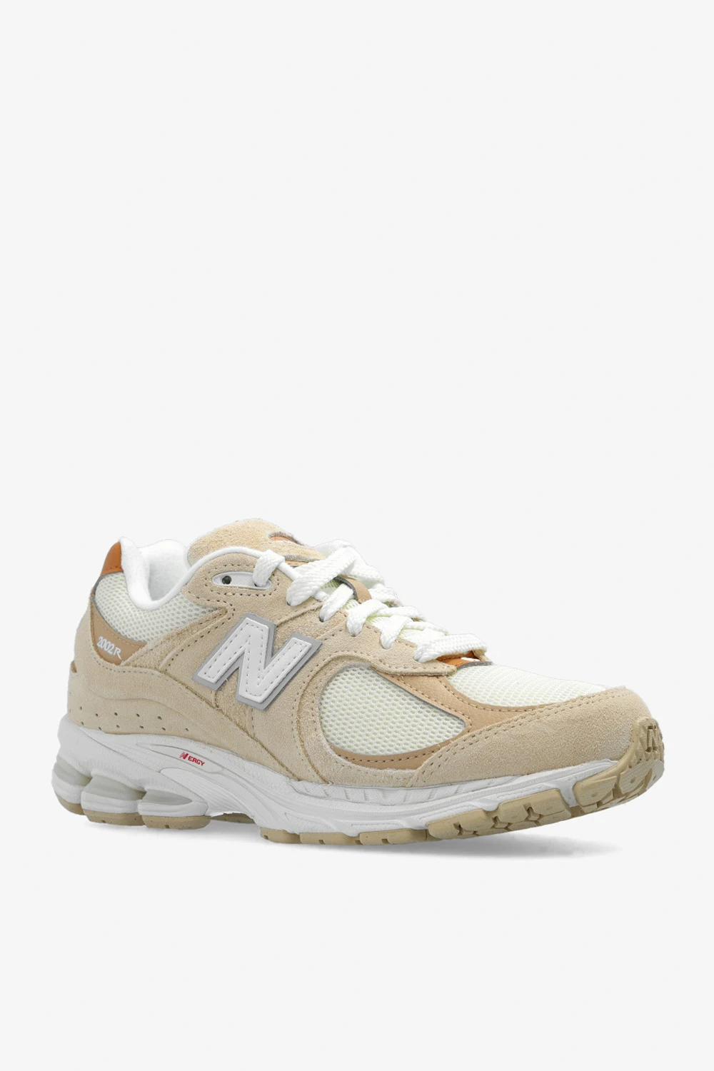Beżowo-białe, sznurowane buty sportowe, model ‘M2002RSC’ New Balance. Wykonane ze skóry i materiału. Ozdobione aplikacją z logo. Biało-beżowa, gumowa podeszwa.