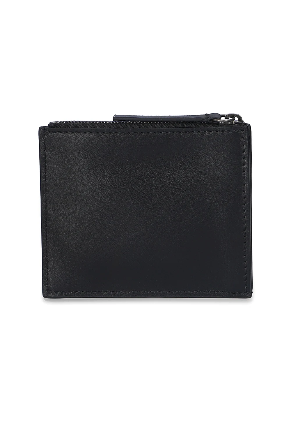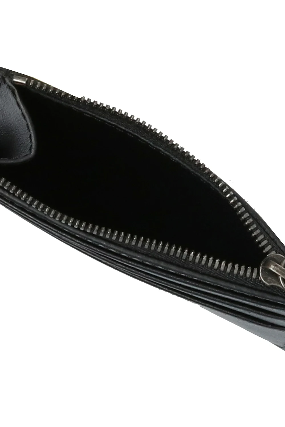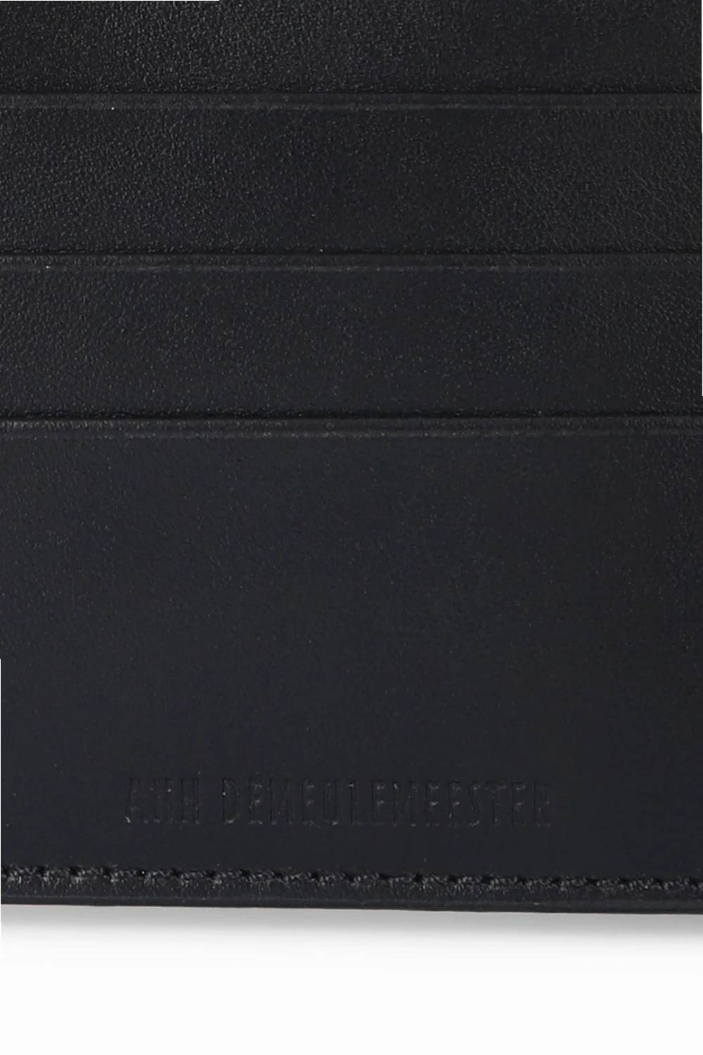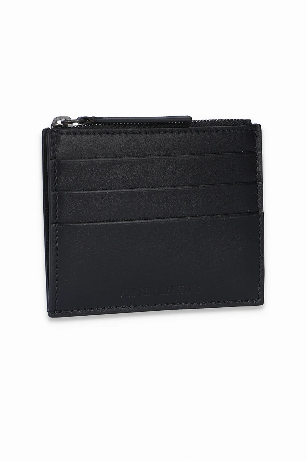 Czarne, skórzane etui na karty Ann Demeulemeester. Ozdobione wytłoczonym logo. Trzy miejsca na karty. Kieszeń na monety zamykana na zamek.