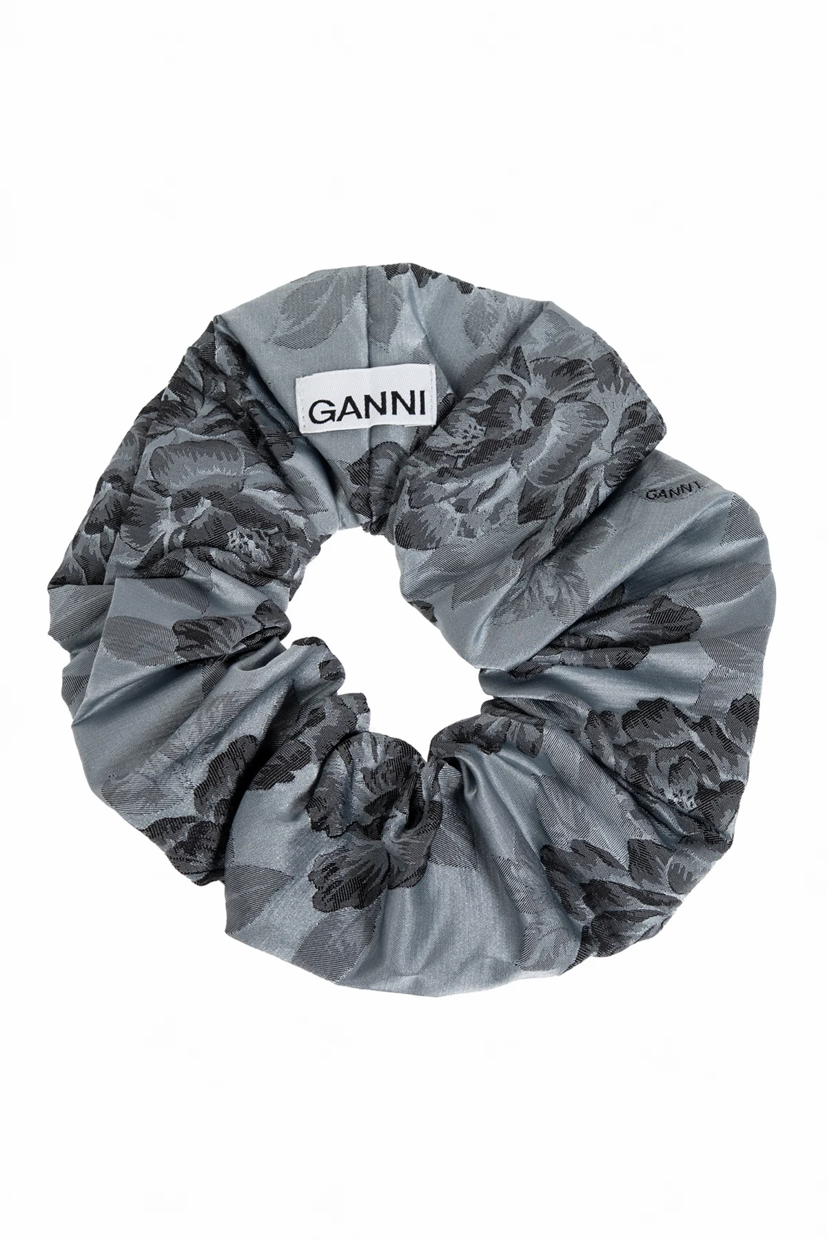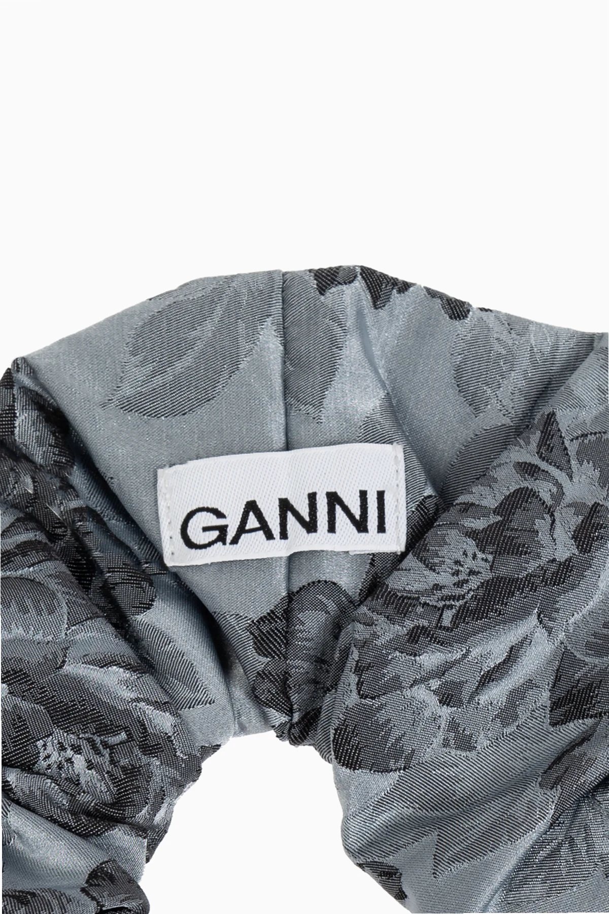 Gumka, o klasycznym, okrągłym kształcie typu scrunchie, wykonana jest z materiałów najwyższej jakości, zapewniając trwałość i wygodę użytkowania. Lekko połyskujący materiał dodaje jej luksusowego charakteru, a naszywka z logo GANNI podkreśla prestiż i oryginalne pochodzenie produktu.