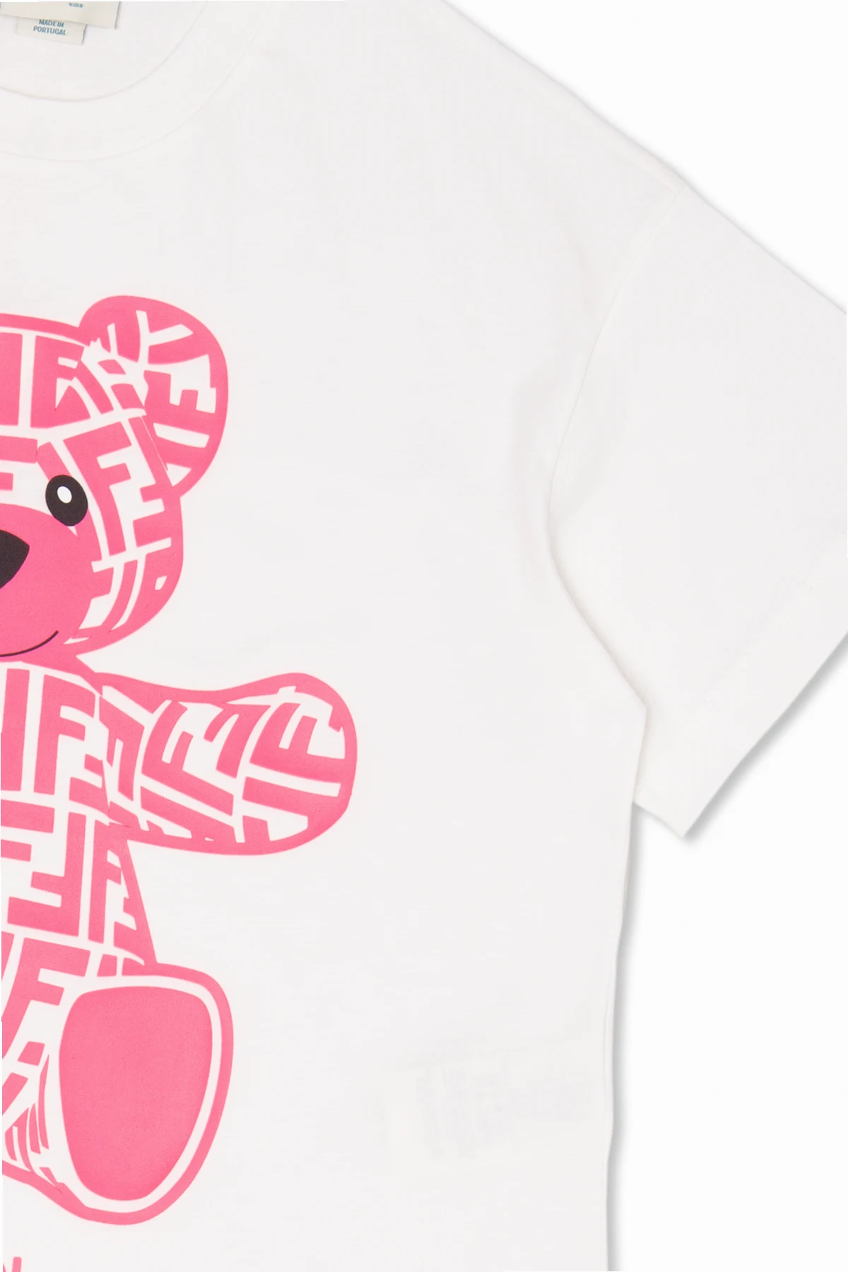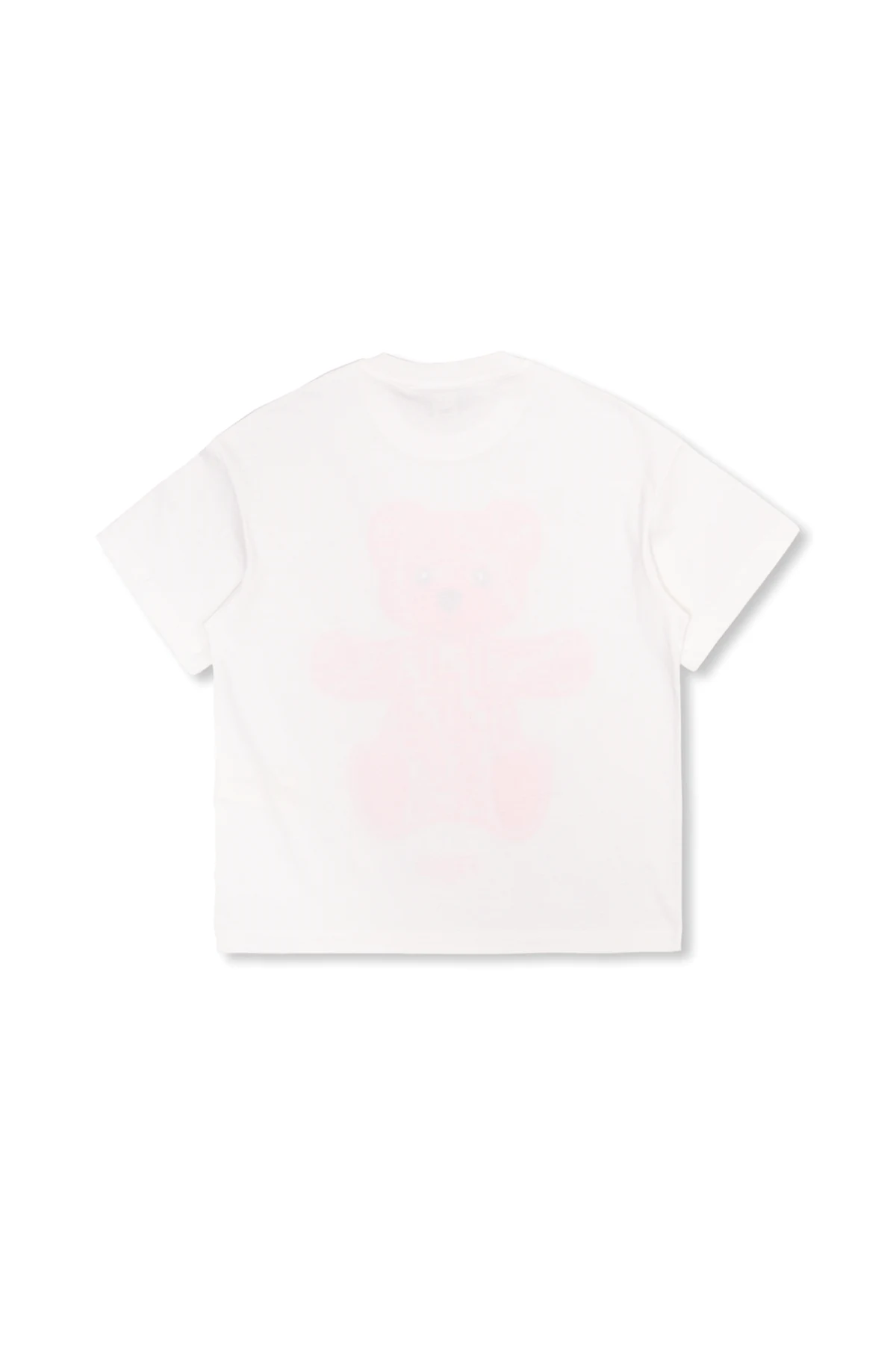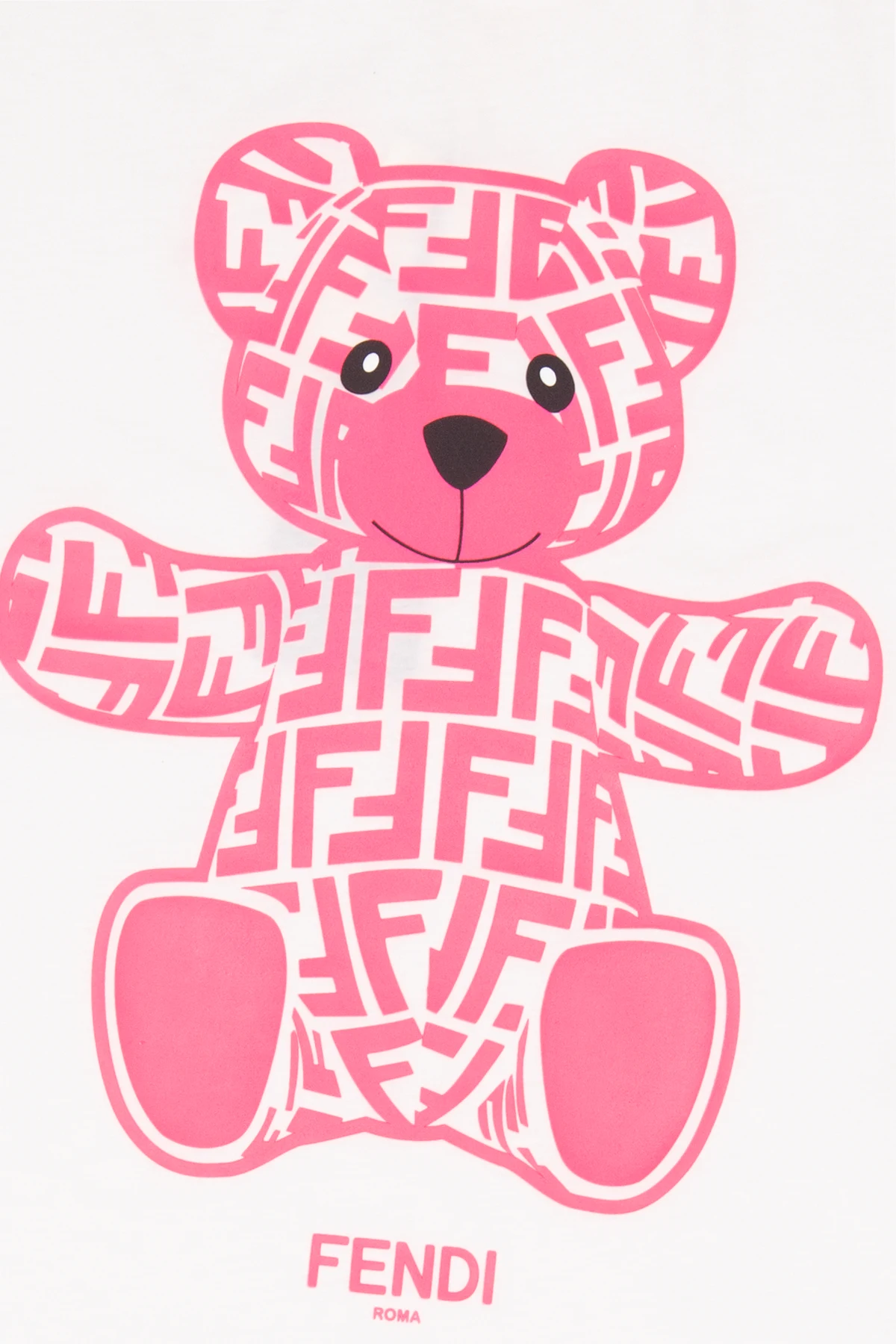 Biały t-shirt Fendi Kids. Wykonany z bawełny. Z przodu neonowa aplikacja w kształcie misia i monogramu oraz logo. Okrągły dekolt wykończony ściągaczem, krótkie rękawy.