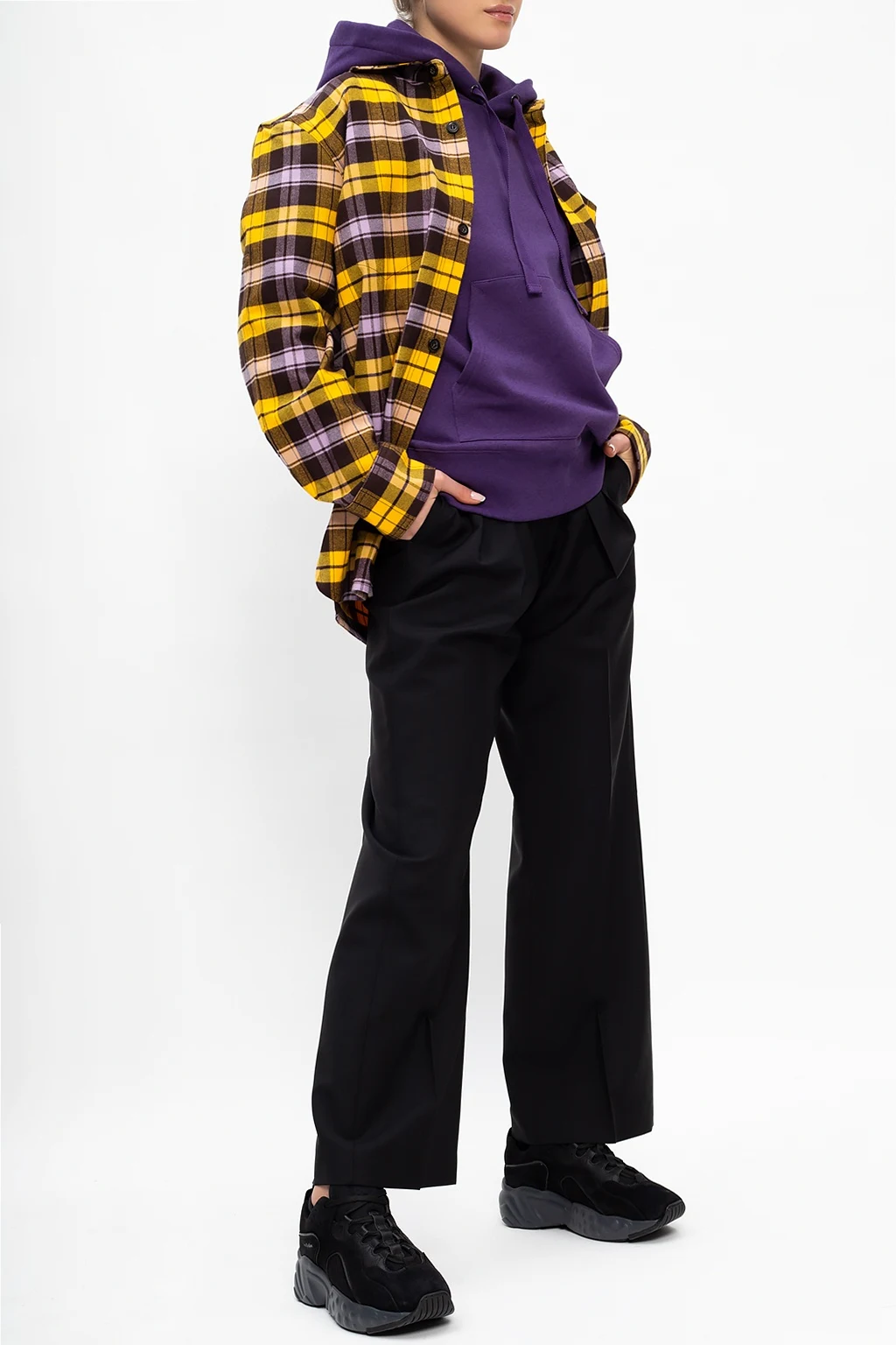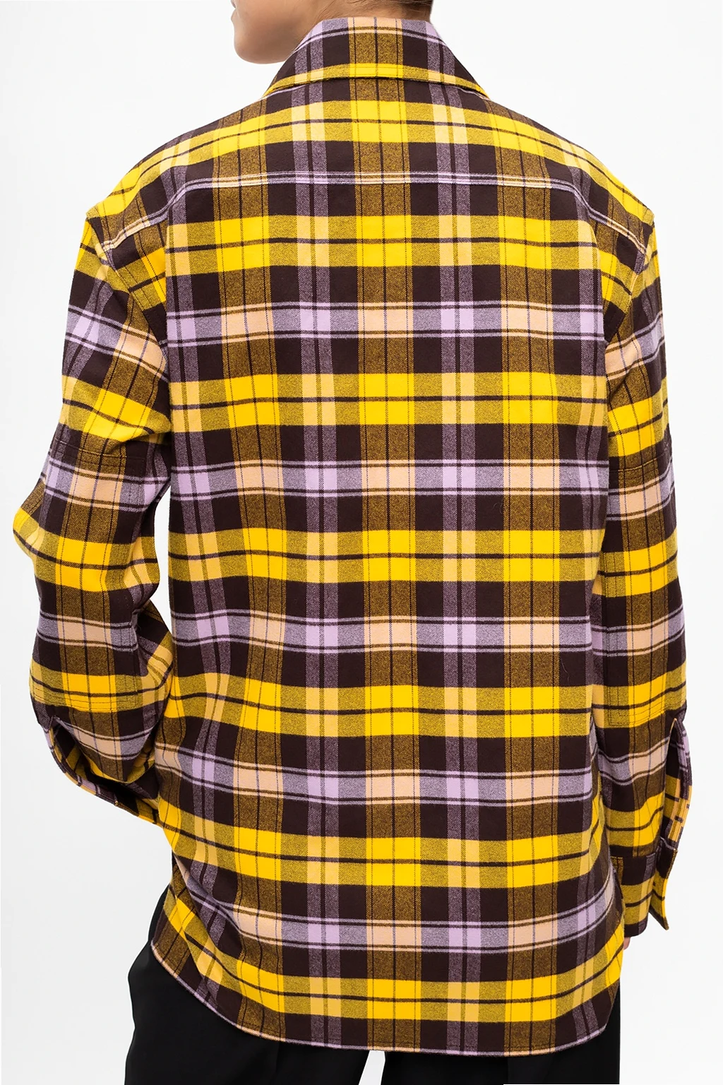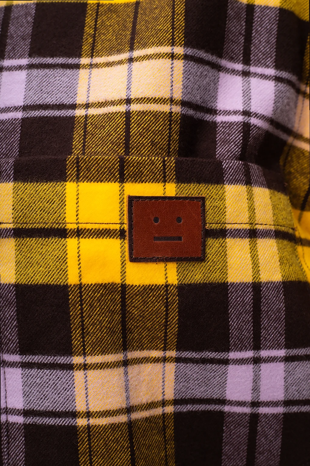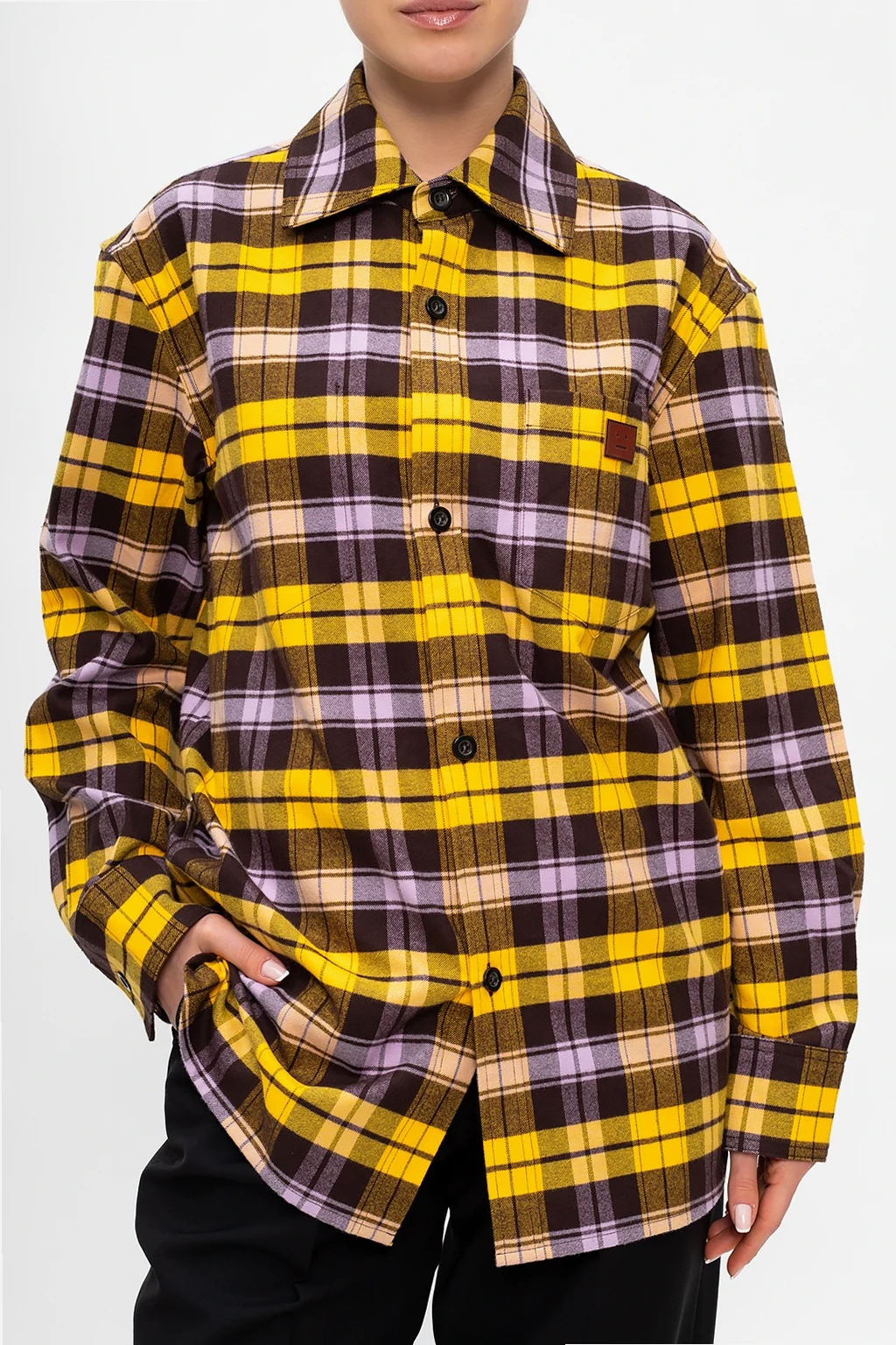 Żółto-fioletowa koszula Acne Studios. Wykonana z bawełny. Ozdobiona wzorem z motywem kraty w kolorze ciemnobrązowym oraz naszywką z logo. Zapinana na guziki. Wsuwana kieszeń. Długie rękawy zakończone mankietami z zapięciem na guzik.
