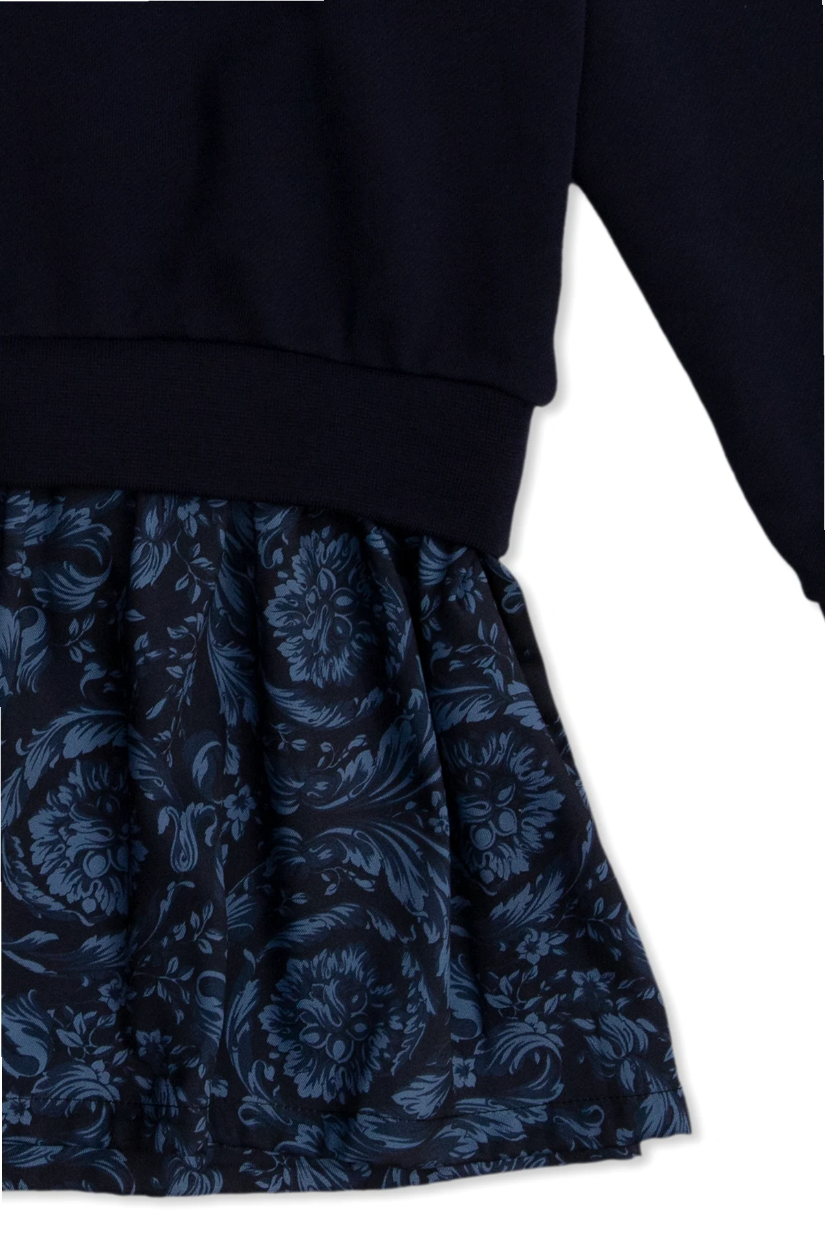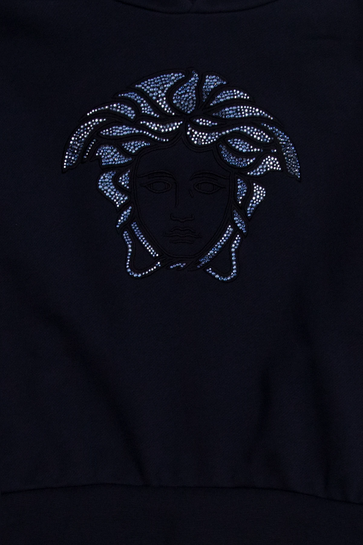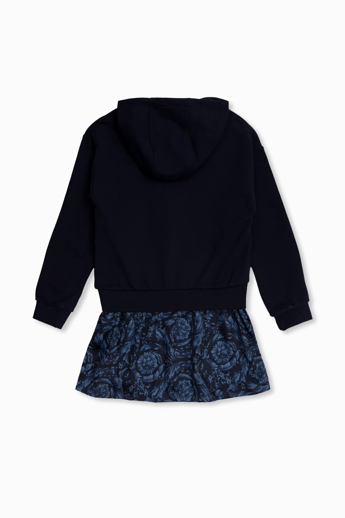 Granatowa sukienka z kapturem Versace Kids. Wykonana z bawełny. Ozdobiona połyskującą aplikacją z motywem charakterystycznej dla marki głowy Meduzy. Długie rękawy zakończone ściągaczem. Dół wykończony satynową spódnicą ozdobioną wzorem ‘Barocco’.