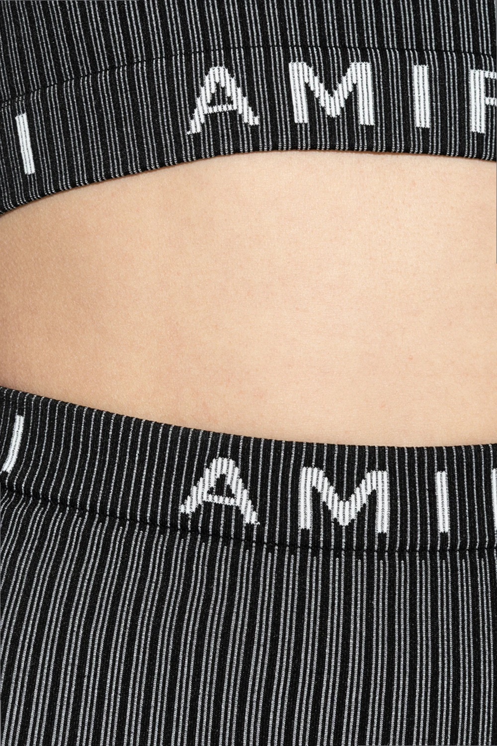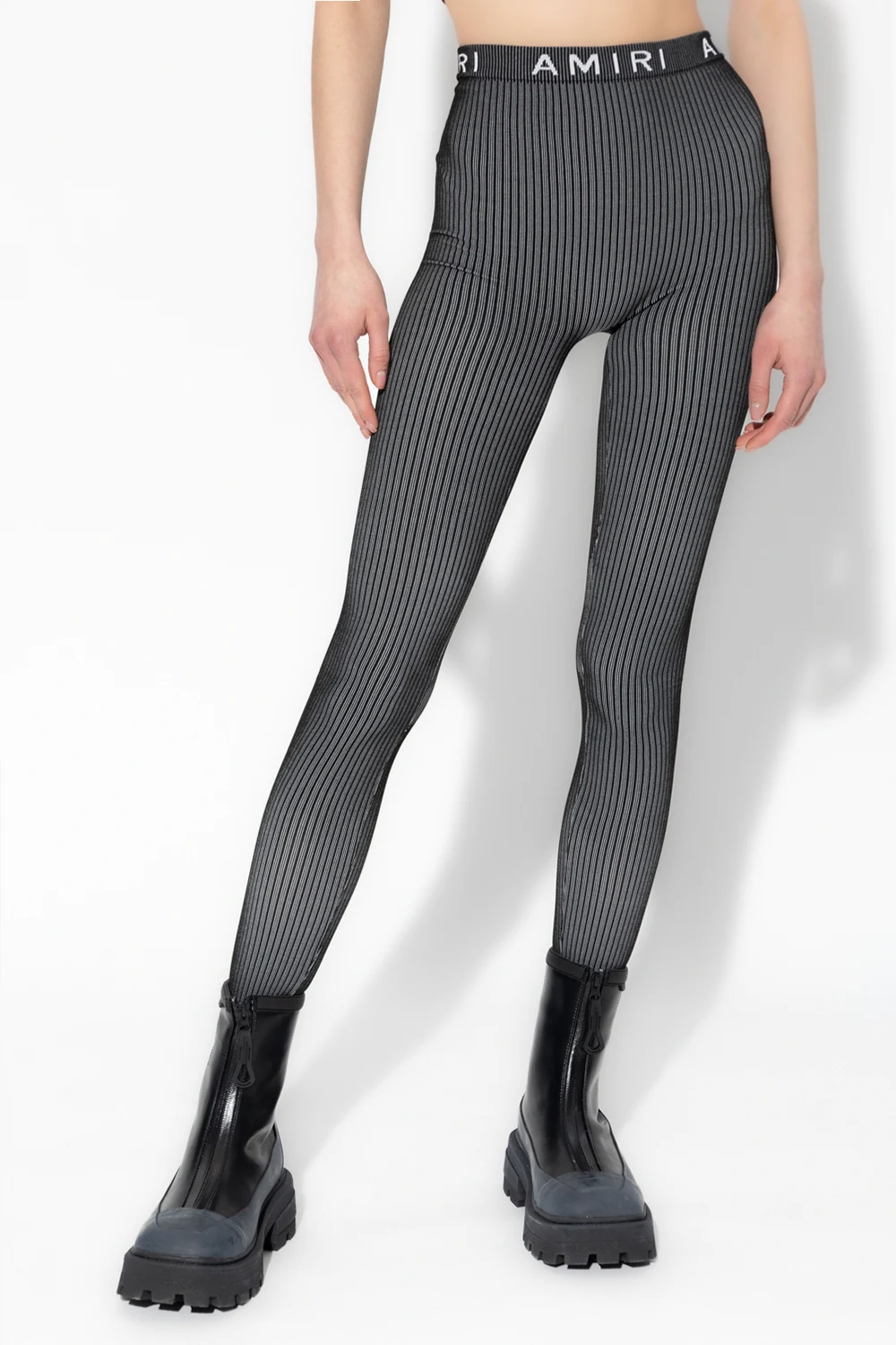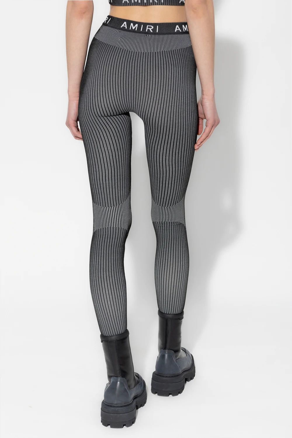 Czarno-białe, prążkowane legginsy Amiri. W pasie guma. Ozdobione logo.