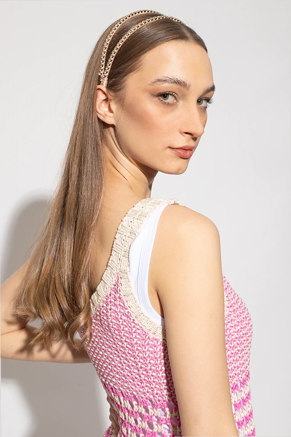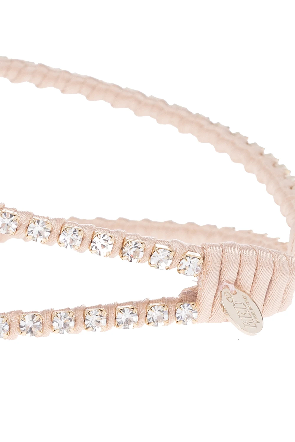Podwójna opaska w kolorze beżowo-złotym Red Valentino. Ozdobiona dekoracyjnie plecioną satyną oraz aplikacjami z połyskującymi kryształami. Ozdobiona zawieszką z wygrawerowanym logo.