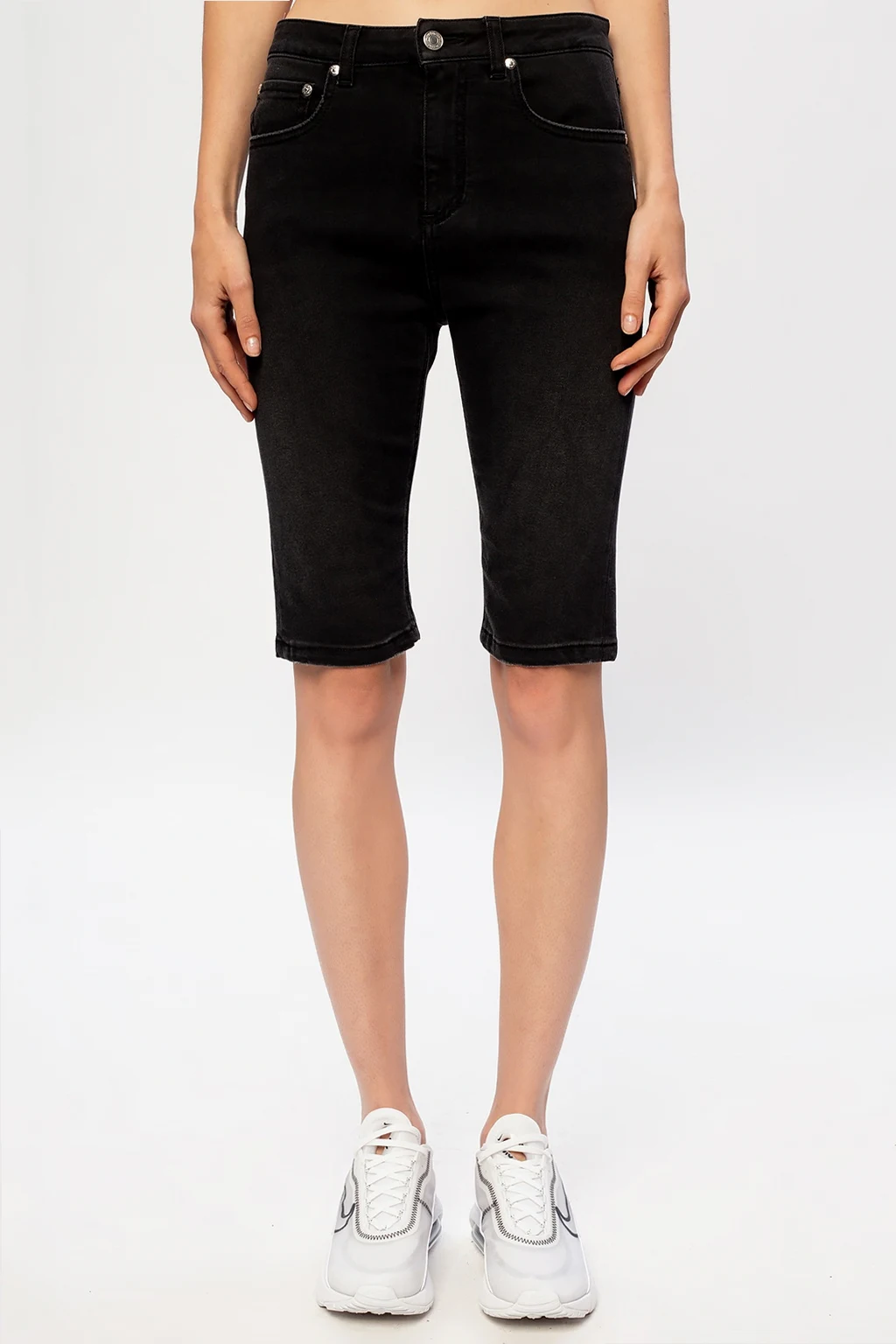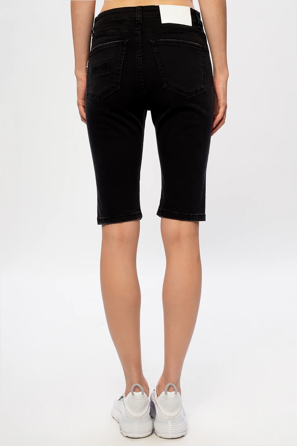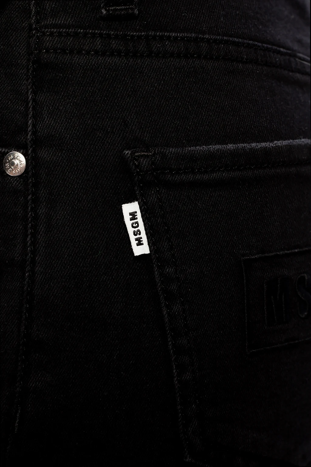 Czarne szorty jeansowe MSGM. Zapinane na zamek oraz na guzik. Ozdobione wyszytym logo. Pięć wsuwanych kieszeni: trzy z przodu oraz dwie z tyłu.