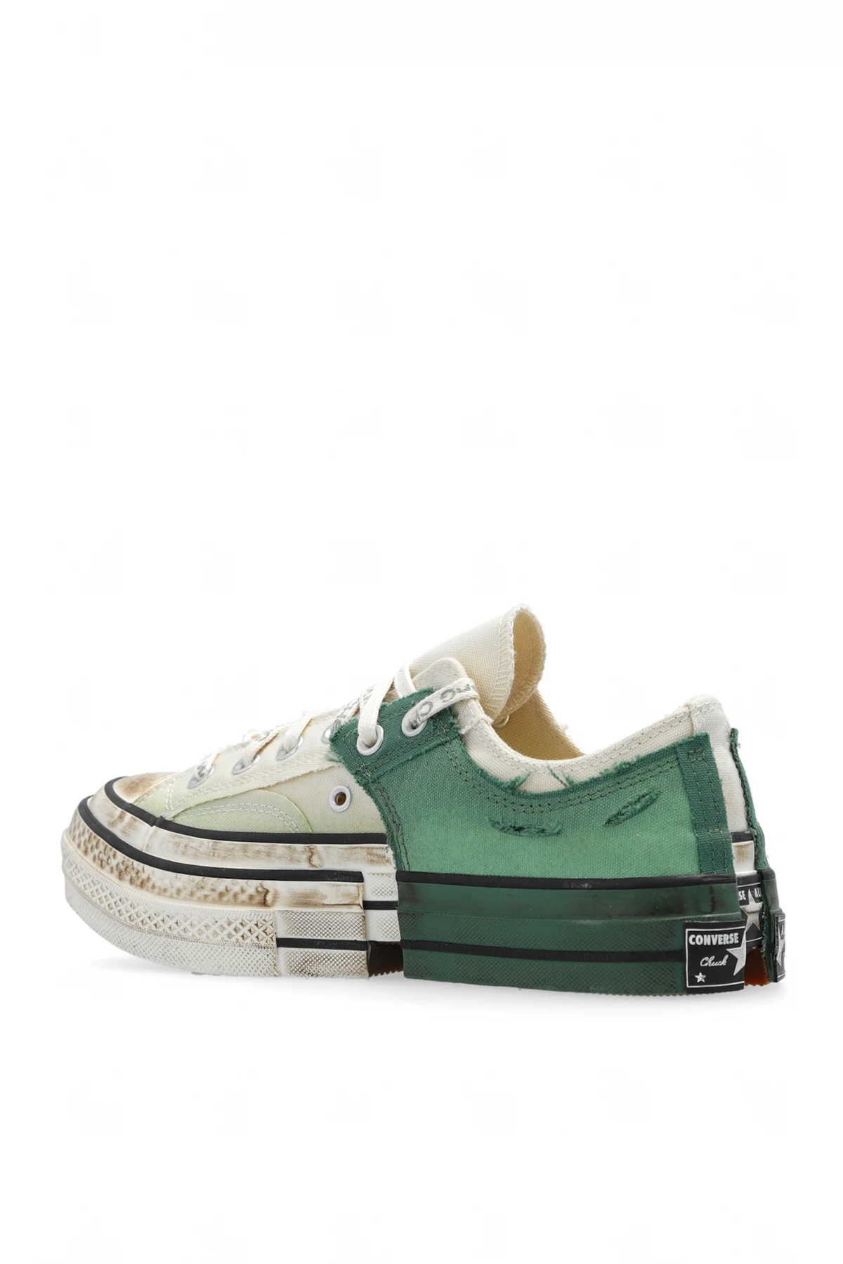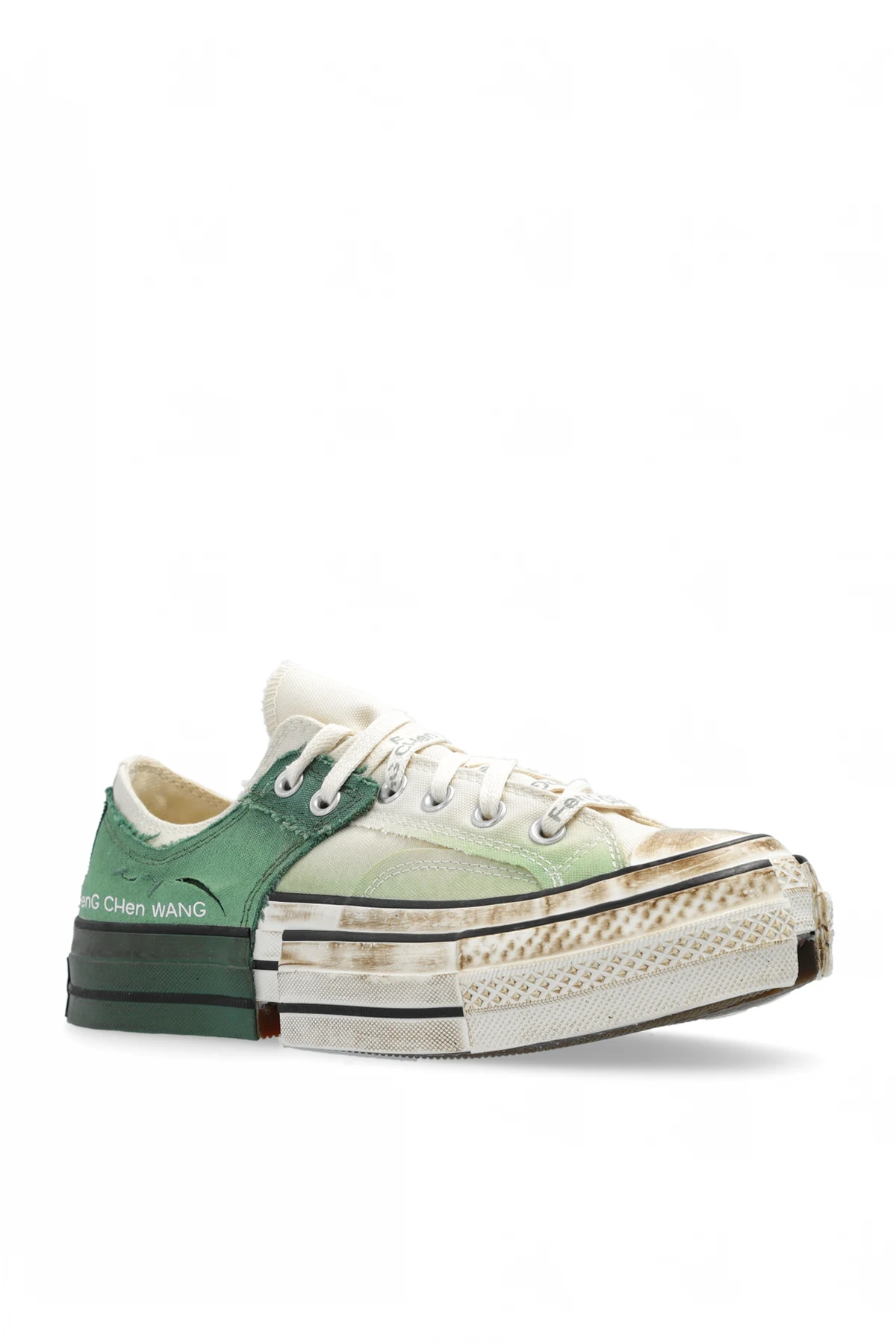 Zielono-białe, sznurowane buty sportowe, model ‘Chuck 70 2-in-1 OX’ Converse x Feng Chen Wang. Wykonane z płótna i wykończone gumą. Charakterystyczne dla projektantki warstwowe projektowanie ożywiające konstrukcję kultowego modelu. Liczne przetarcia, zabrudzenia i przebarwienia nadające efekt ‘vintage’. Ozdobione logo z boku, z tyłu i na sznurowadłach. Kolorowa, dekoracyjnie dzielona podeszwa wykonana z gumy.