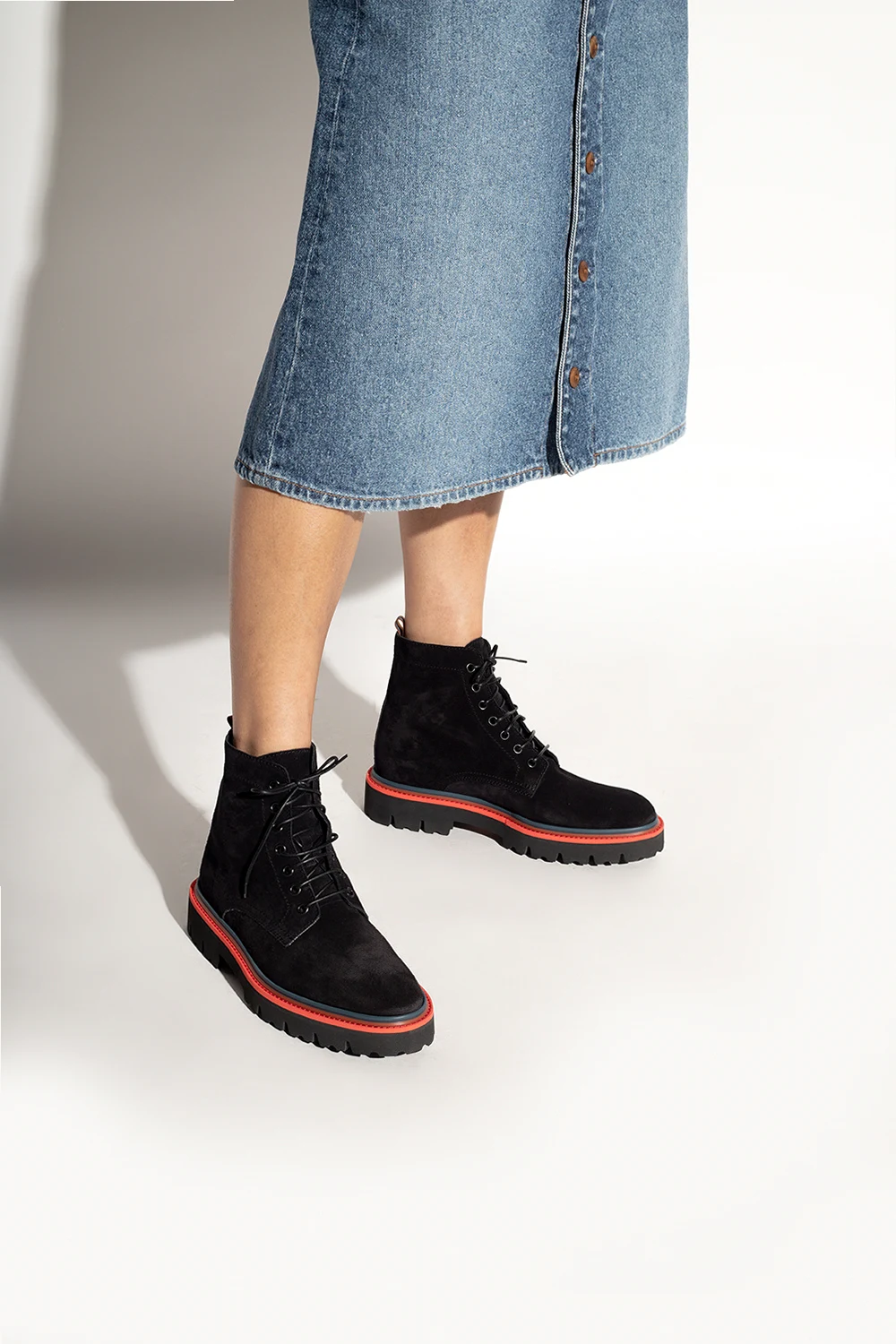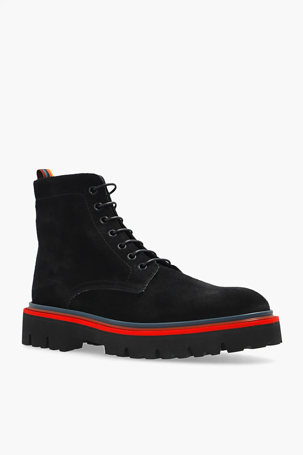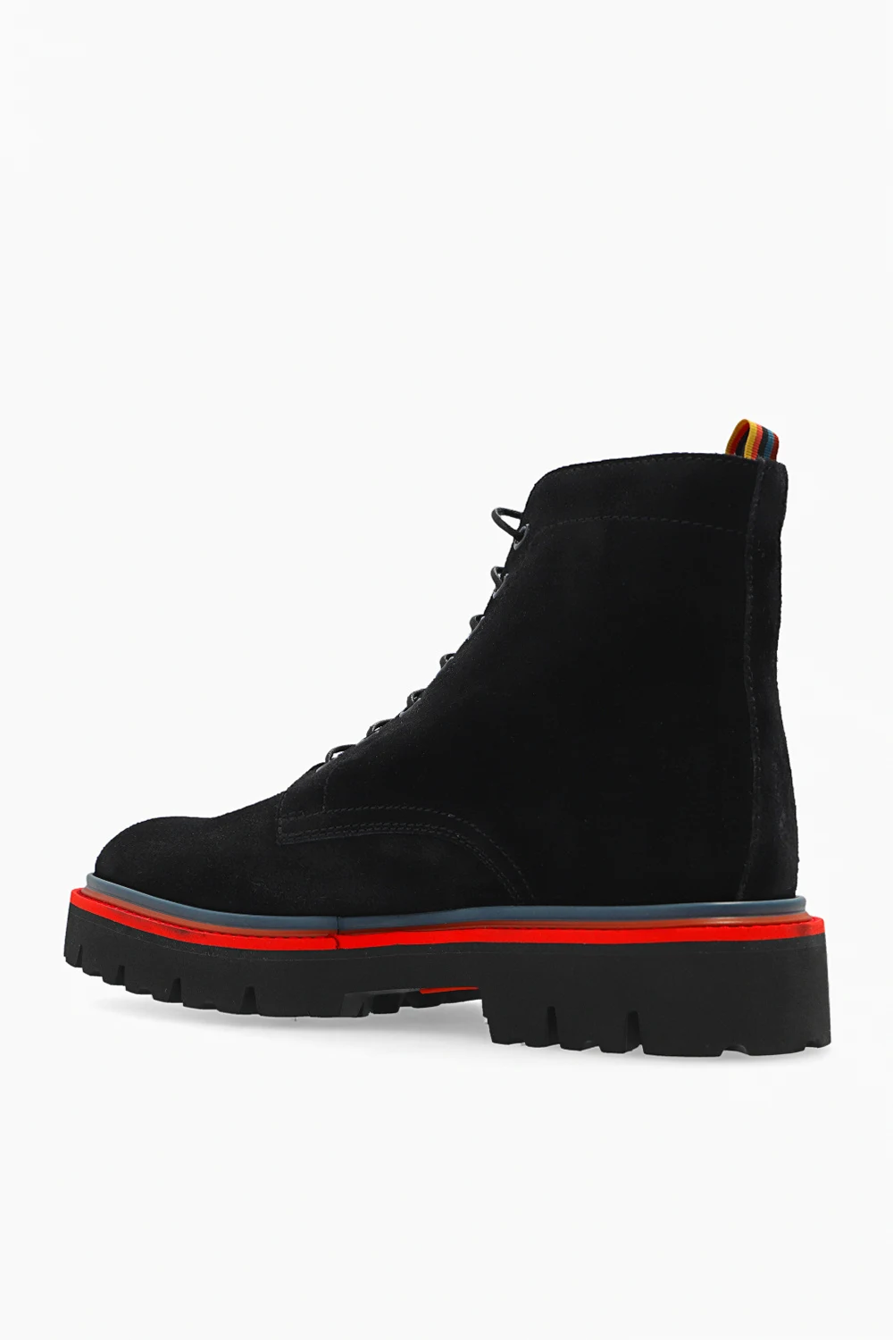 Czarne, sznurowane buty za kostkę Paul Smith. Wykonane ze skóry. Granatowo-czerwona wstawka. Z tyłu charakterystyczny dla marki kolorowy wzór. Czarna, gumowa podeszwa.