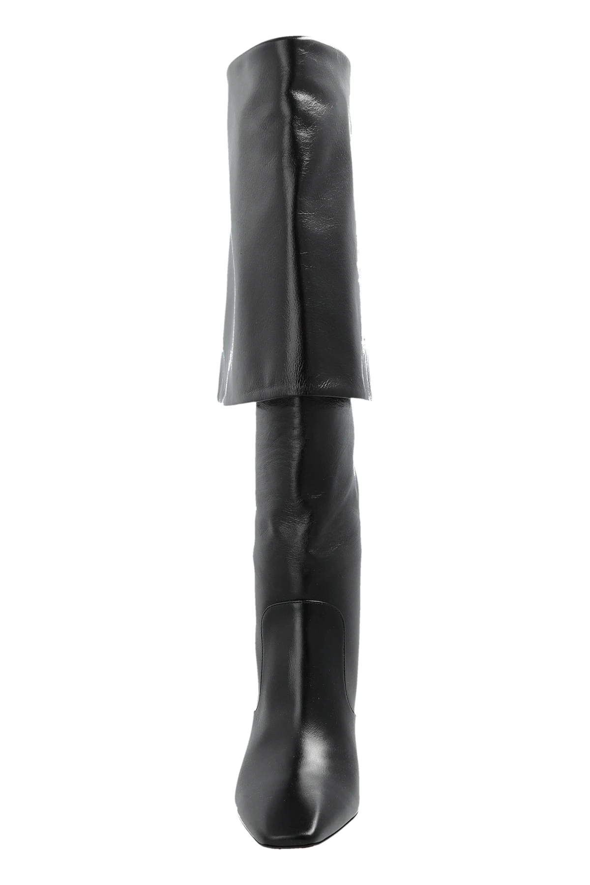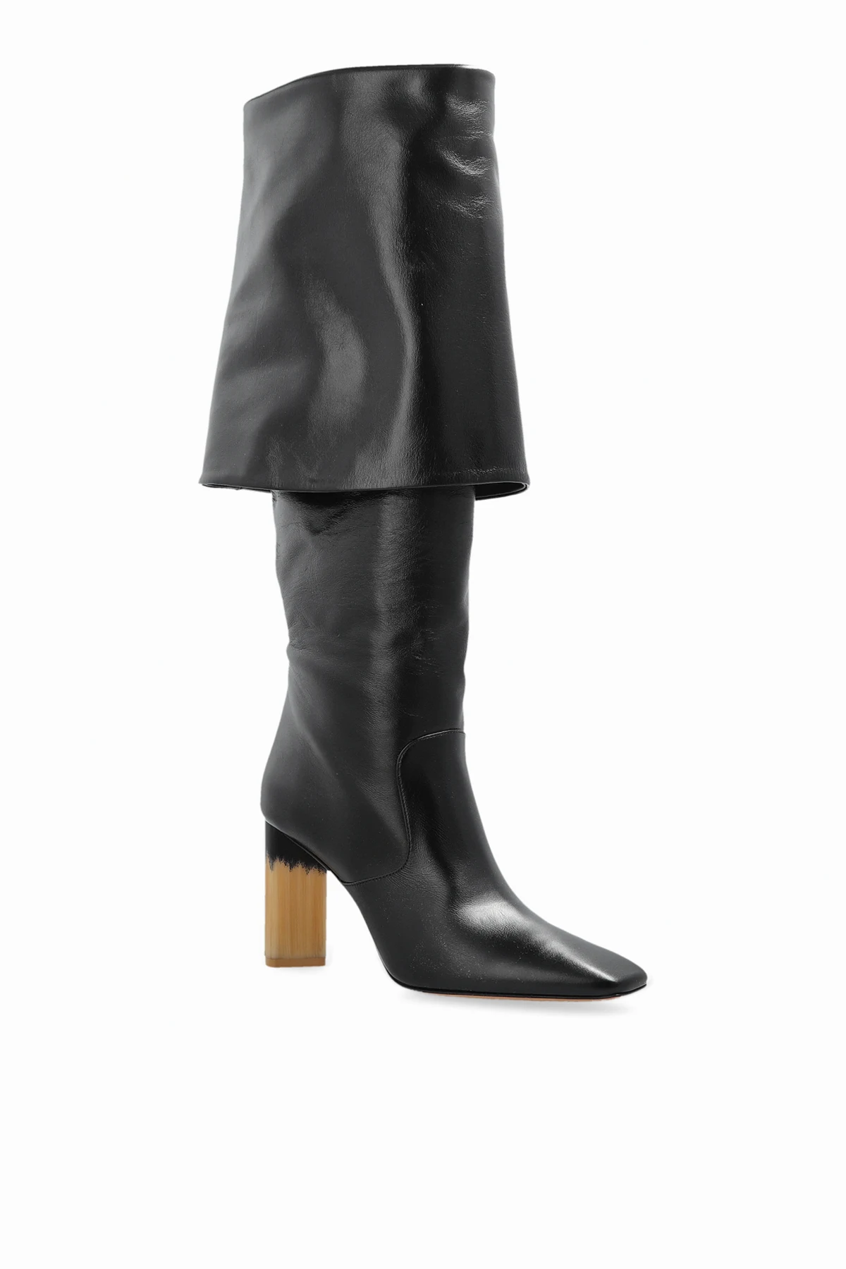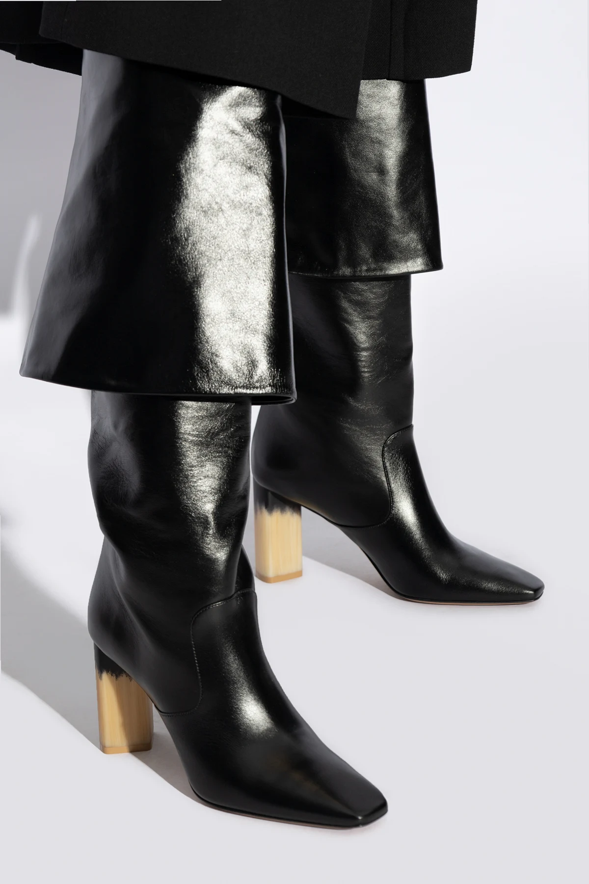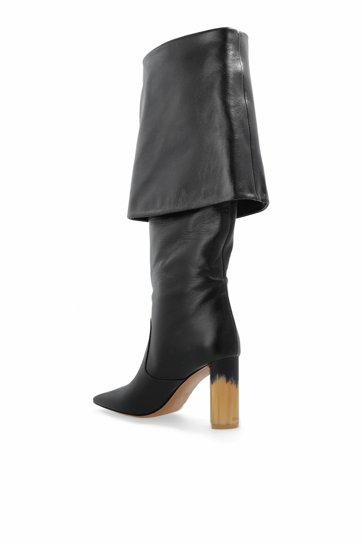 Przedstawiamy Kozaki na obcasie "Georgia" z ekskluzywnej kolekcji paryskiego domu mody Chloé . Te niepowtarzalne buty wykonane są z połyskującej, gładkiej skóry, która gwarantuje nie tylko wyrafinowany wygląd, ale także trwałość i komfort noszenia.