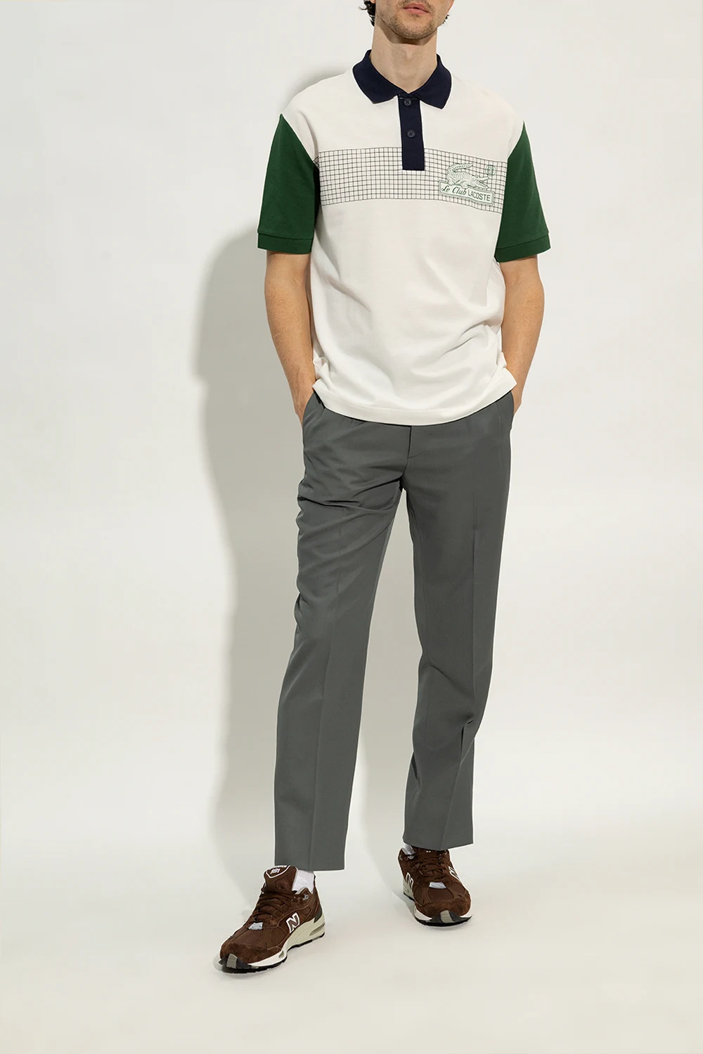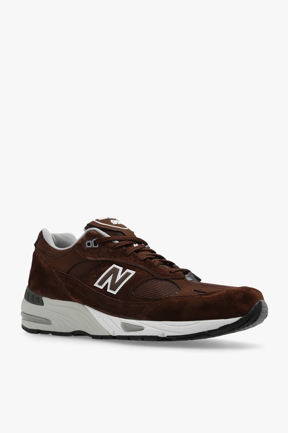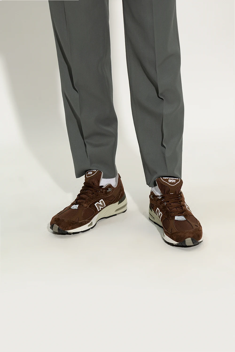 Brązowo-szare, sznurowane buty sportowe, model ‘M991BGW’ New Balance. Wykonane z zamszu, wykończone materiałem. Ozdobione naszywkami z logo. Z przodu i z tyłu haft z logo. Czarno-szara, gumowa podeszwa.
