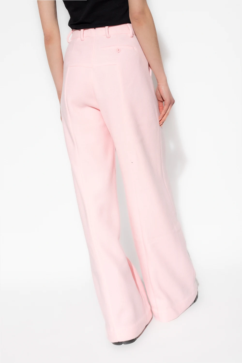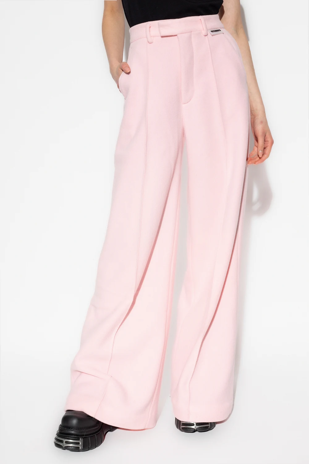 Jasnoróżowe spodnie w kant VETEMENTS. Wykonane z polaru. Zapinane w talii na zamek, zaczepy oraz guzik. Z przodu gumowa naszywka z logo. Cztery kieszenie: dwie wsuwane z przodu oraz dwie zapinane na guzik z tyłu. Długie, szerokie nogawki.