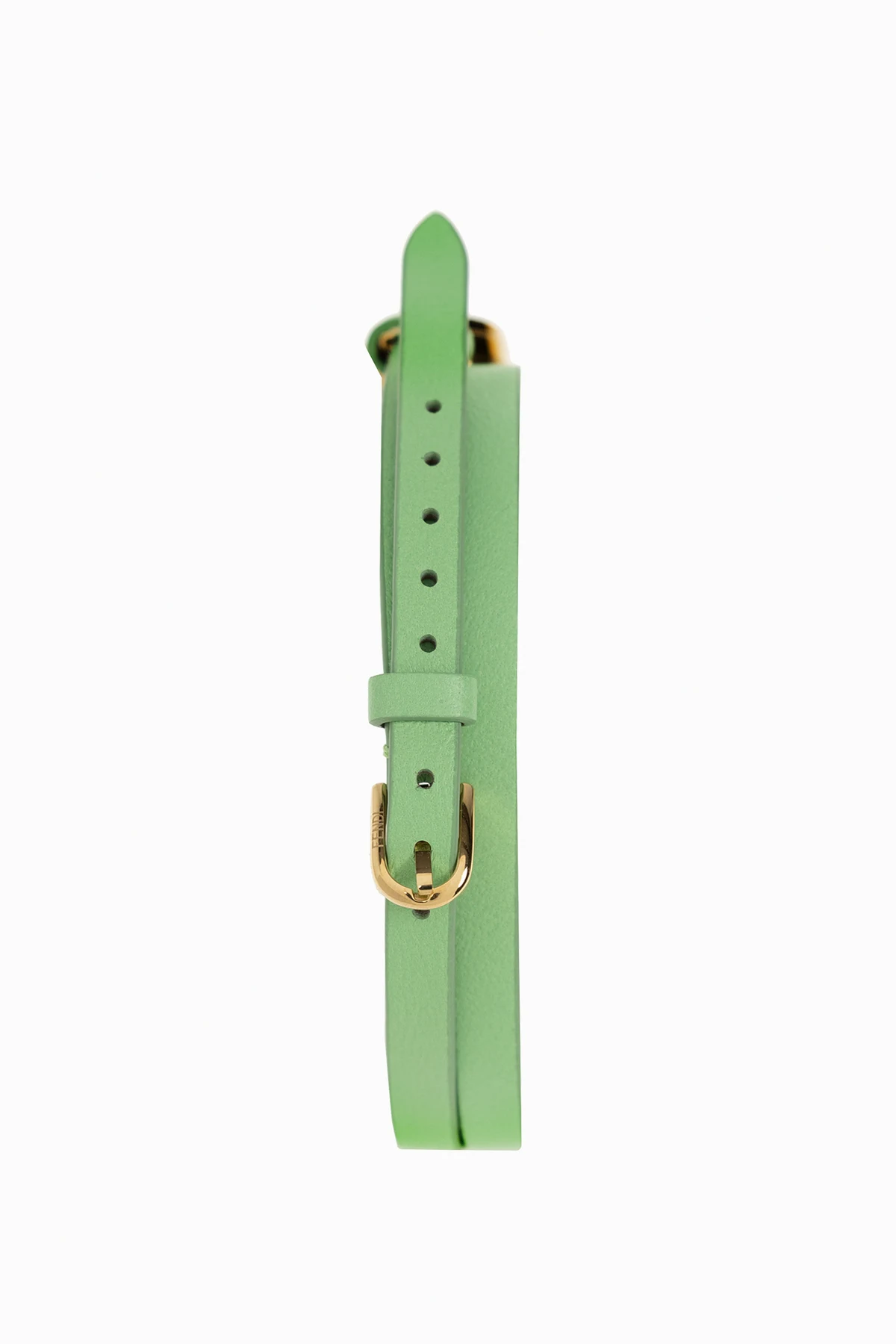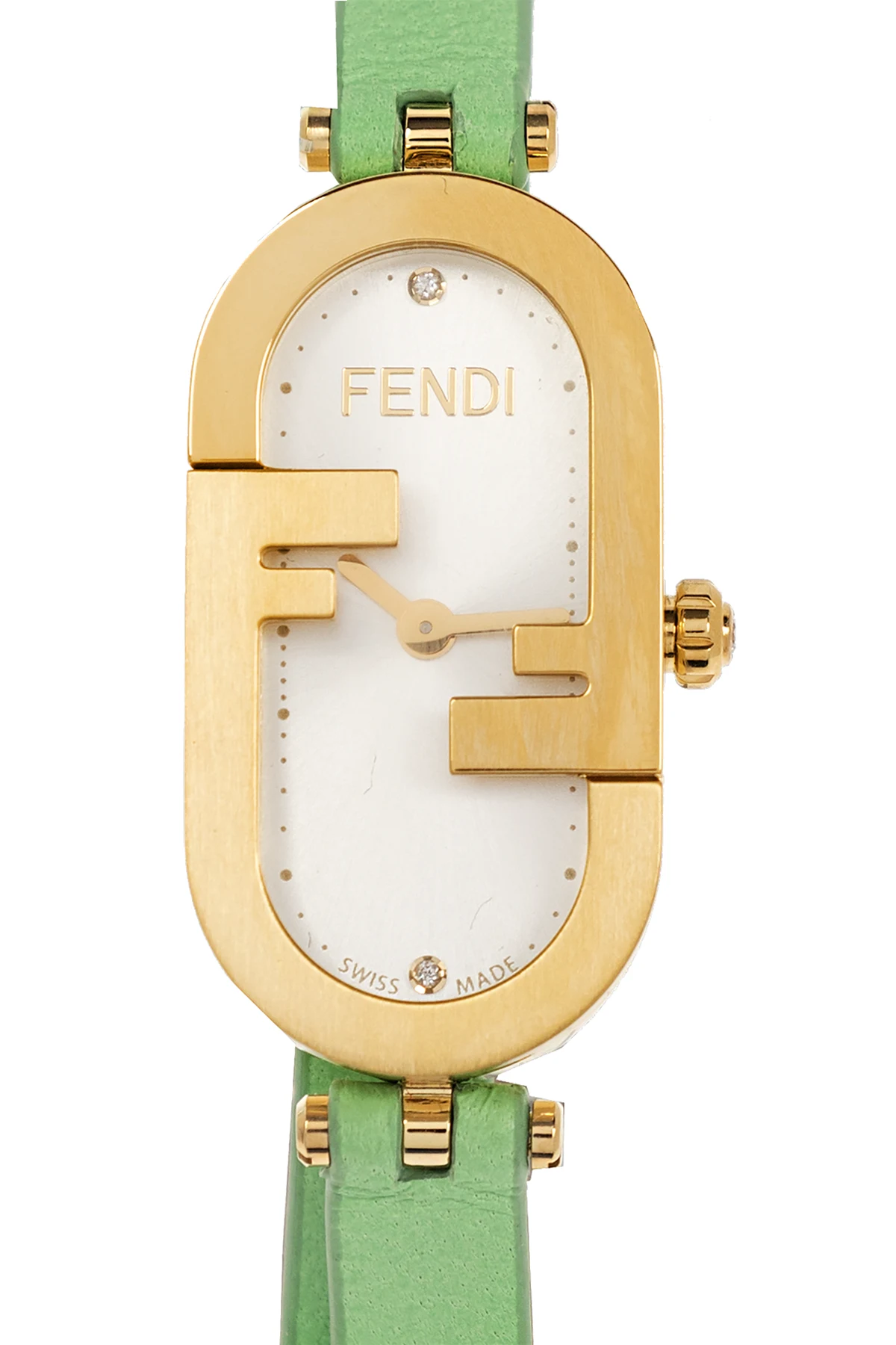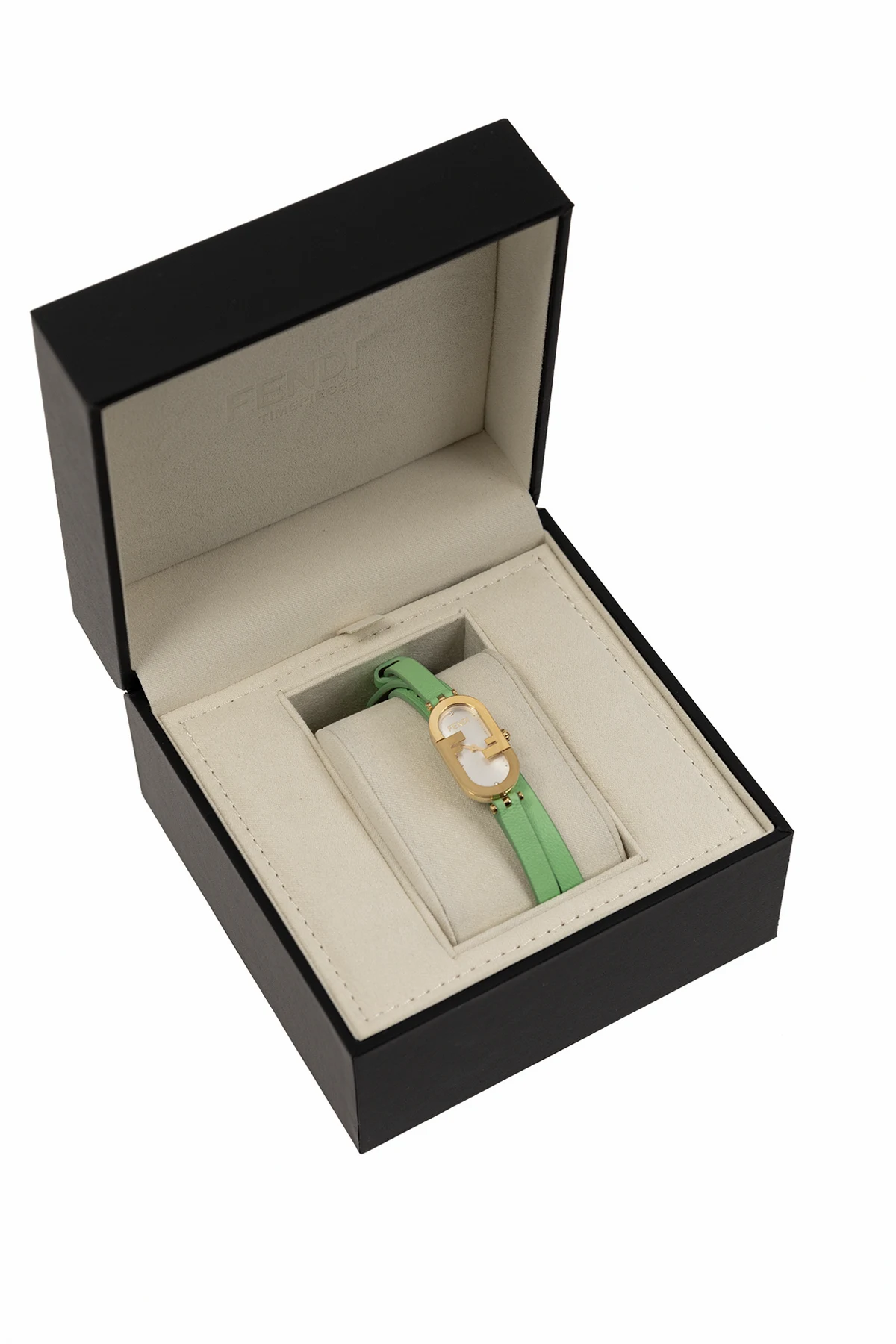 Automatyczny zegarek, model ‘Fendi O’Lock’ Fendi. Koperta ze stali nierdzewnej w kolorze złotym ozdobiona logo. Korona wysadzana diamentem o masie około 0,02 karata. Tarcza w kolorze srebrnym z osadzonymi diamentami na godzinie 12 i 6 o łącznej masie około 0,01 karata i aplikacją z logo. Regulowany pasek ze skóry cielęcej w kolorze jasnozielonym z zapięciem na klamrę.