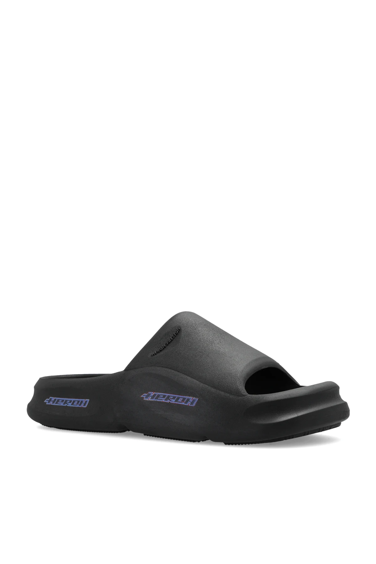 Czarne klapki o dekoracyjnym kształcie Heron Preston. Ozdobione kolorowym nadrukiem z logo. Czarna, gumowa podeszwa.