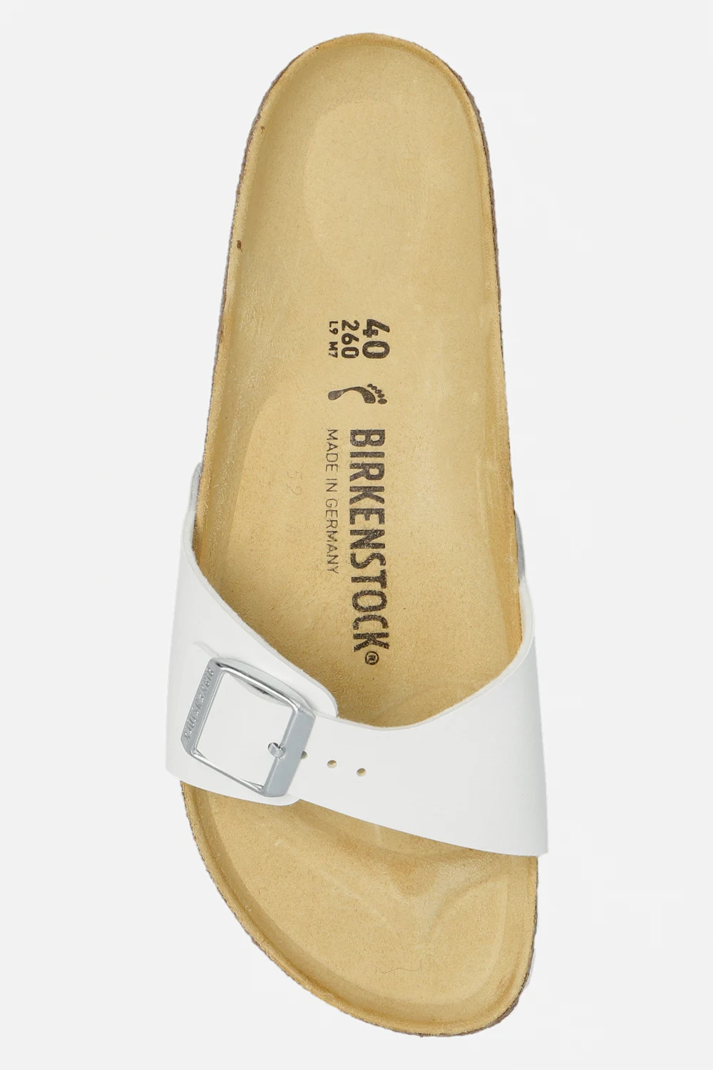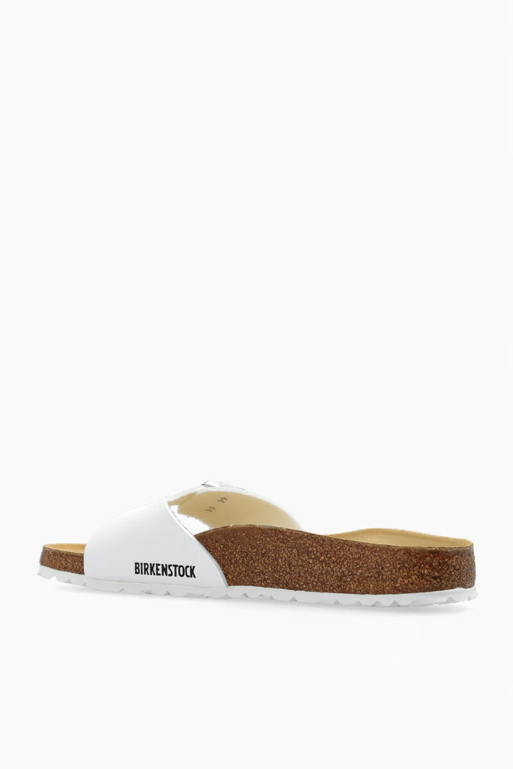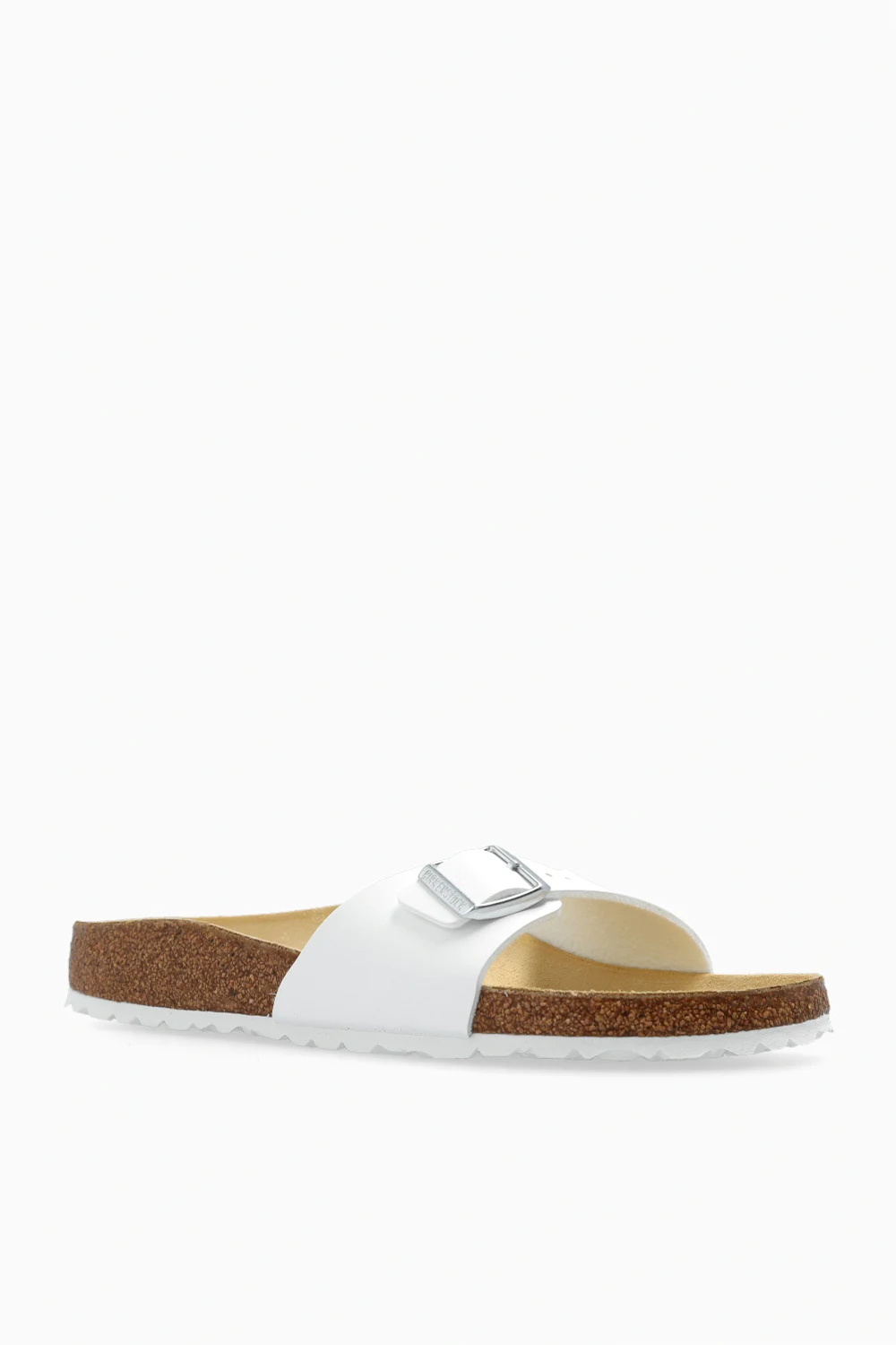 Białe klapki, model ‘Madrid BS’ Birkenstock. Wykonane z przyjaznego dla skóry materiału Birko-Flor®. Regulowany pasek z klamrą z logo. Biało-brązowa podeszwa wykonana z naturalnego korka oraz pianki EVA.
