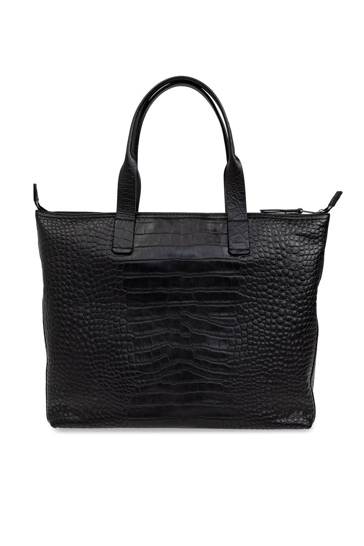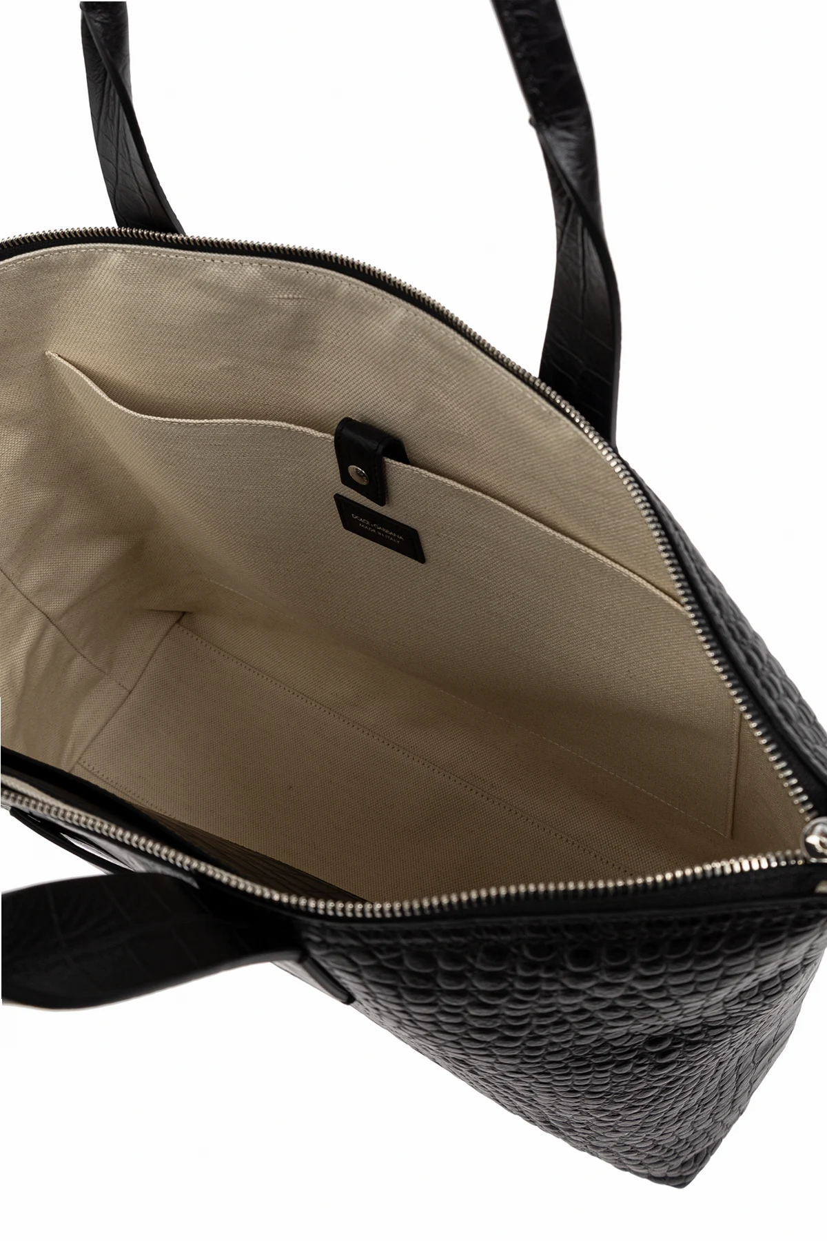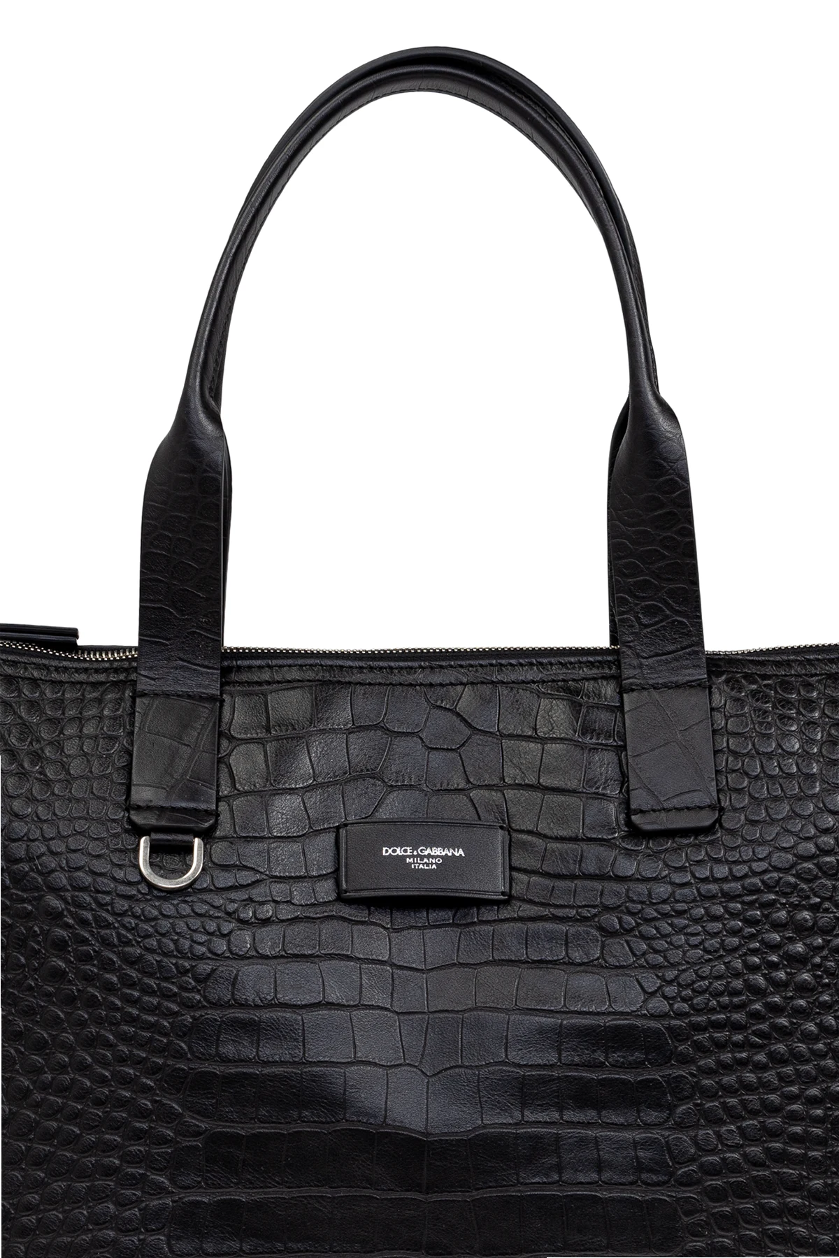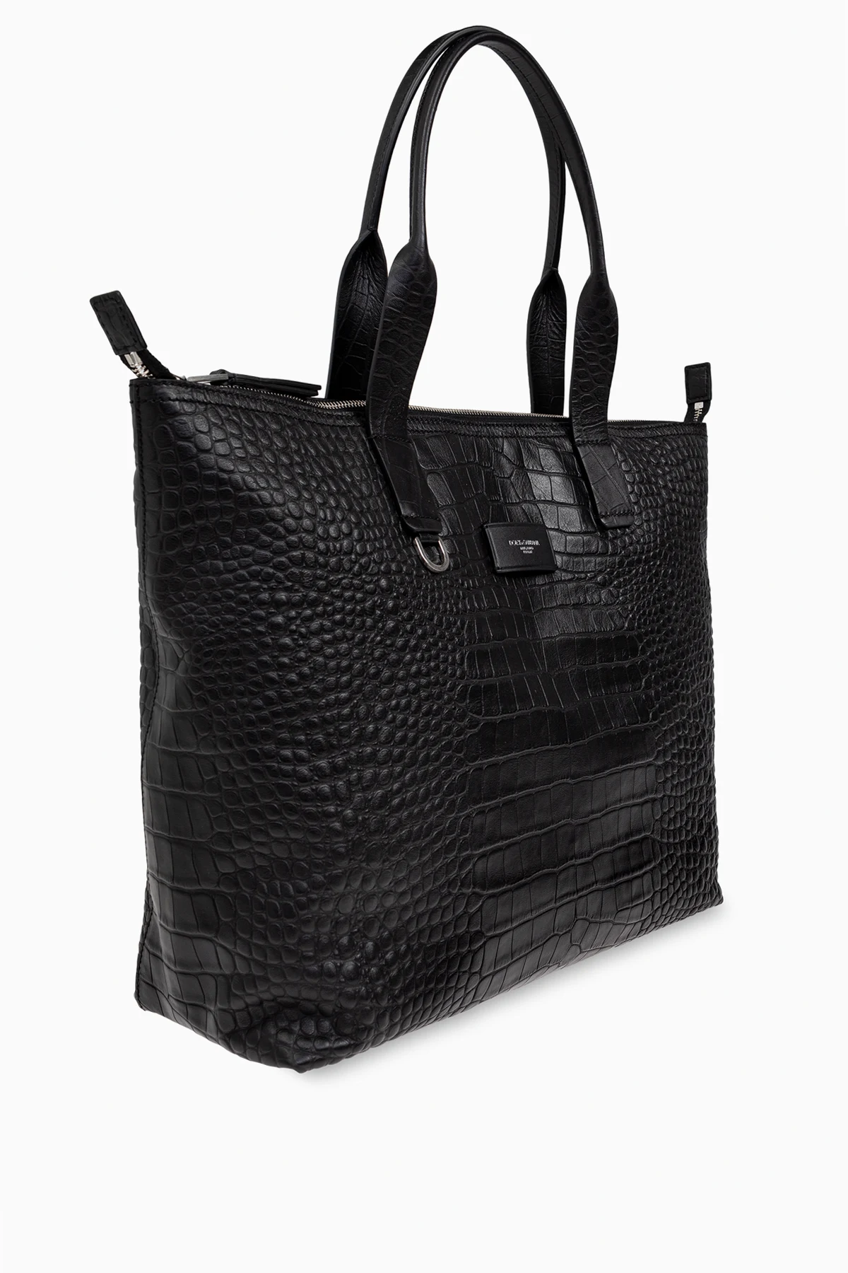 Odkryj niezrównaną elegancję i luksus, które oferuje Skórzana torba typu shopper od renomowanego domu mody Dolce & Gabbana . Ta czarna torba, wykonana z najwyższej jakości skóry o wypukłej fakturze przypominającej skórę krokodyla, stanowi kwintesencję stylu i klasy.