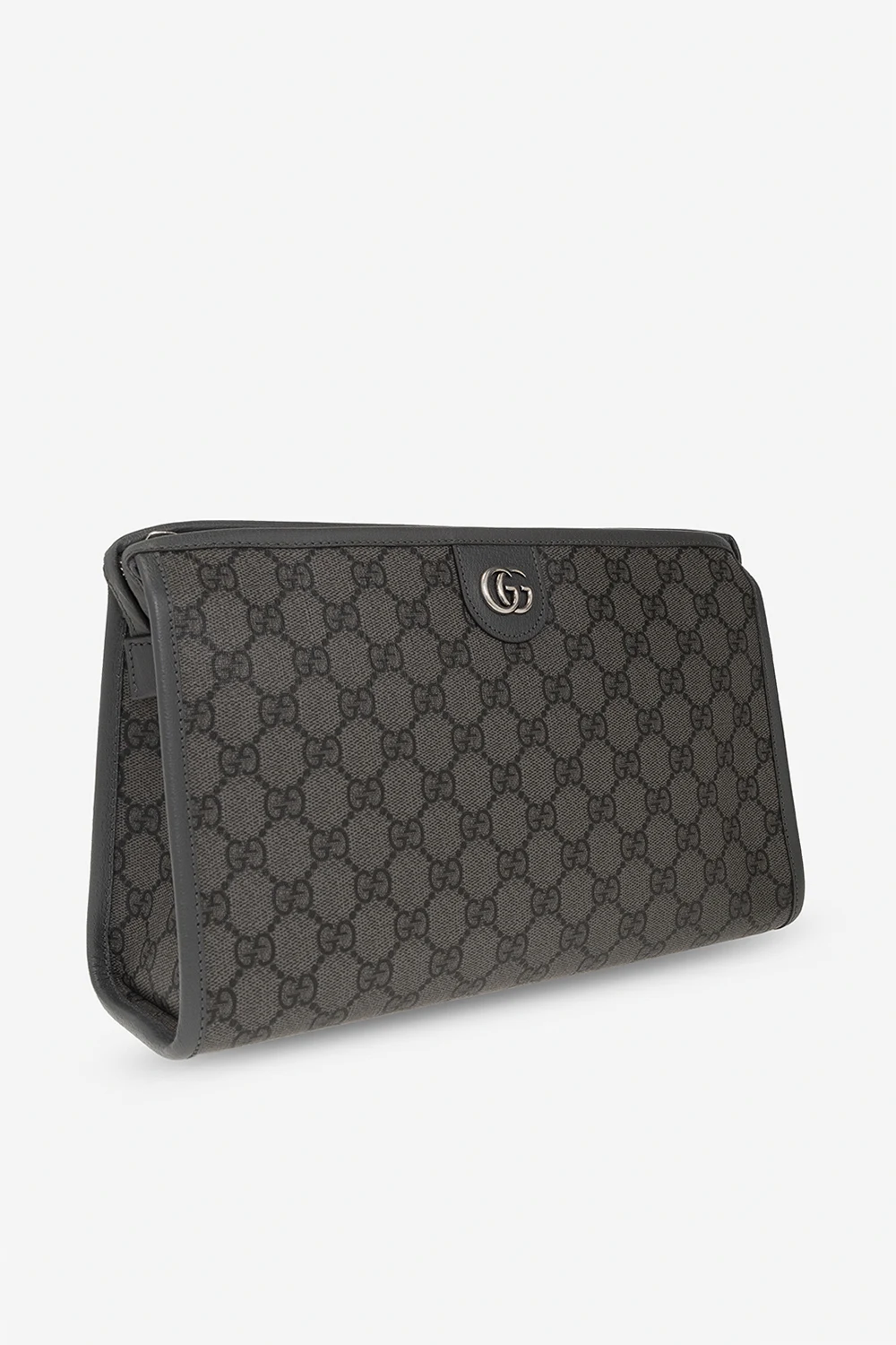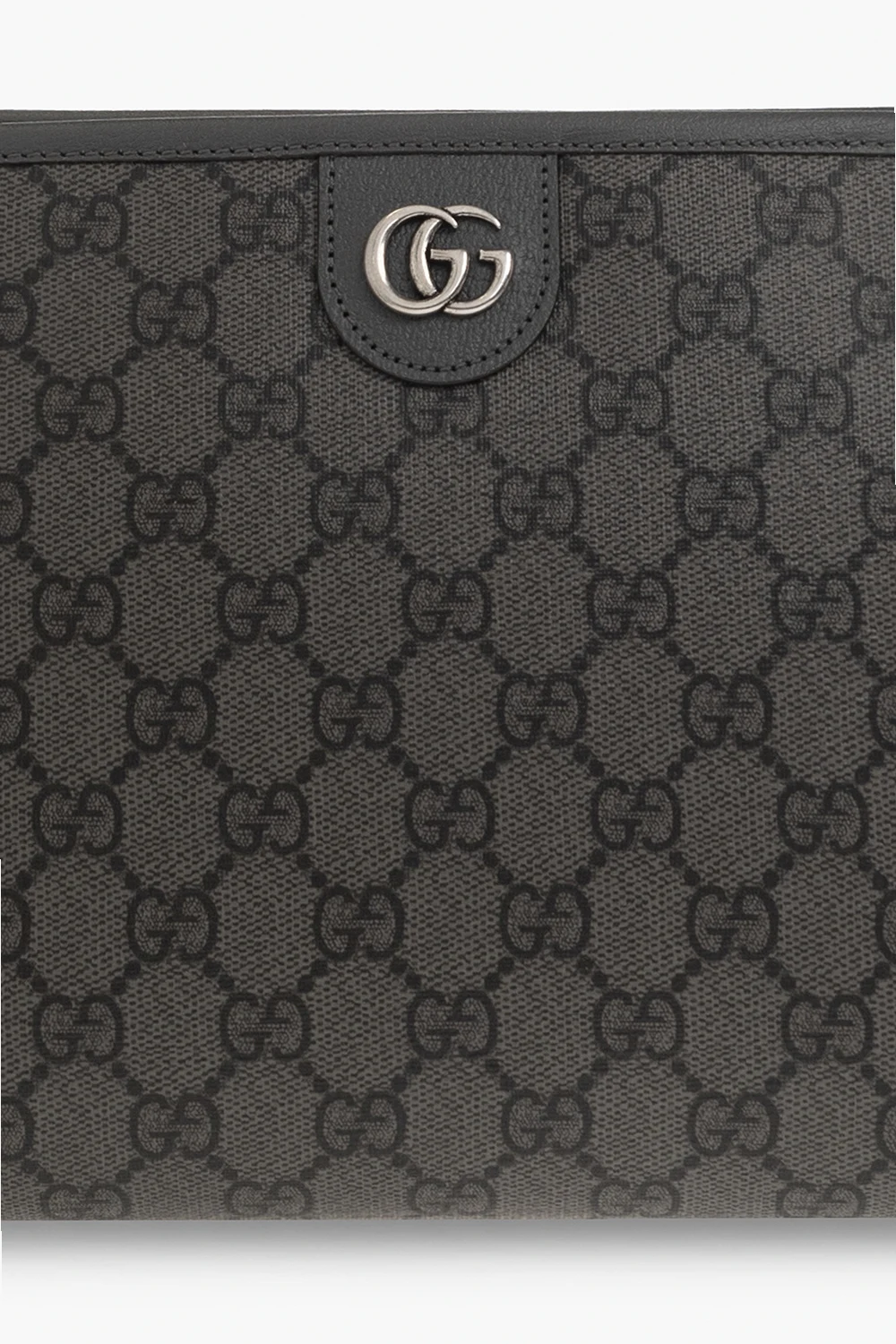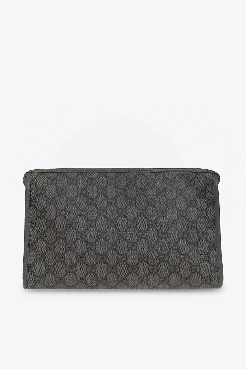 Ciemnoszara kosmetyczka Gucci. Wykonana z charakterystycznego dla marki płótna ‘GG Supreme’ i wykończona skórą. Zamykana na zamek. Z boku zamknięcie na zatrzaski. Z przodu metalowa aplikacja w kolorze srebrnym. Wewnątrz komora z kieszenią zamykaną na zamek. Metalowe wykończenie w kolorze srebrnym.