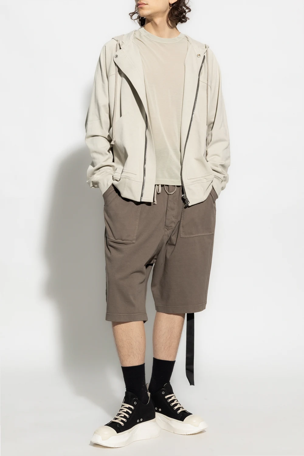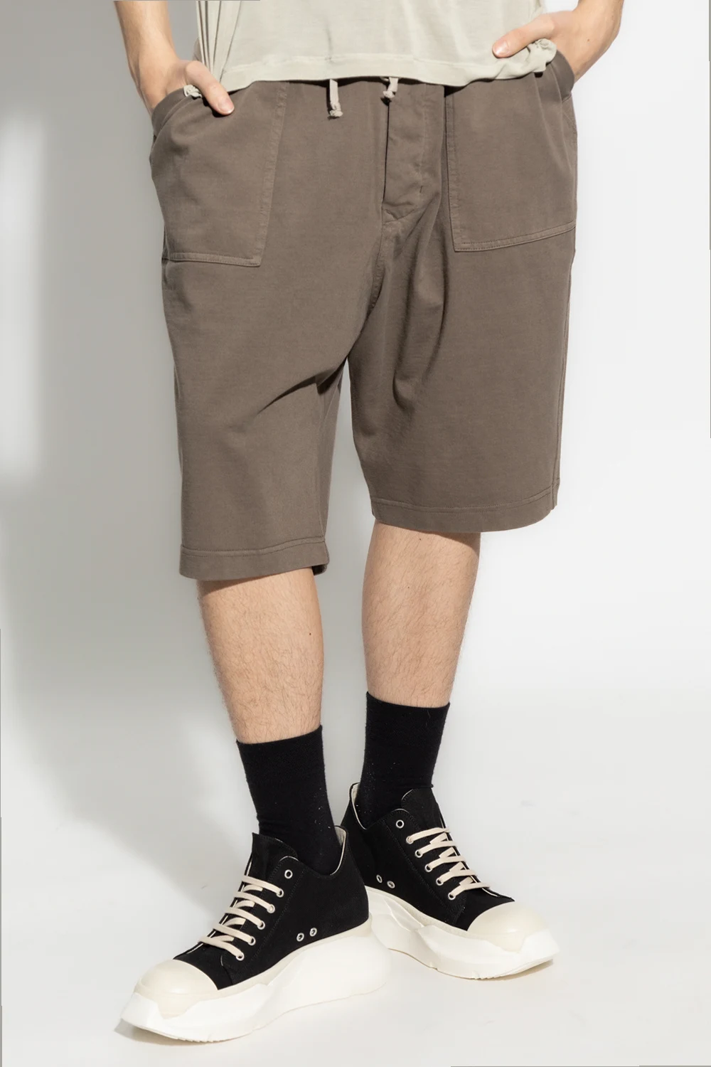 Beżowoszare, bawełniane szorty Rick Owens DRKSHDW. W pasie ściągane beżowymi trokami. Z przodu dwie kieszenie. Z tyłu dwie kieszenie z patką zapinaną na rzep. Długi, czarny, charakterystyczny pasek z logo.