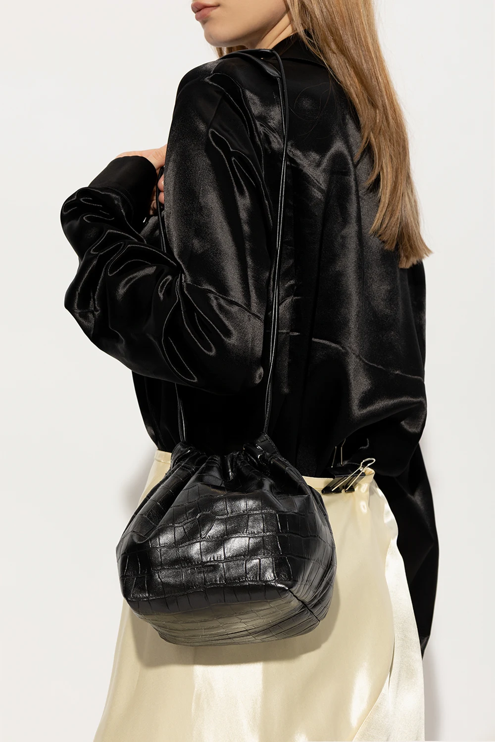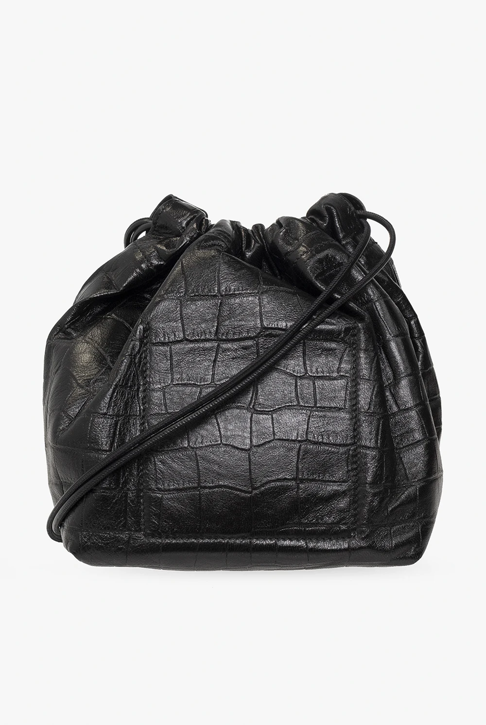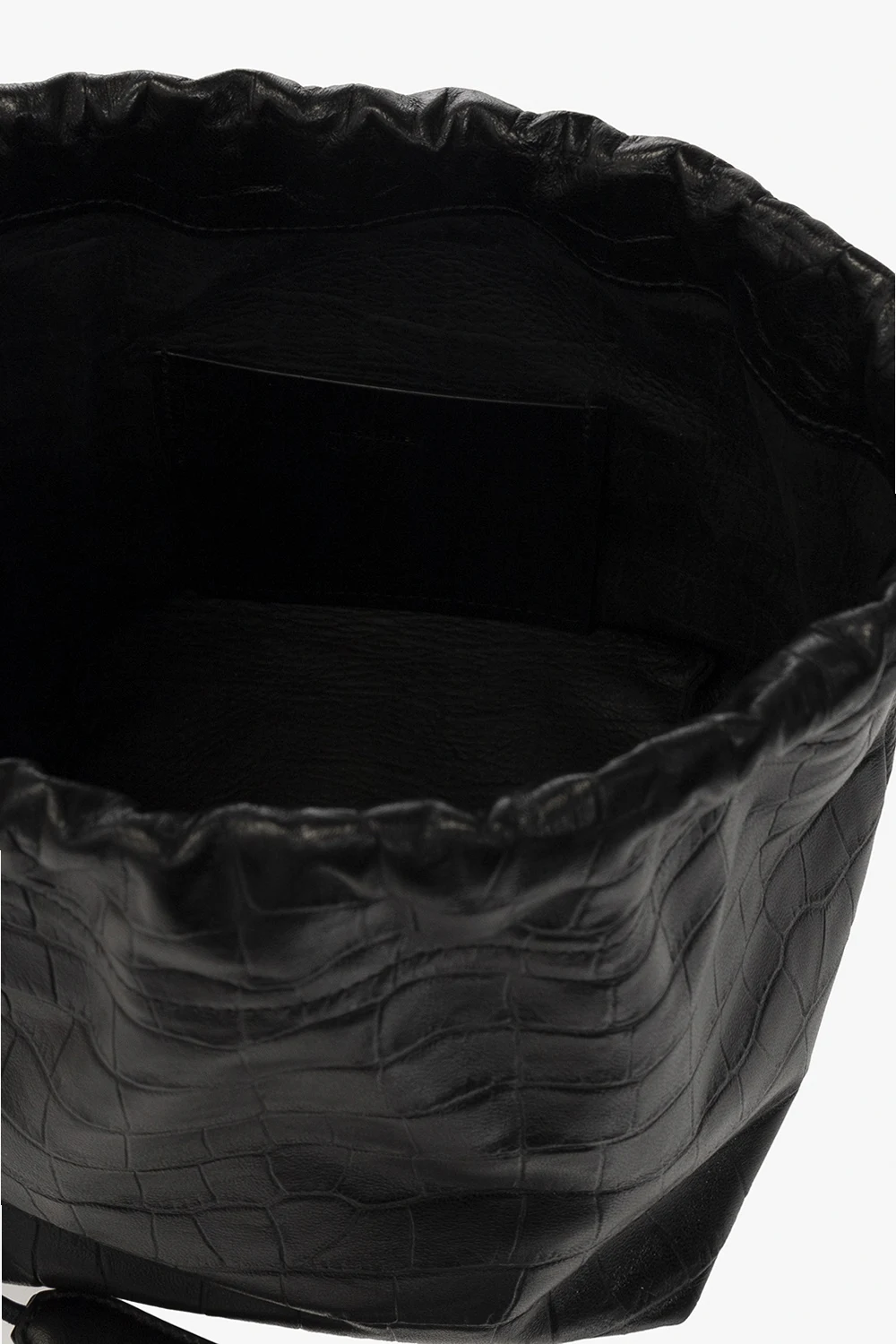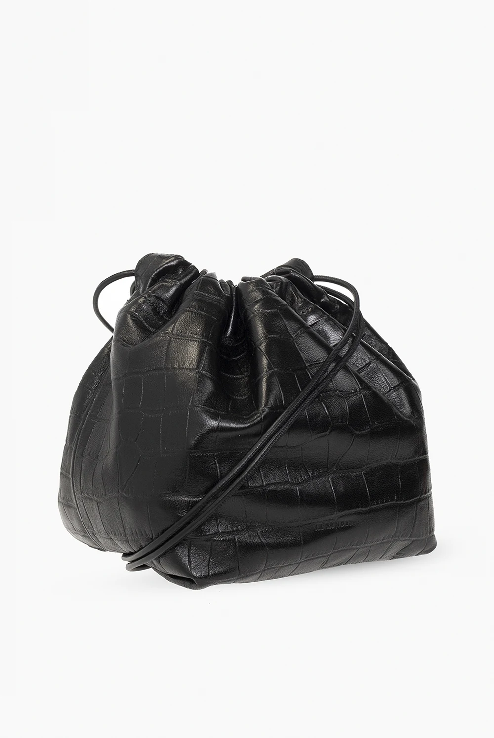 Czarna torba na ramię typu ‘bucket’ Jil Sander. Wykonana ze skóry jagnięcej imitującej skórę krokodyla. Góra ściągana paskiem na ramię. Z przodu wytłoczone logo. Wewnątrz komora i wsuwana kieszeń.