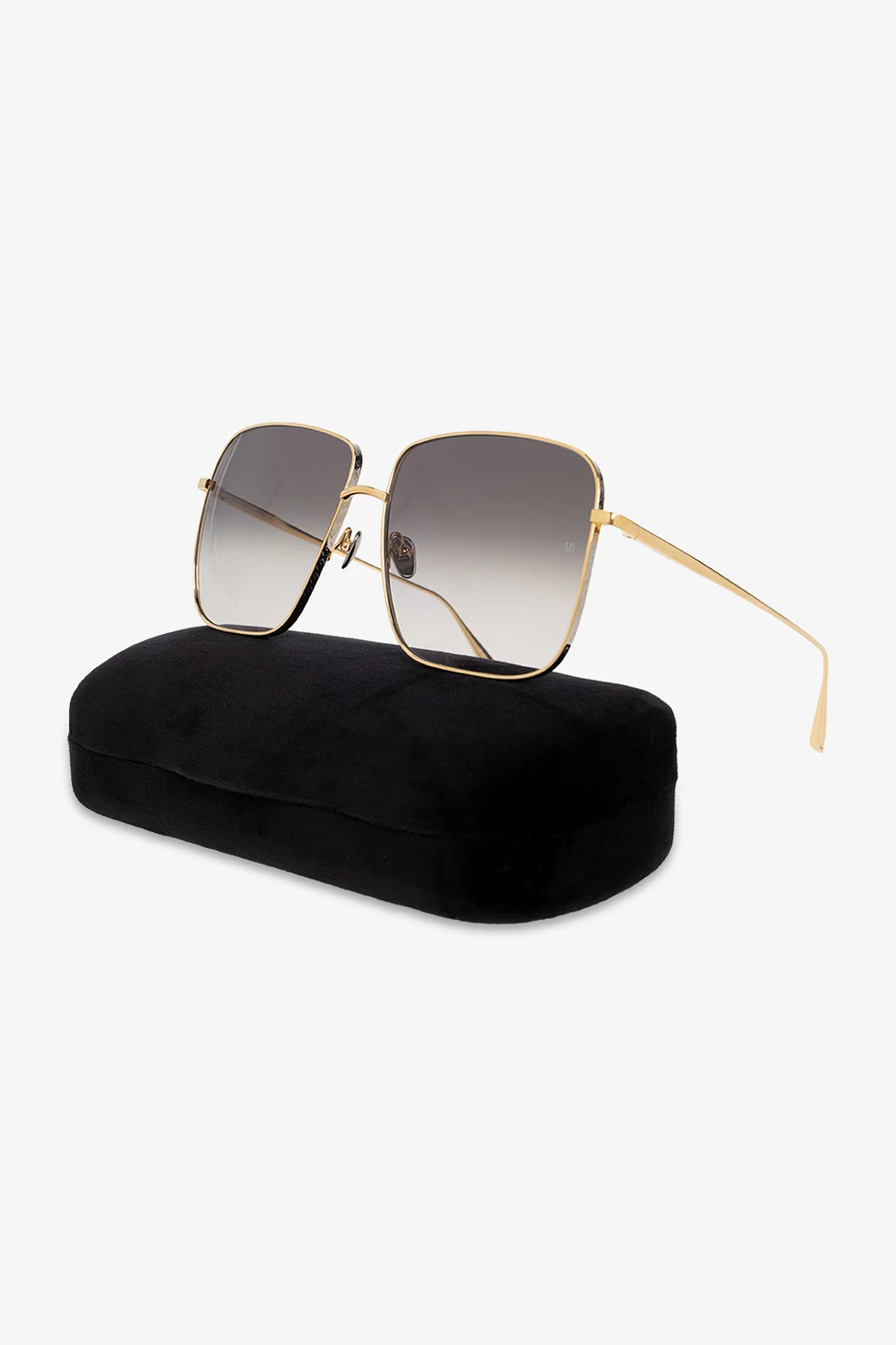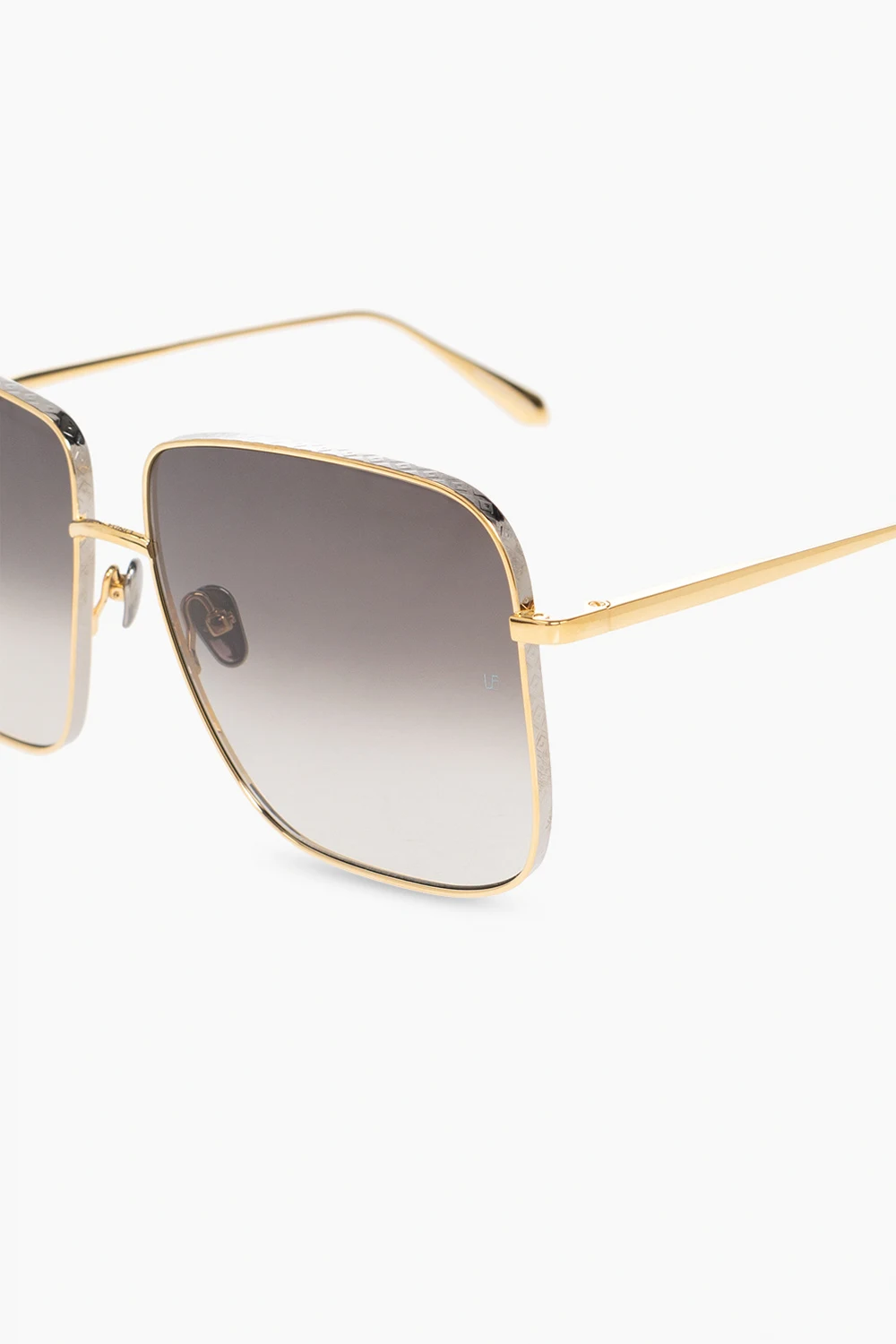 Okulary przeciwsłoneczne w kolorze złoto-srebrnym, model ‘Andoa’ Linda Farrow. Wykonane z czystego, japońskiego tytanu pokrytego 22-karatowym złotem. Kwadratowe oprawki. Mostek z delikatnym logo. Szare, gradientowe soczewki w technologii ZEISS, zapewniające ochronę przed odblaskami i 100% ochronę przed promieniowaniem UV.