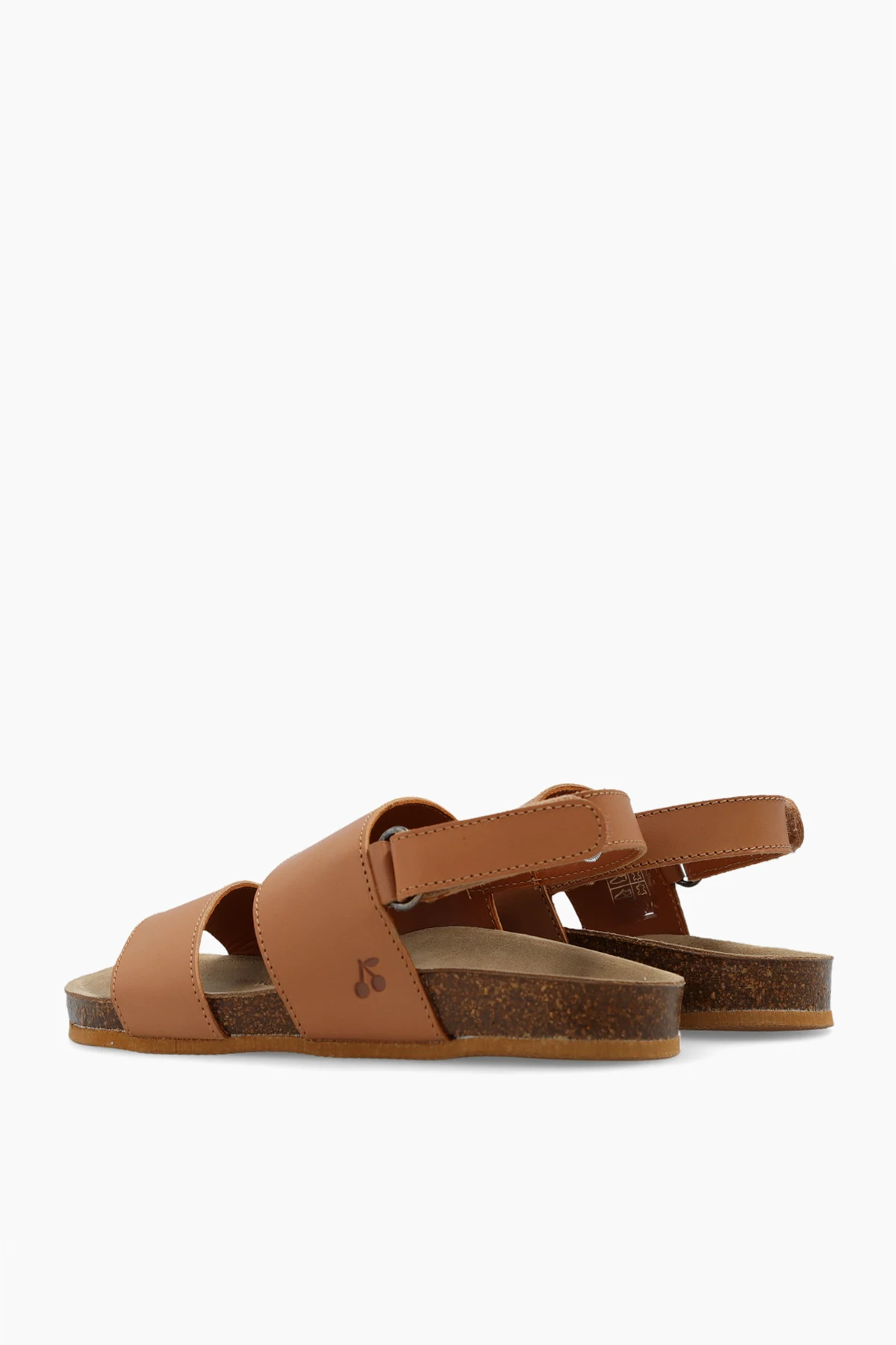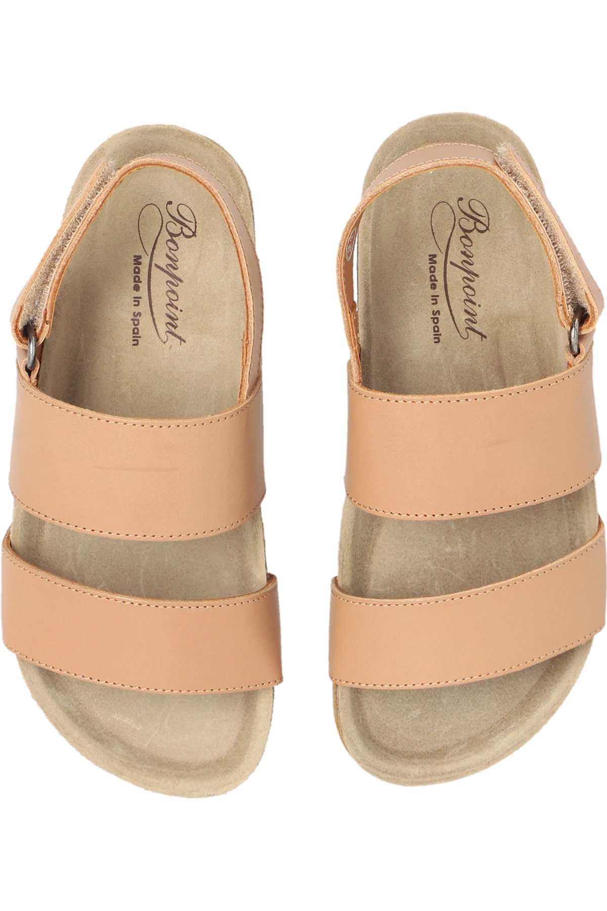 Beżowe sandały, model ‘Agostino’ Bonpoint. Wykonane ze skóry. Zapinane na rzep. Z boku wytłoczone logo. Podeszwa wykonana z korka i gumy w kolorze brązowym.