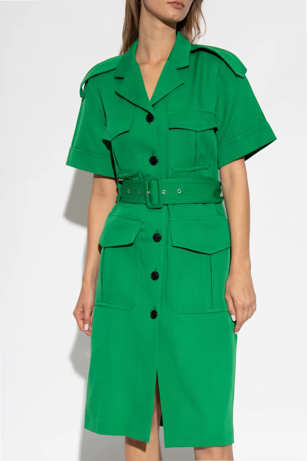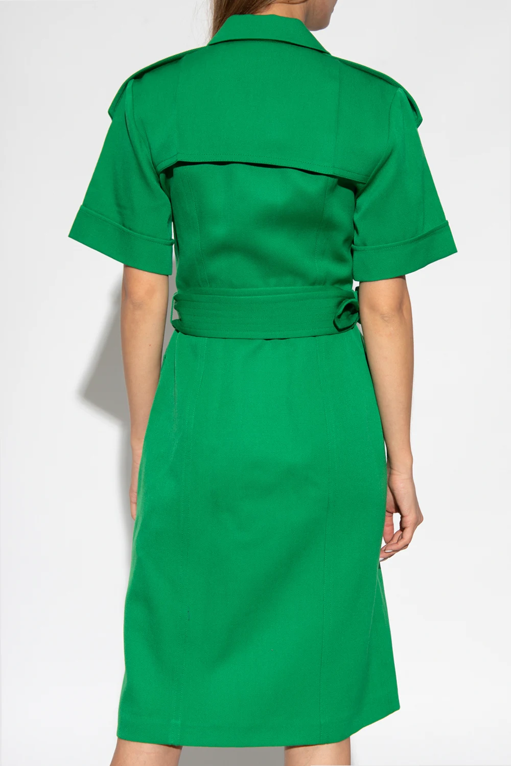 Zielona sukienka o dopasowanym kroju Victoria Beckham. Wykonana z wełny dziewiczej. Zapinana z przodu na guziki oraz dołączonym paskiem w talii. Na ramionach pagony. Kołnierz z otwartymi klapami. Cztery kieszenie z patkami. Krótkie, podwijane rękawy.