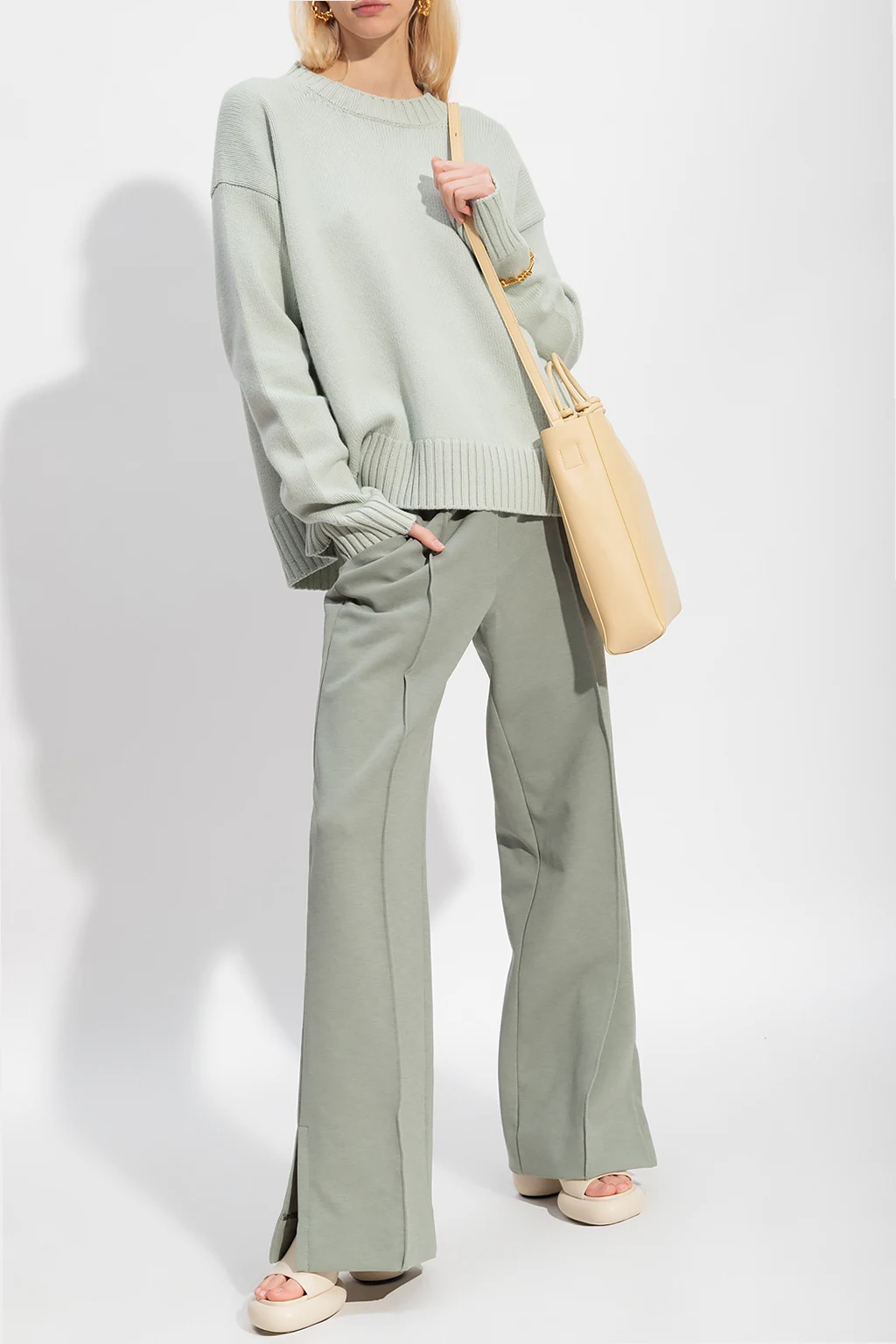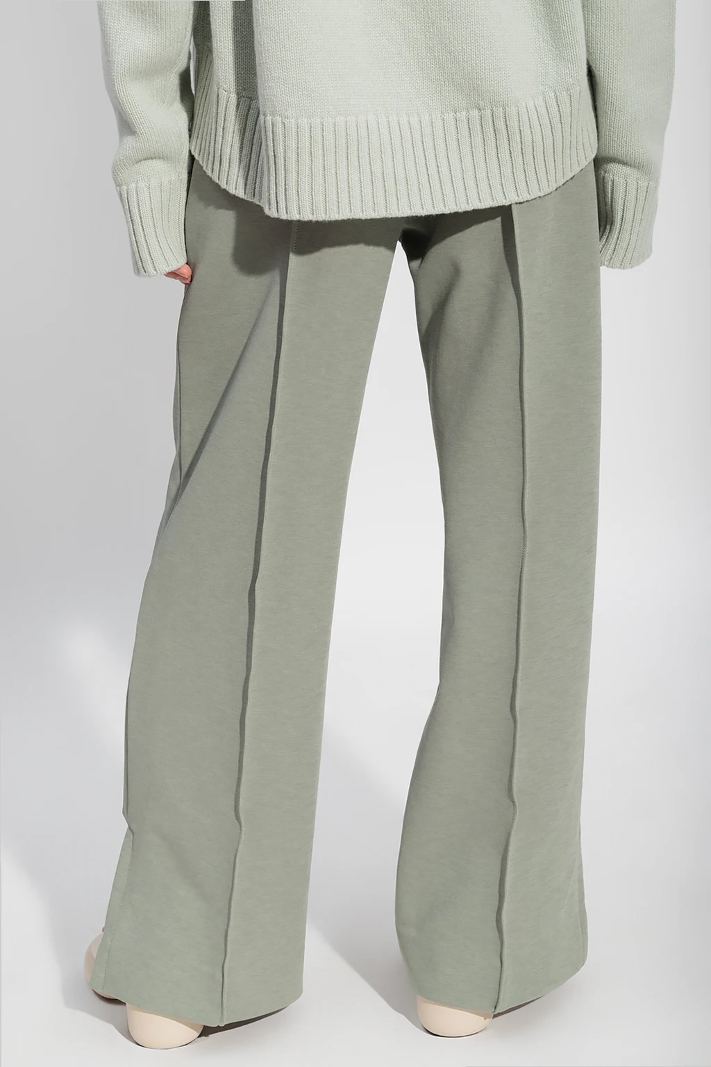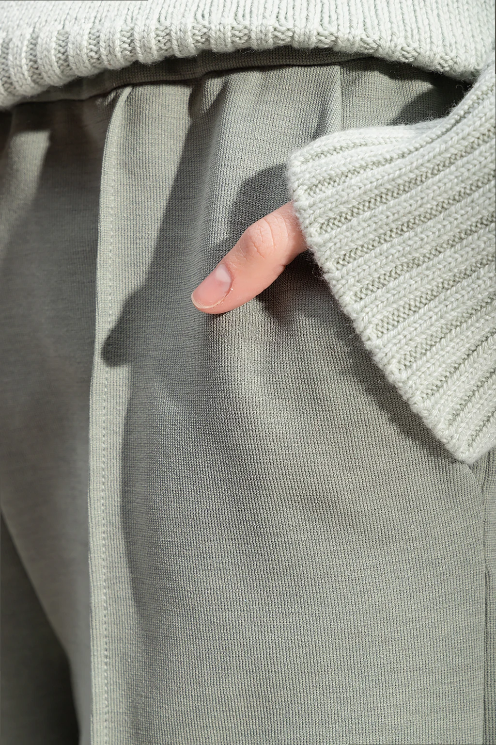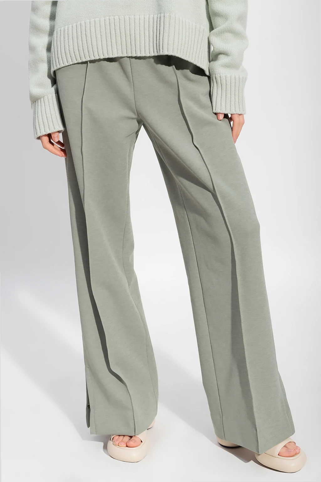 Zielonoszare spodnie Jil Sander. W pasie wszyta guma. Dekoracyjne przeszycia. Z przodu dwie wsuwane kieszenie. Długie, szerokie nogawki o prostym kroju.