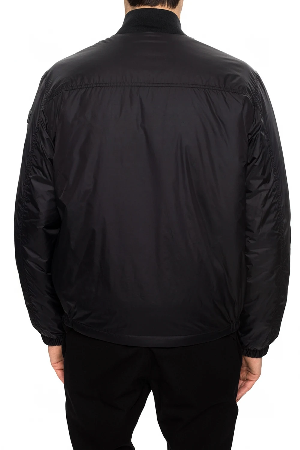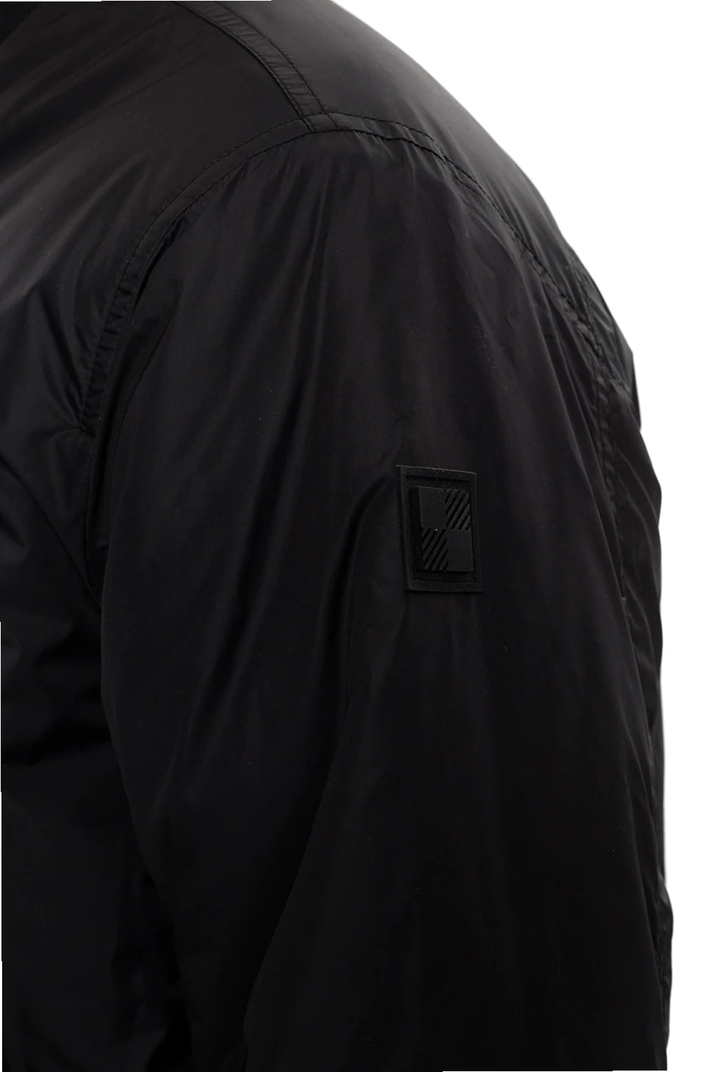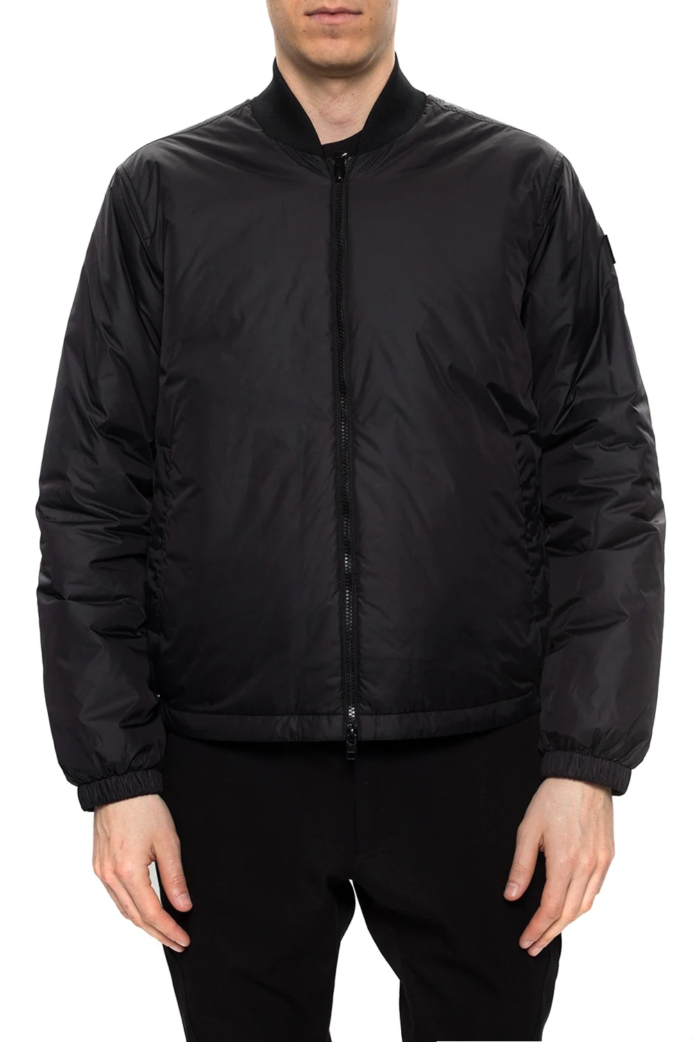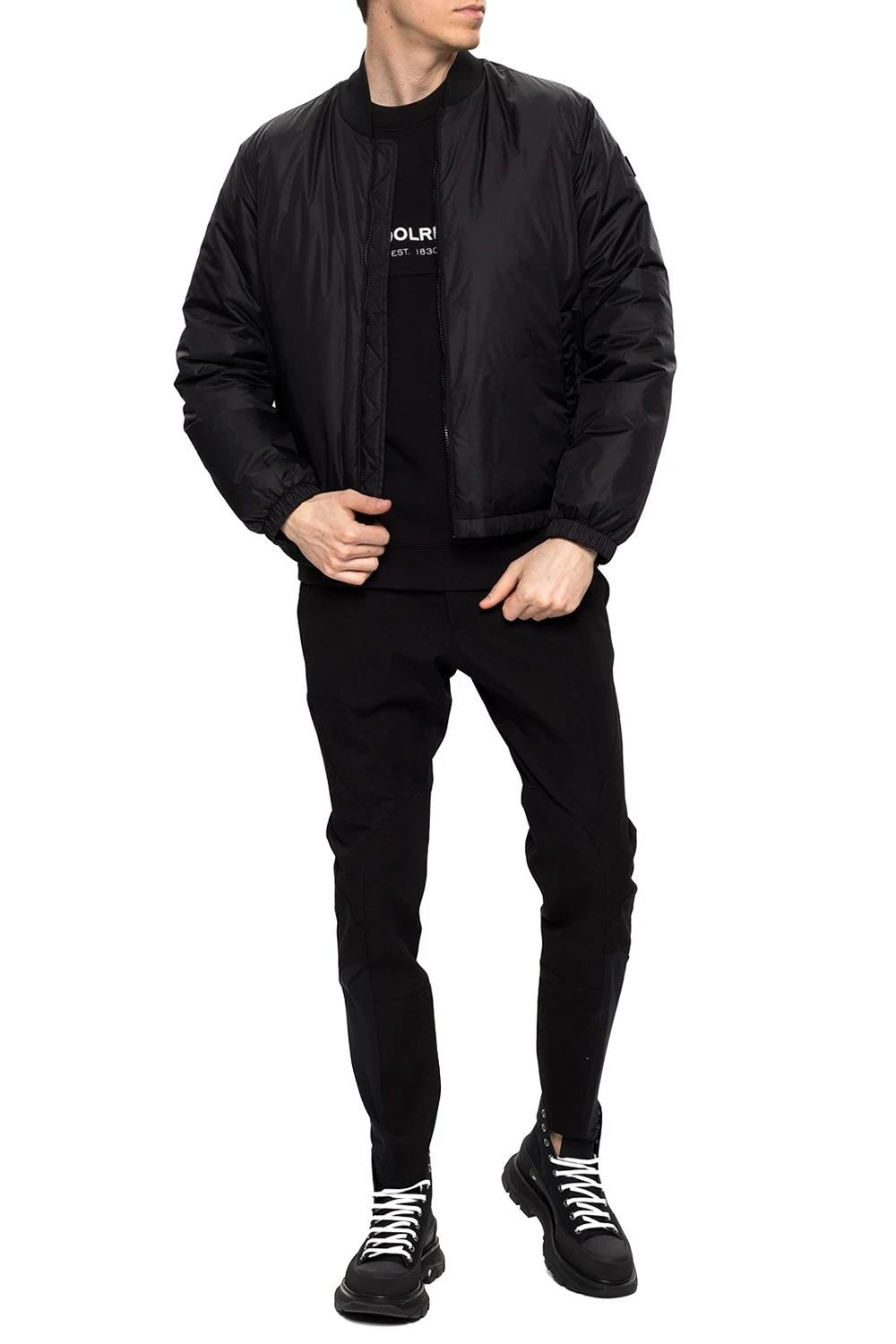 Czarna kurtka Woolrich. Zapinana na dwubiegunowy zamek. Ozdobiona aplikacją z logo. Z przodu dwie kieszenie zamykane na zatrzask. Dół i rękawy zakończone ściągaczami.