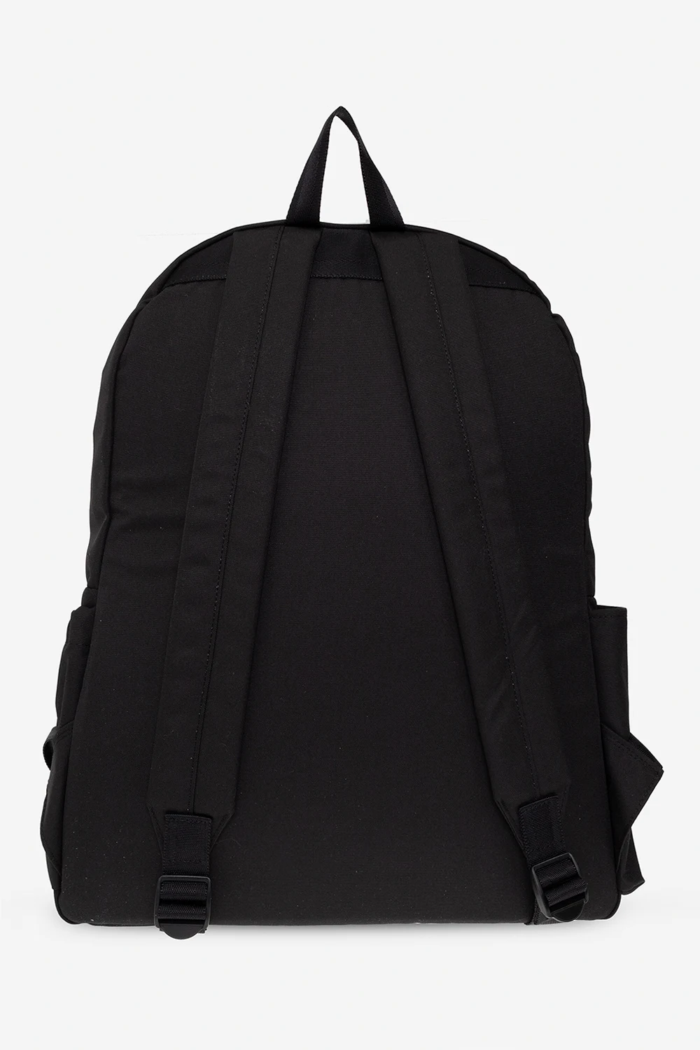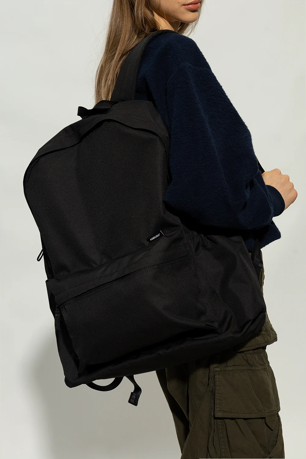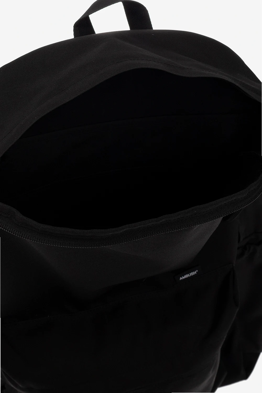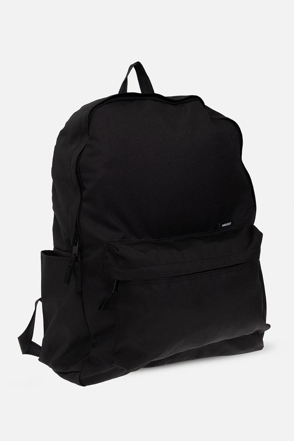 Czarny plecak Ambush. Zamykany na dwubiegunowy zamek. Z przodu kieszeń zamykana na zamek ozdobiona naszywką z logo. Po bokach wsuwana kieszeń. Półokrągła rączka. Szelki z możliwością regulacji długości. Wewnątrz komora z dwiema wsuwanymi kieszeniami. Metalowe elementy w kolorze czarnym.