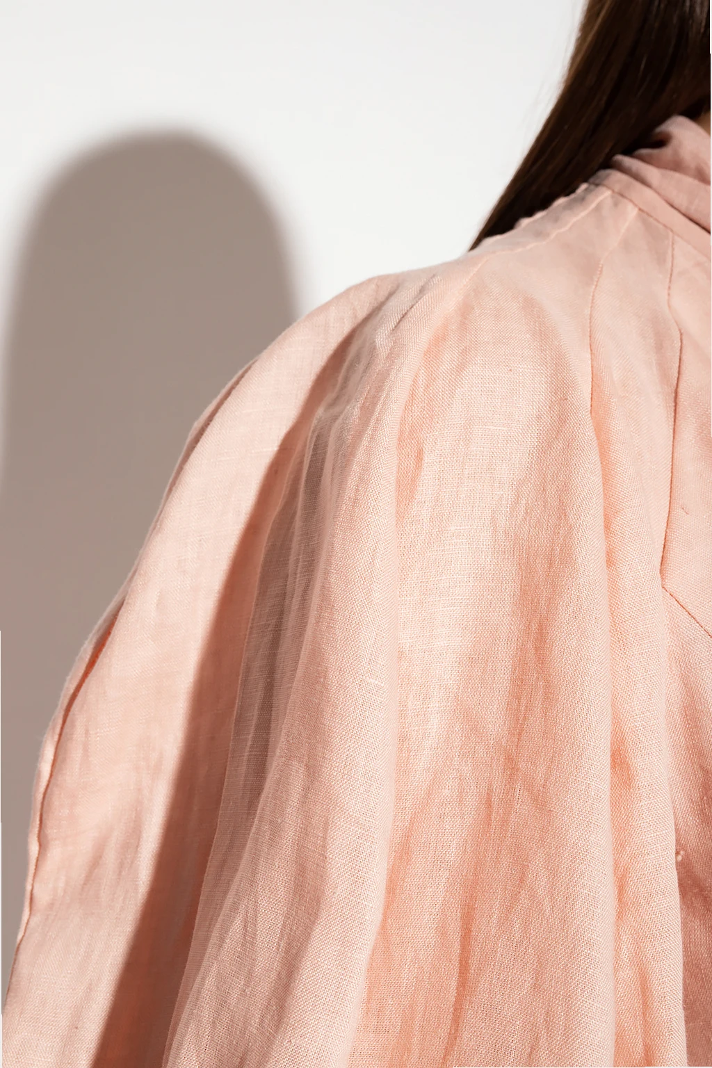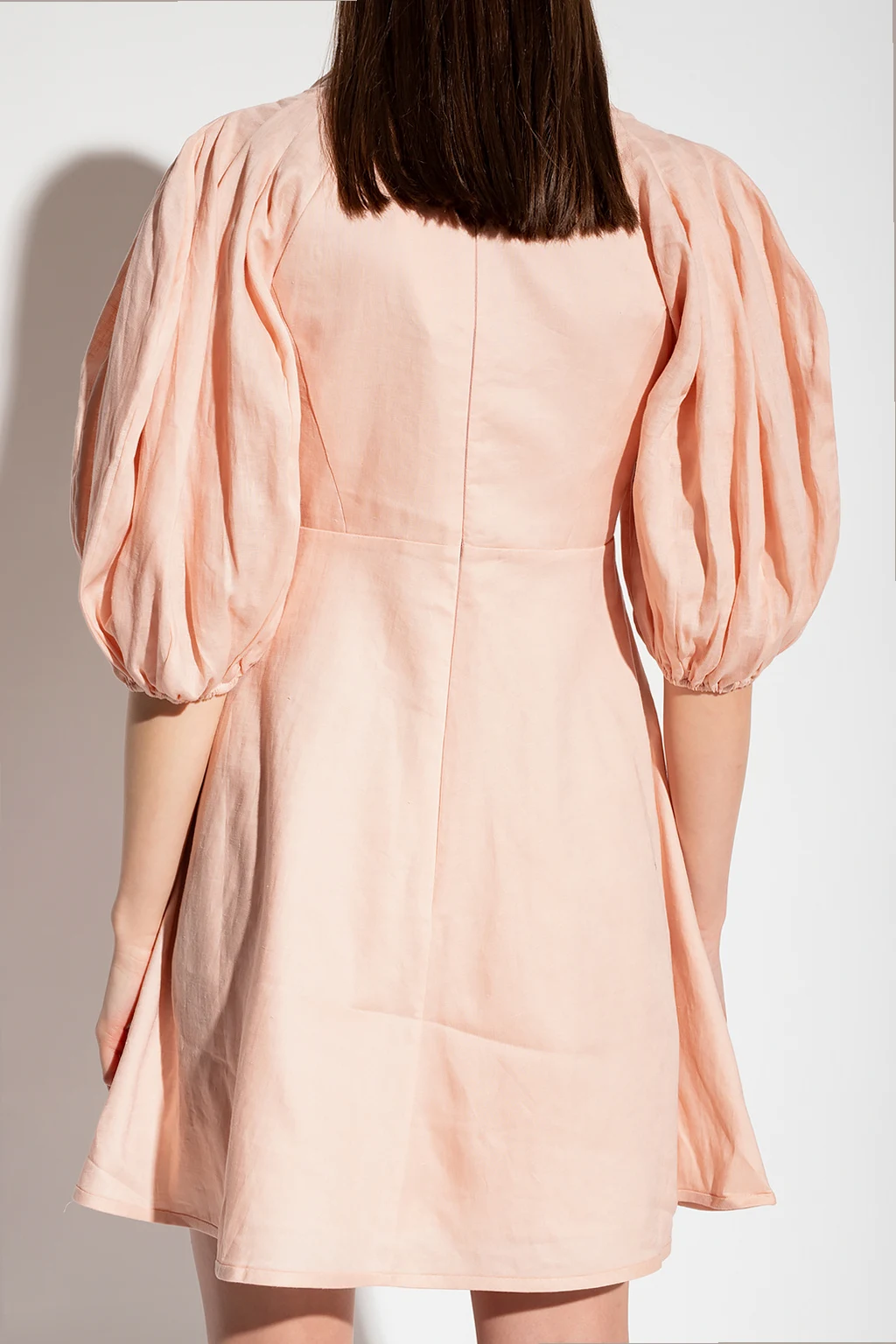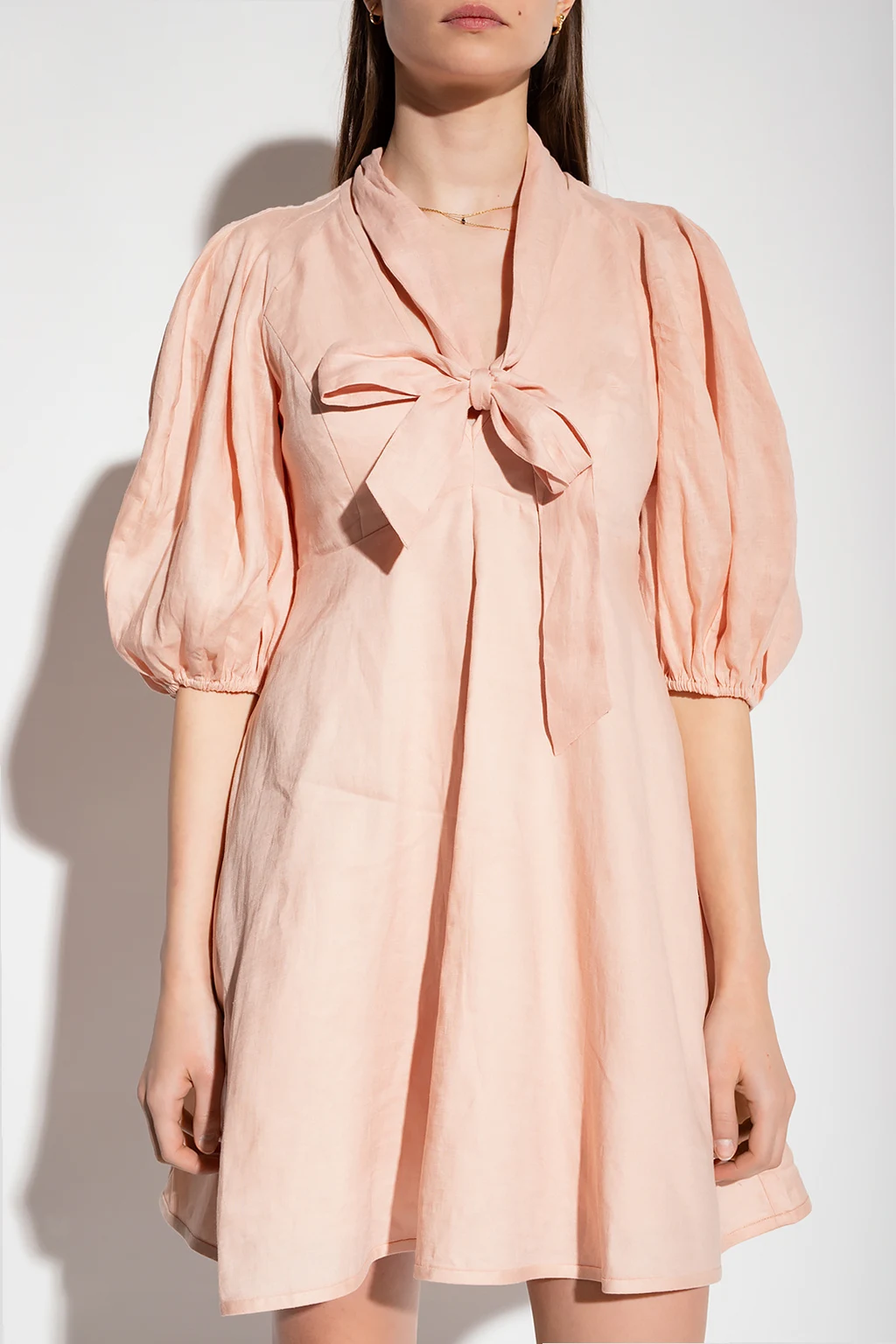 Jasnoróżowa sukienka mini Zimmermann, kolekcja ‘The Dancer’. Wykonana z mieszanki lnu i bawełny. Z tyłu zapinana na kryty zamek. Dekoracyjne wiązanie pod szyją. Dopasowana góra odcinana pod biustem, rozkloszowany dół. Dekolt w szpic. Bufiaste rękawy zakończone ściągaczem.