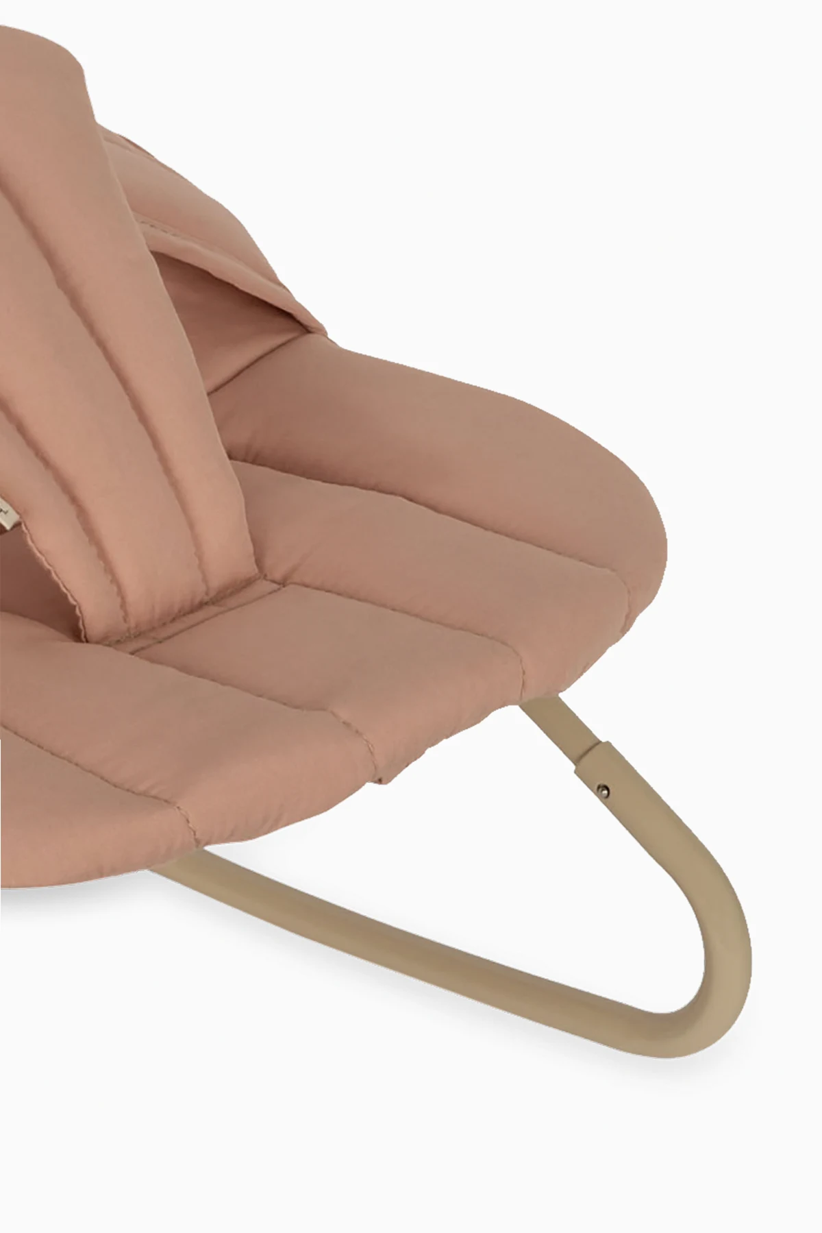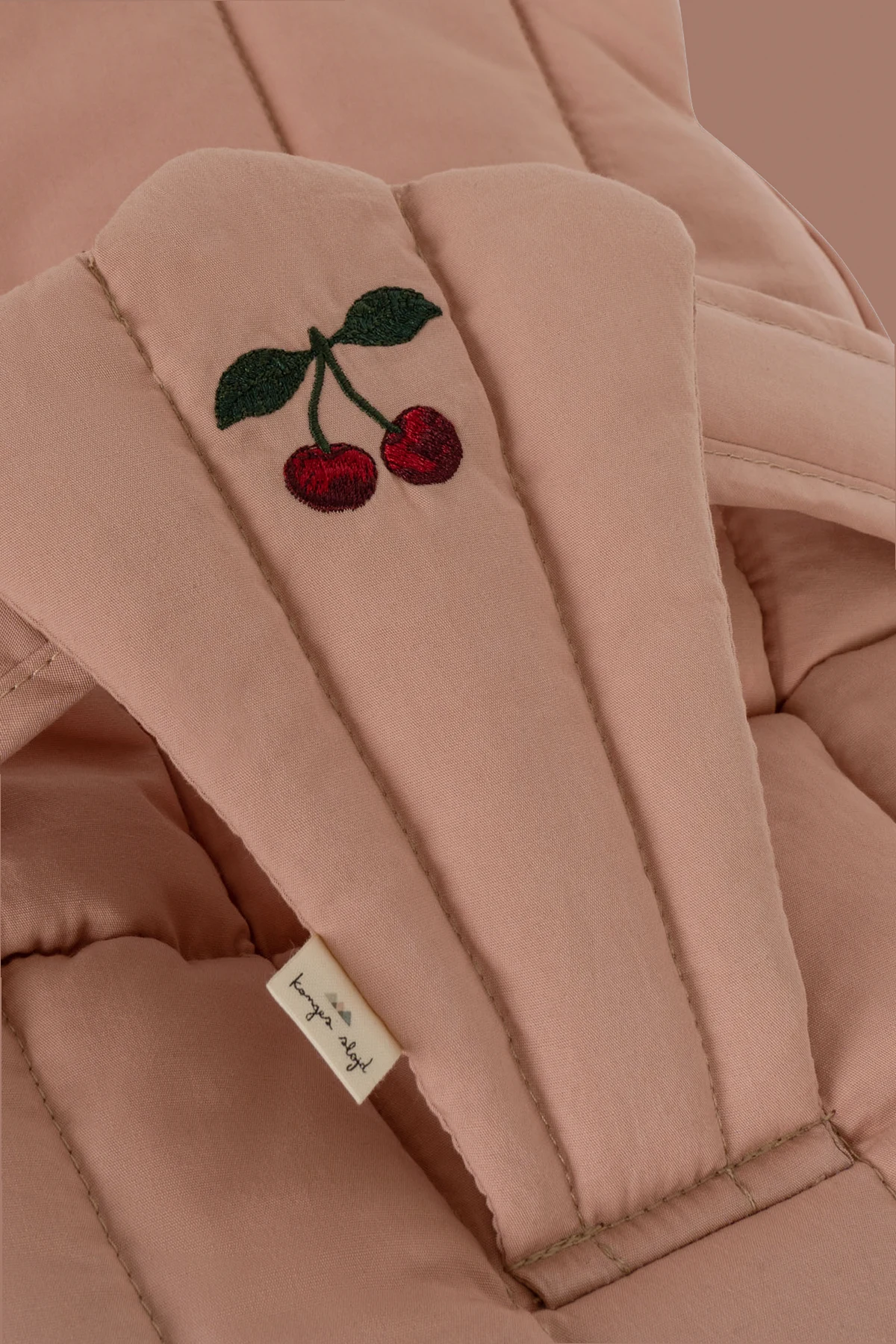 Różowy, zabawkowy bujak dla lalek Konges Slojd. Metalowa rama. Odpinane siedzisko wykonane z bawełny organicznej i ozdobione wyszytym motywem wiśni. Odpowiedni dla lalki o długości 40cm.