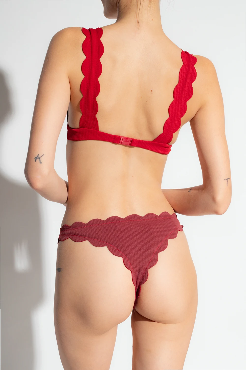 Dwustronny dół od kostiumu kąpielowego, model ‘North’ Marysia. Wykonany z elastycznej, teksturowanej tkaniny. Charakterystyczne, ręcznie wycinane brzegi. Z jednej strony czerwony. Z drugiej strony bordowy.